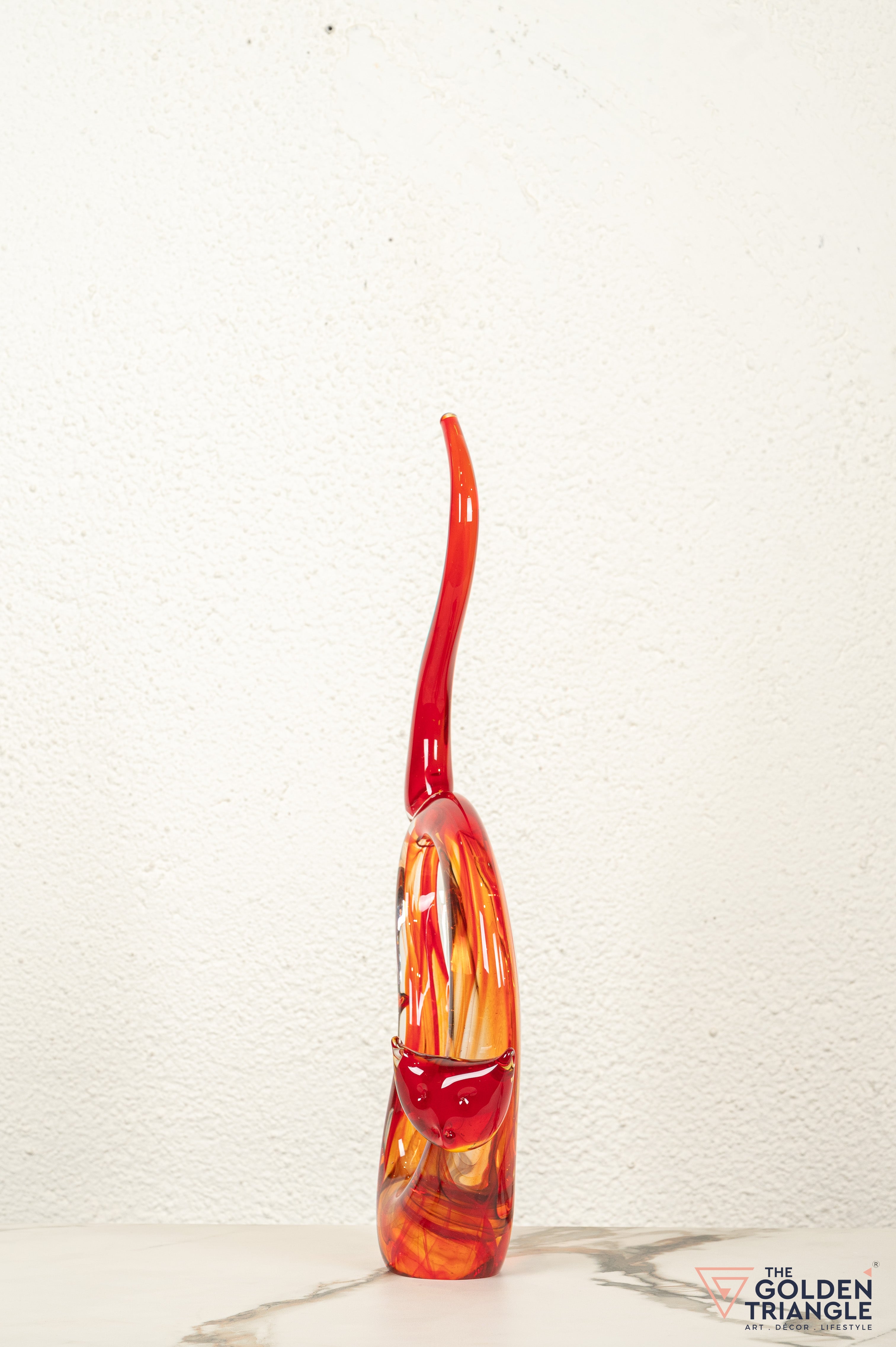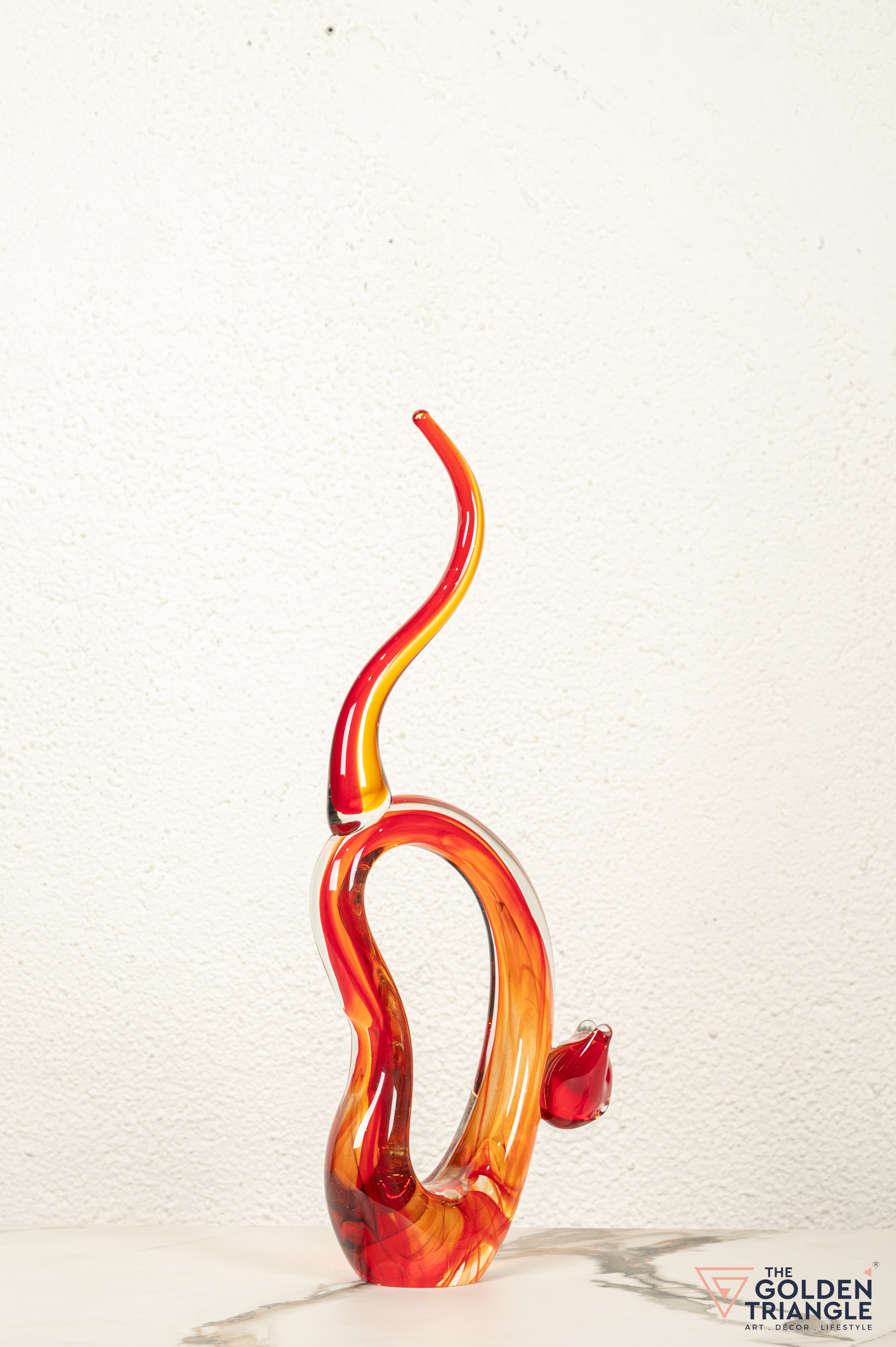 This captivating glass sculpture reimagines the feline form in a bold and dynamic style. Crafted from premium glass, the piece exudes a vibrant energy with its fiery red hue. The abstract form of the cat is both playful and powerful, with sinuous curves and dramatic gestures that capture the essence of feline grace and agility. The sculpture's intricate details, such as the textured fur and the flowing tail, showcase the artistry and craftsmanship involved in its creation.