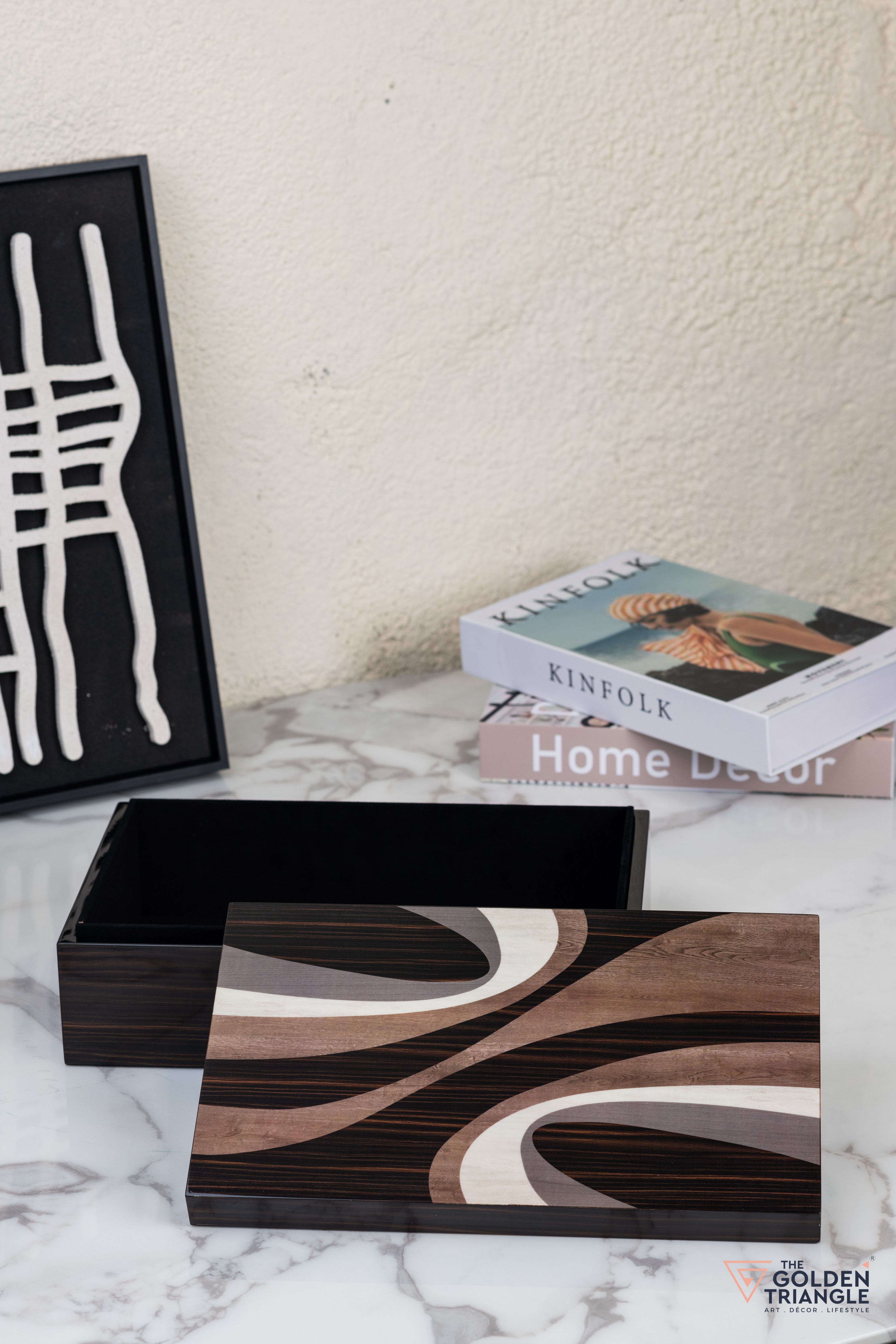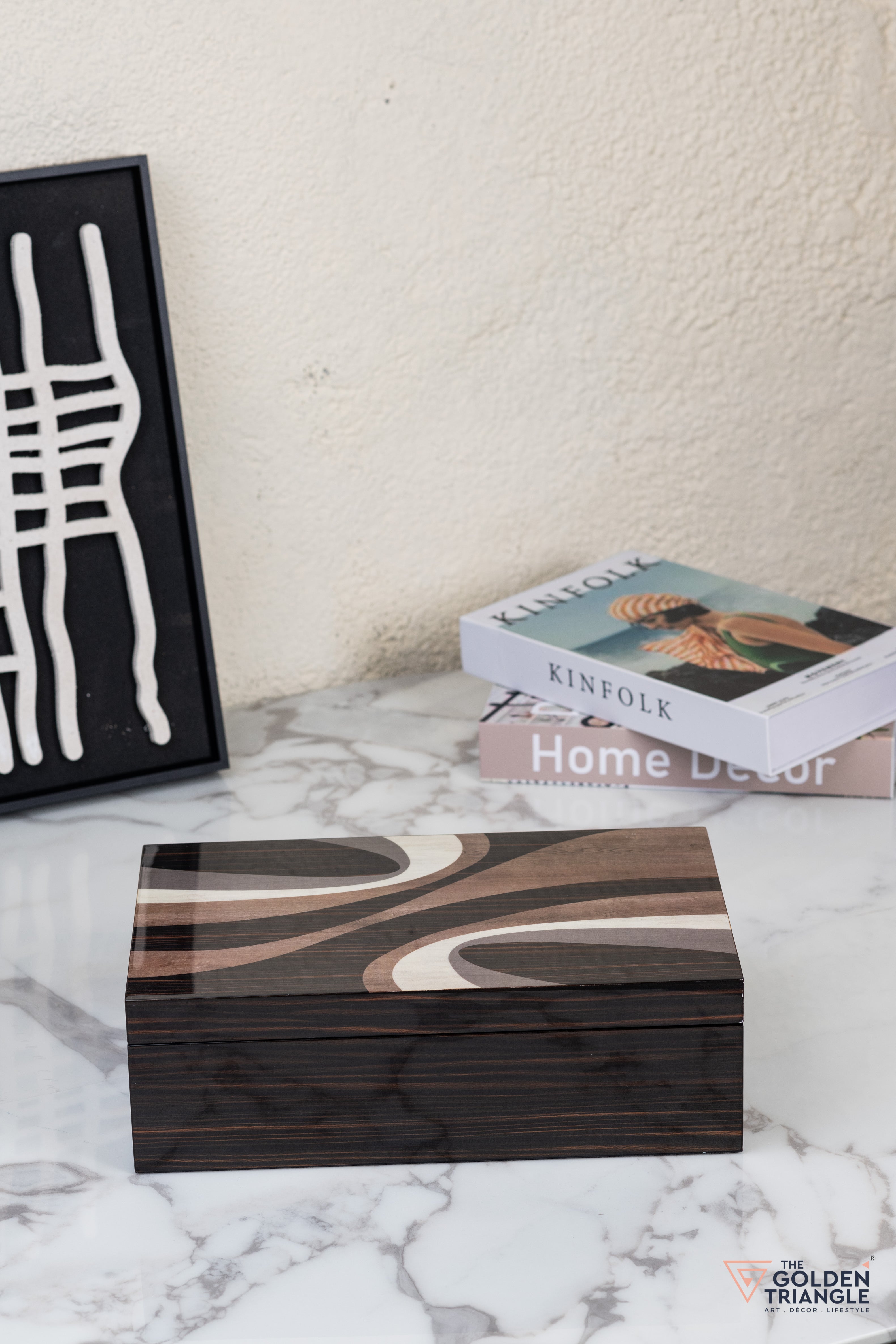 This stunning rectangle box, crafted from high-quality MDF and finished in a luxurious piano lacquer, adds a touch of sophistication to any space. Its intricate geometric pattern, featuring vibrant hues of beige, brown, and blue, creates a visually striking piece. Perfect for storing jewellry, keepsakes, or other small treasures, this versatile box is both functional and stylish. Add a touch of elegance to your living room, bedroom, or office with this exquisite home decor accessory.