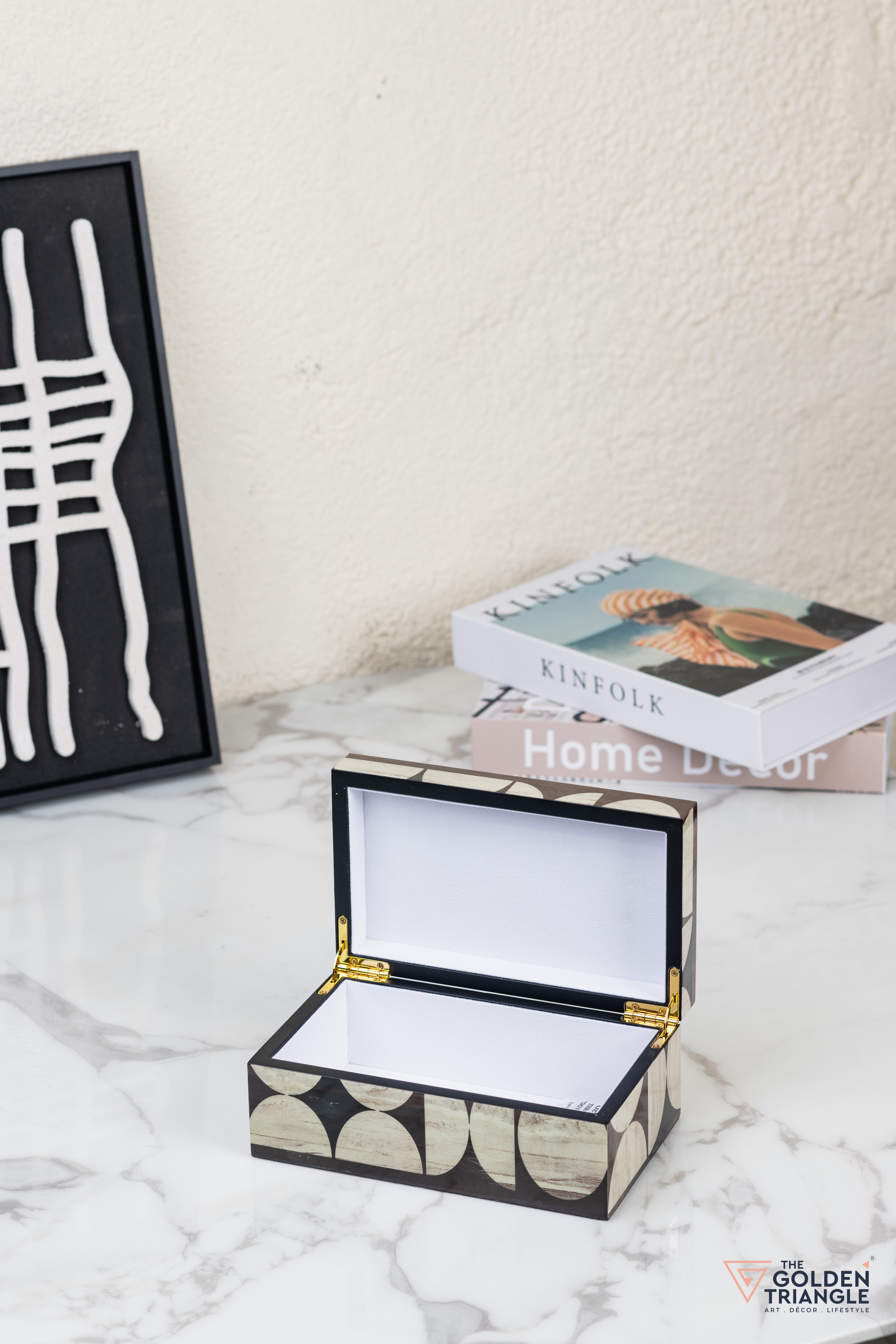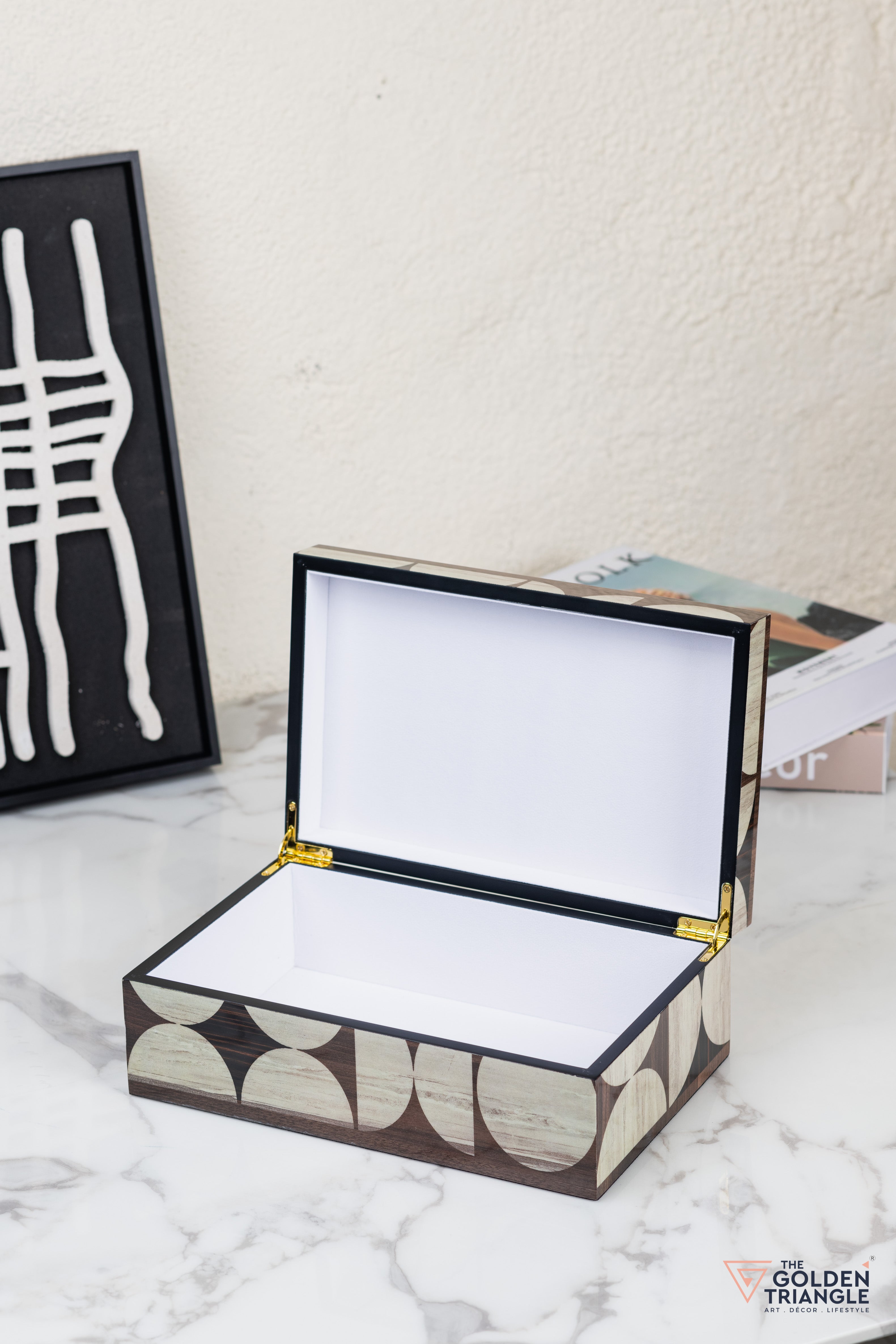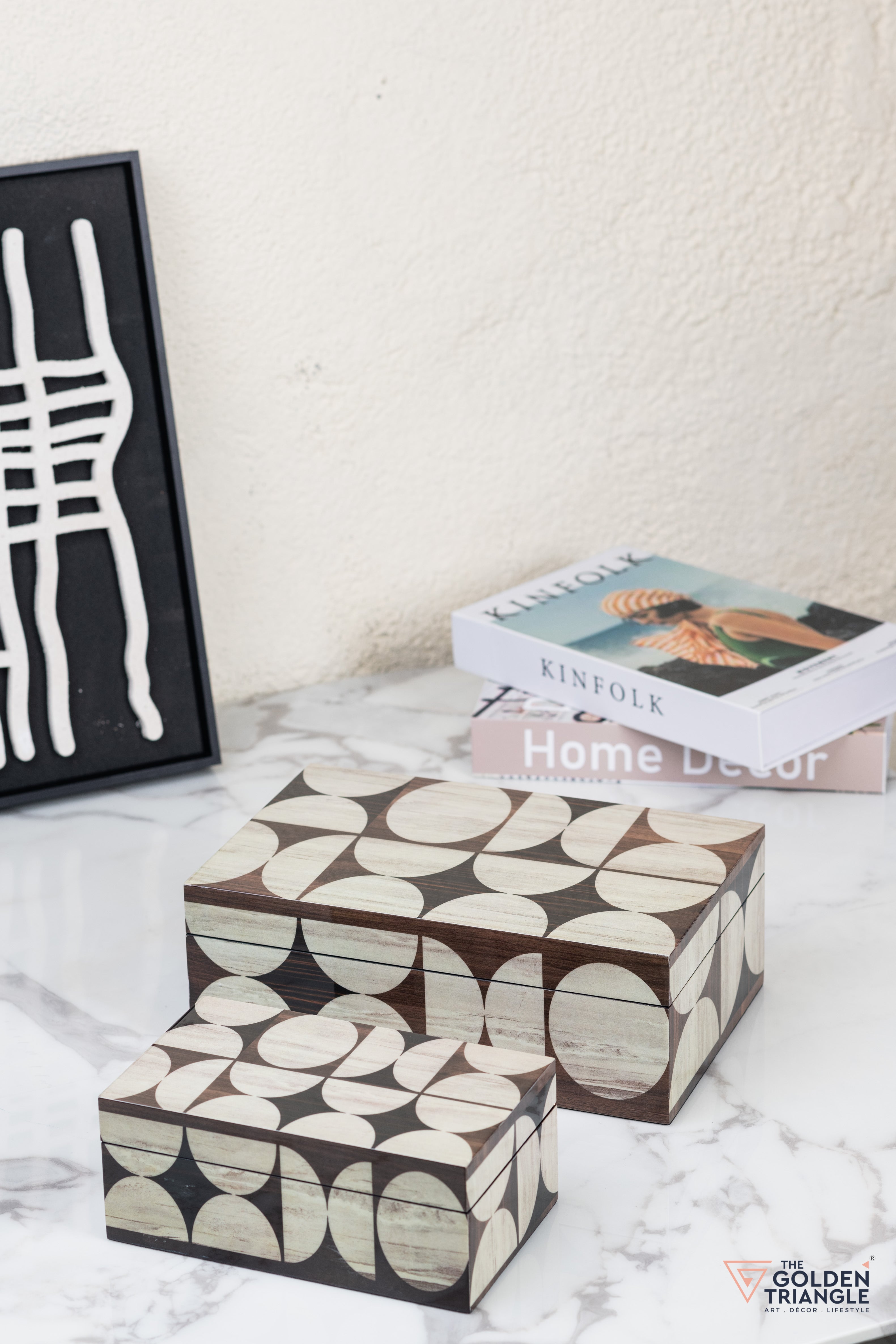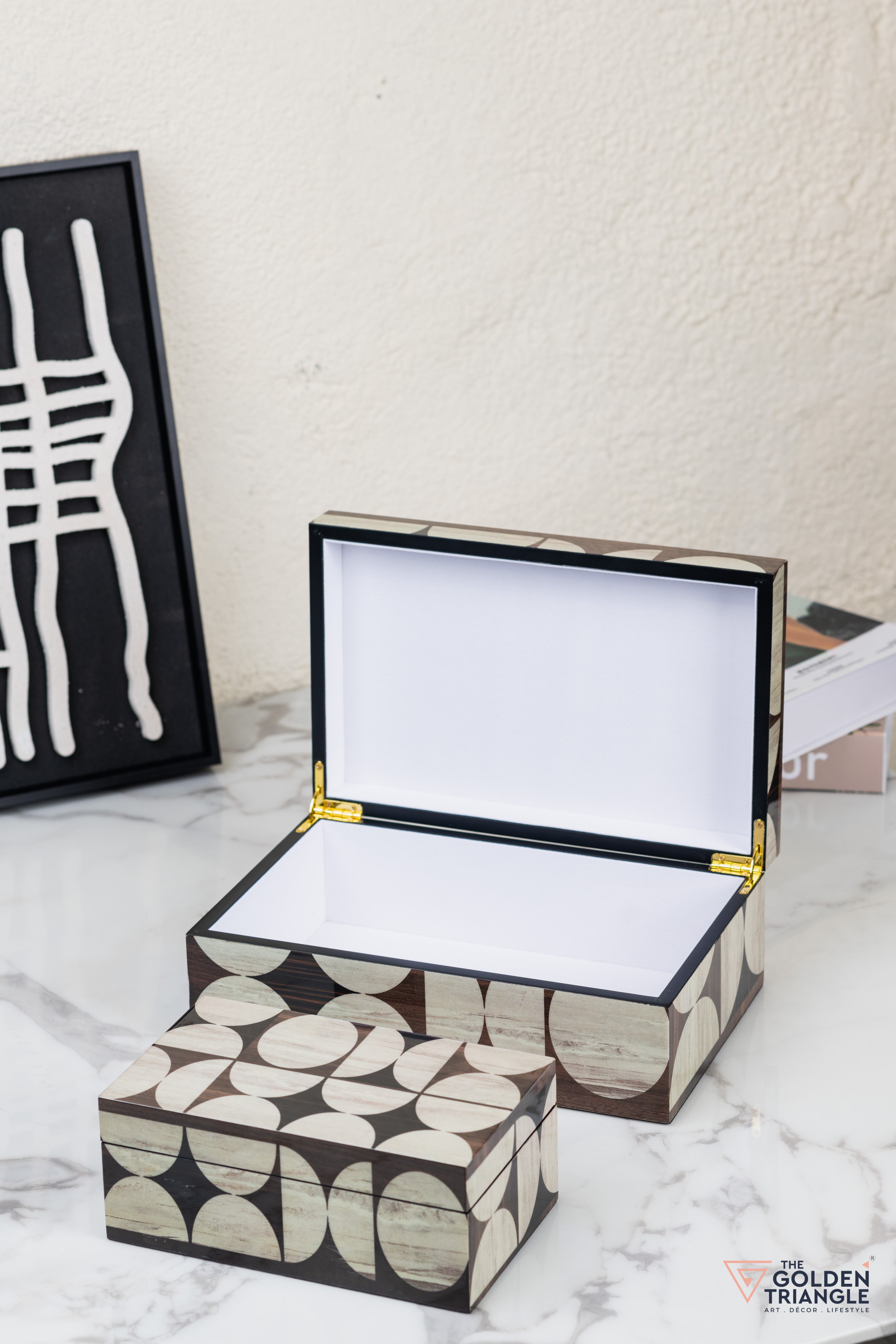 Elevate your home decor with this stylish geometric storage boxes. Crafted from high-quality MDF and finished in a luxurious piano lacquer, these boxes feature a captivating black and white pattern. Perfect for storing jewellery, keepsakes, or other small items, this versatile set adds a touch of sophistication to any room. Display them together or separately to create a stunning centerpiece.