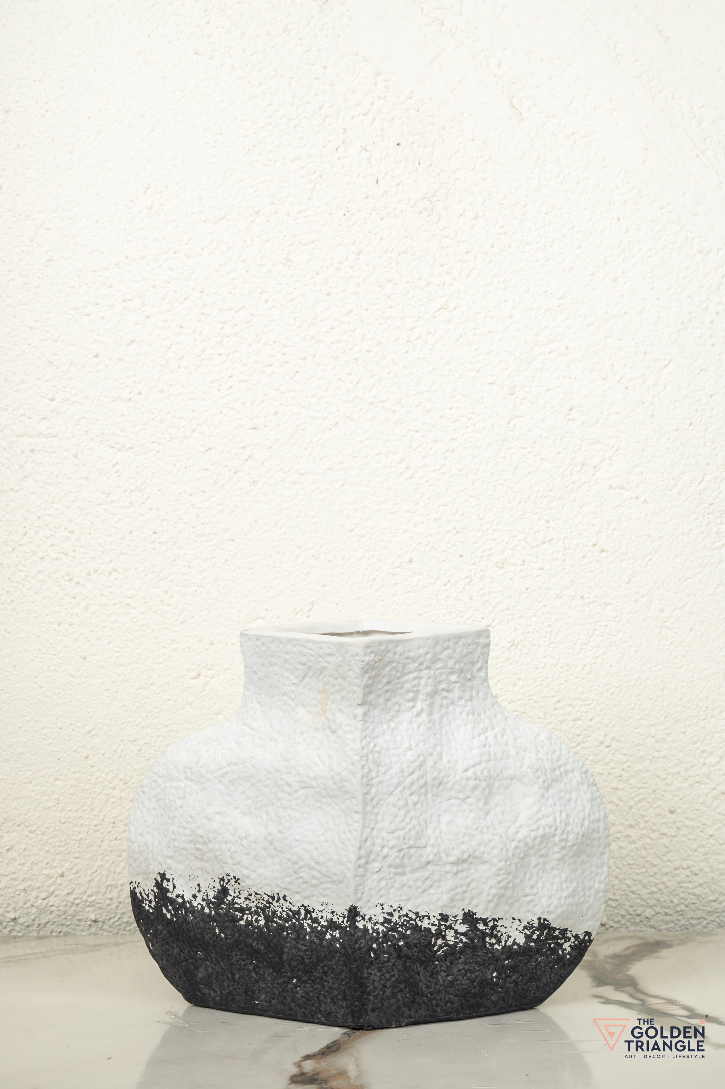 Discover the beauty of this handcrafted ceramic vase, featuring a striking contrast of smooth white and textured black. Its unique design and organic shape create a captivating focal point. Perfect for showcasing fresh flowers or as a standalone decorative piece, this versatile vase is a must-have for home decor enthusiasts seeking a one-of-a-kind statement piece.