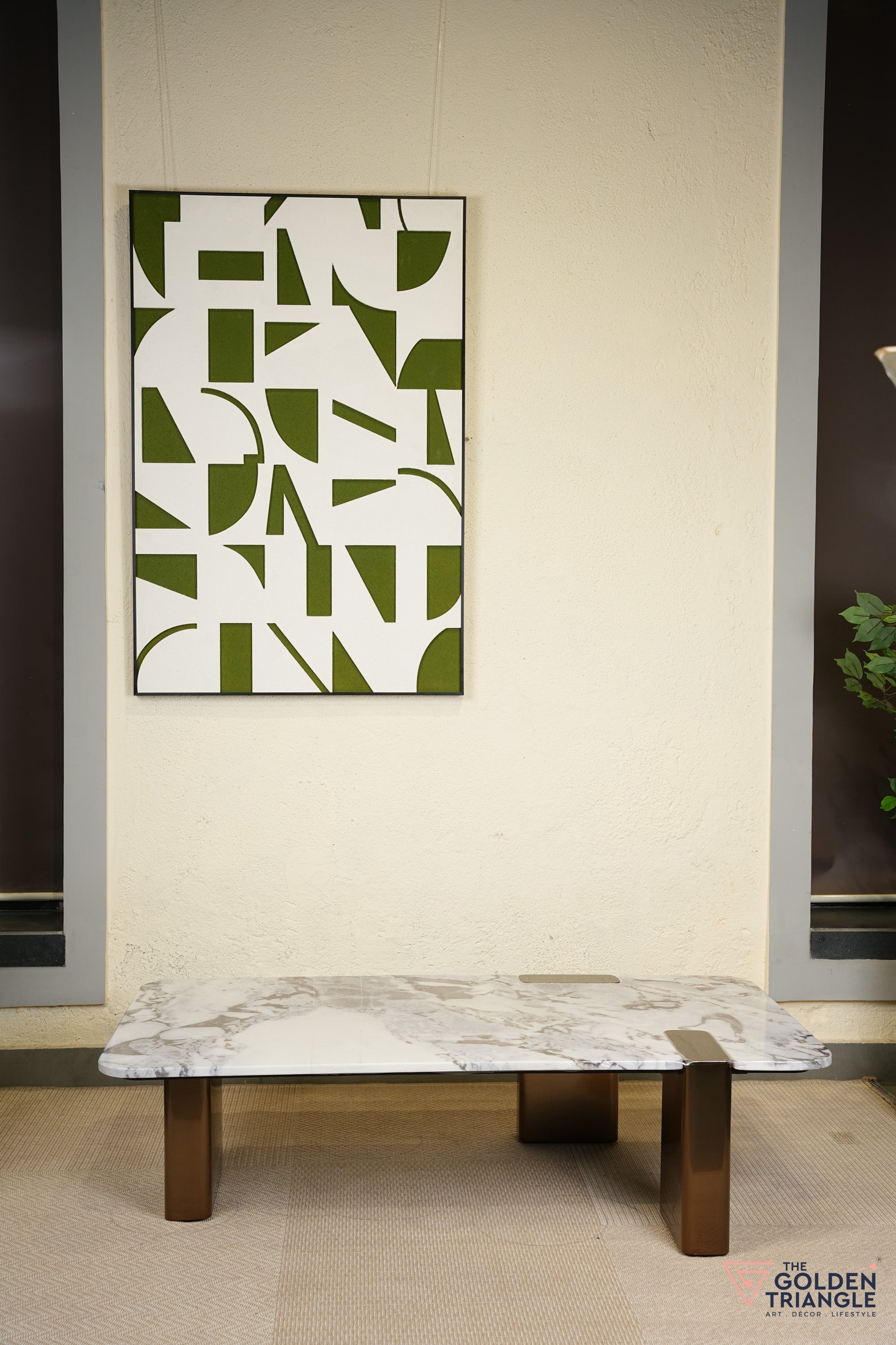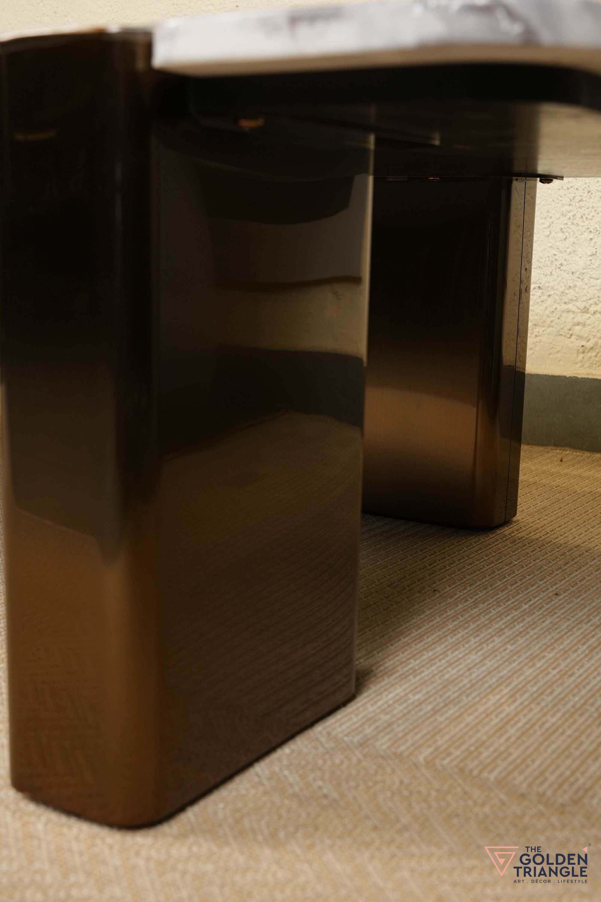This modern coffee table showcases a unique sculptural design with a sleek white marble top featuring natural veining. The bold base, crafted from brushed metal, includes a striking spherical accent, creating a perfect blend of artistry and function. Ideal for elevating contemporary living space.