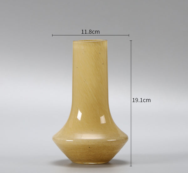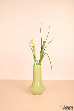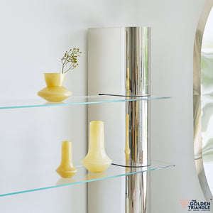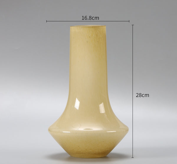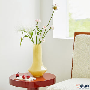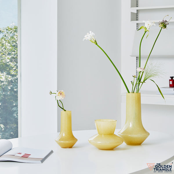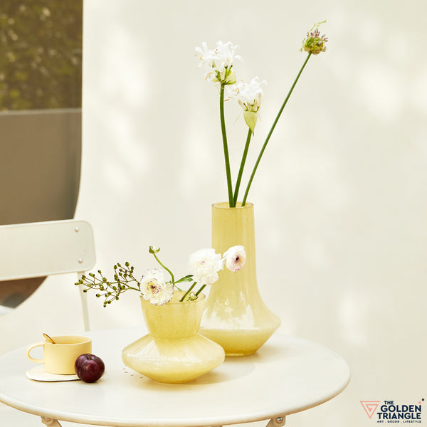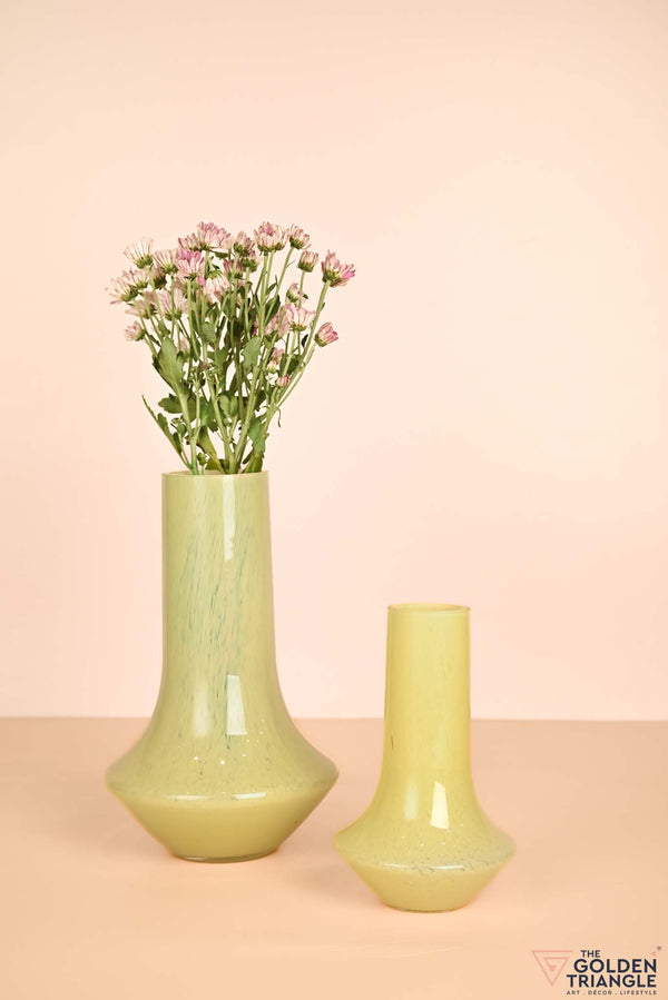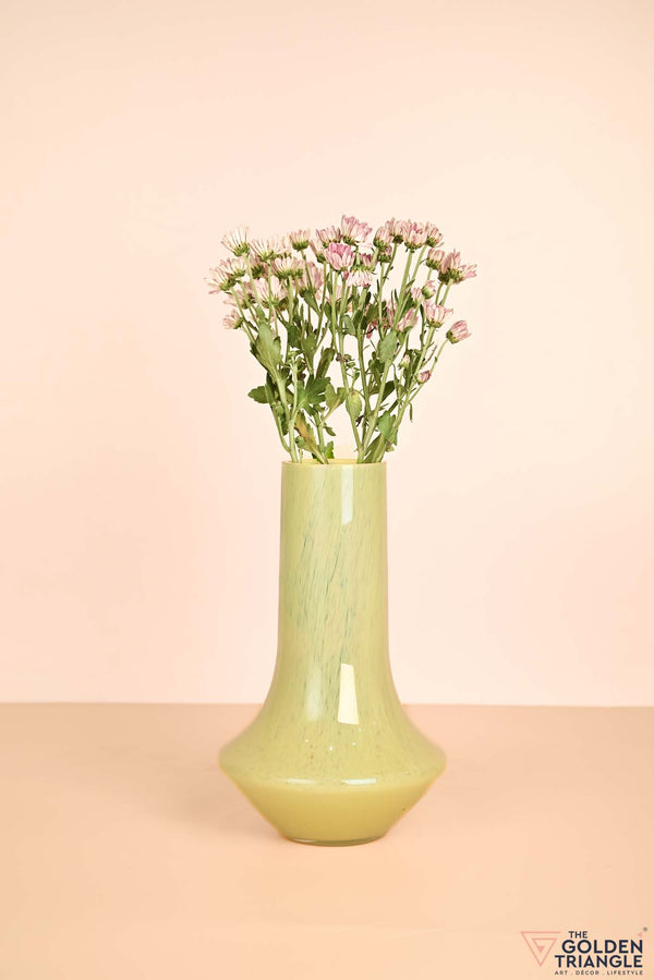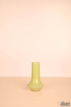 This cylindrical glass vase with a tapered base and slightly wider opening has a soft pastel yellow colour giving it warm and inviting appearance. The vase can be used top hold flowers, or can be used as a standalone piece to add elegance to any space. Its simple yet Stylish design makes it suitable for a range of home decor styles including modern and contemporary.