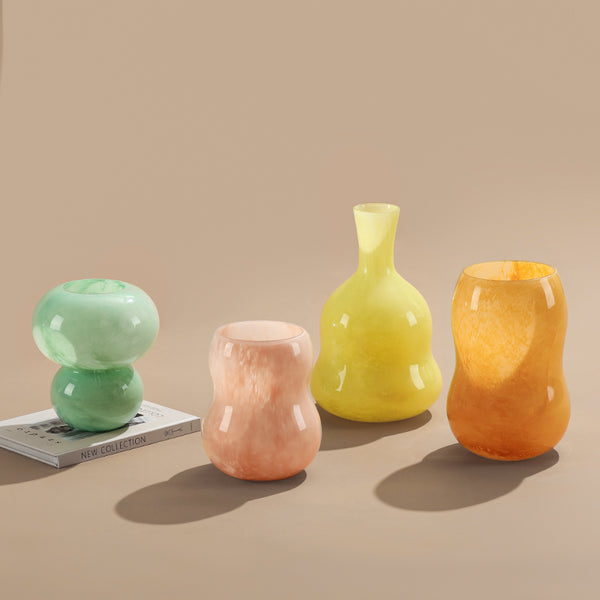 This pastel glass vase in an organic shape is a decorative vase made with soft, muted colour palette and natural and asymmetrical form. It is designed with gentle curves and irregular edges, giving it an organic and handcrafted feeling. The soft pastel colour creates a subtle, calming effect that be used to hold beautiful flowers or other decorative items to add a touch of whimsy and charm to your living room, bedroom or office. The organic shape and pastel colour makes it a popular choice for those who prefer a more relaxed and natural aesthetic in their home decor.