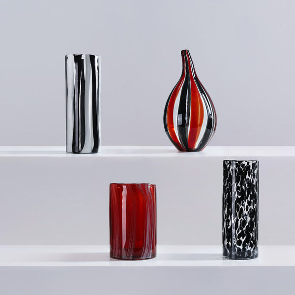 This cylindrical transparent glass vase with a playful pattern of black and red stripes, is perfect for those who want to add a subtle pop of pattern and visual interest to their home décor. The vase has cylinder shape creating a sense of softness and elegance. The small opening of the vase is ideal for holding a single stem or small bouquet of flower. The transparency of the glass allows the beauty of the flowers to shine through, while the black and white stripes adds a touch whimsy and playfulness to the overall design. It makes for a stunning piece for your living room, bedroom or office.
