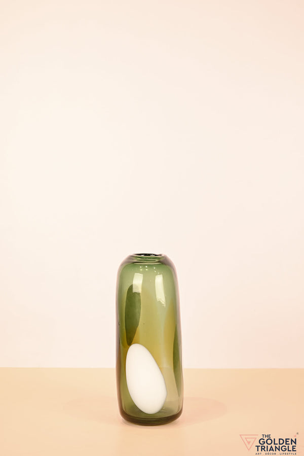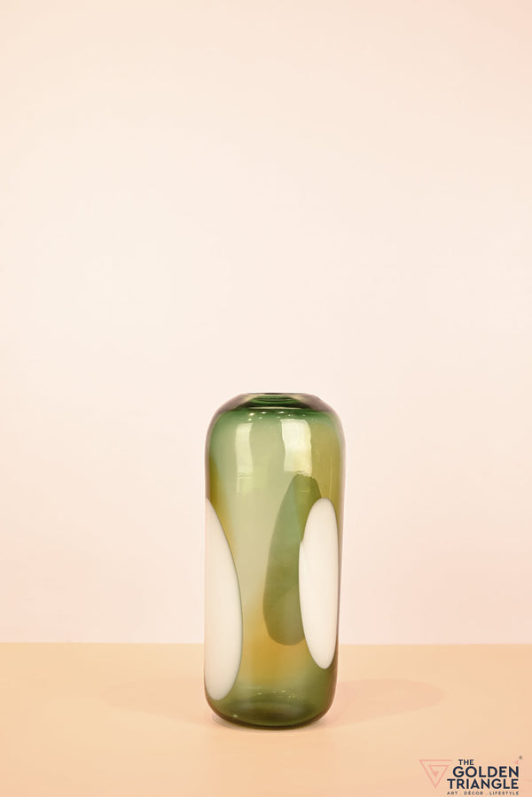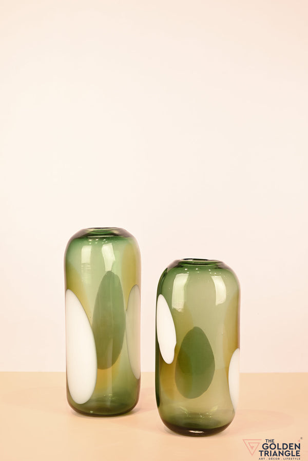 Introducing our tall green glass vase embellished with white circular accents. Elevate your décor with this striking piece, perfect for displaying flowers or as a standalone statement.Shop now to add elegance and style to your home décor
