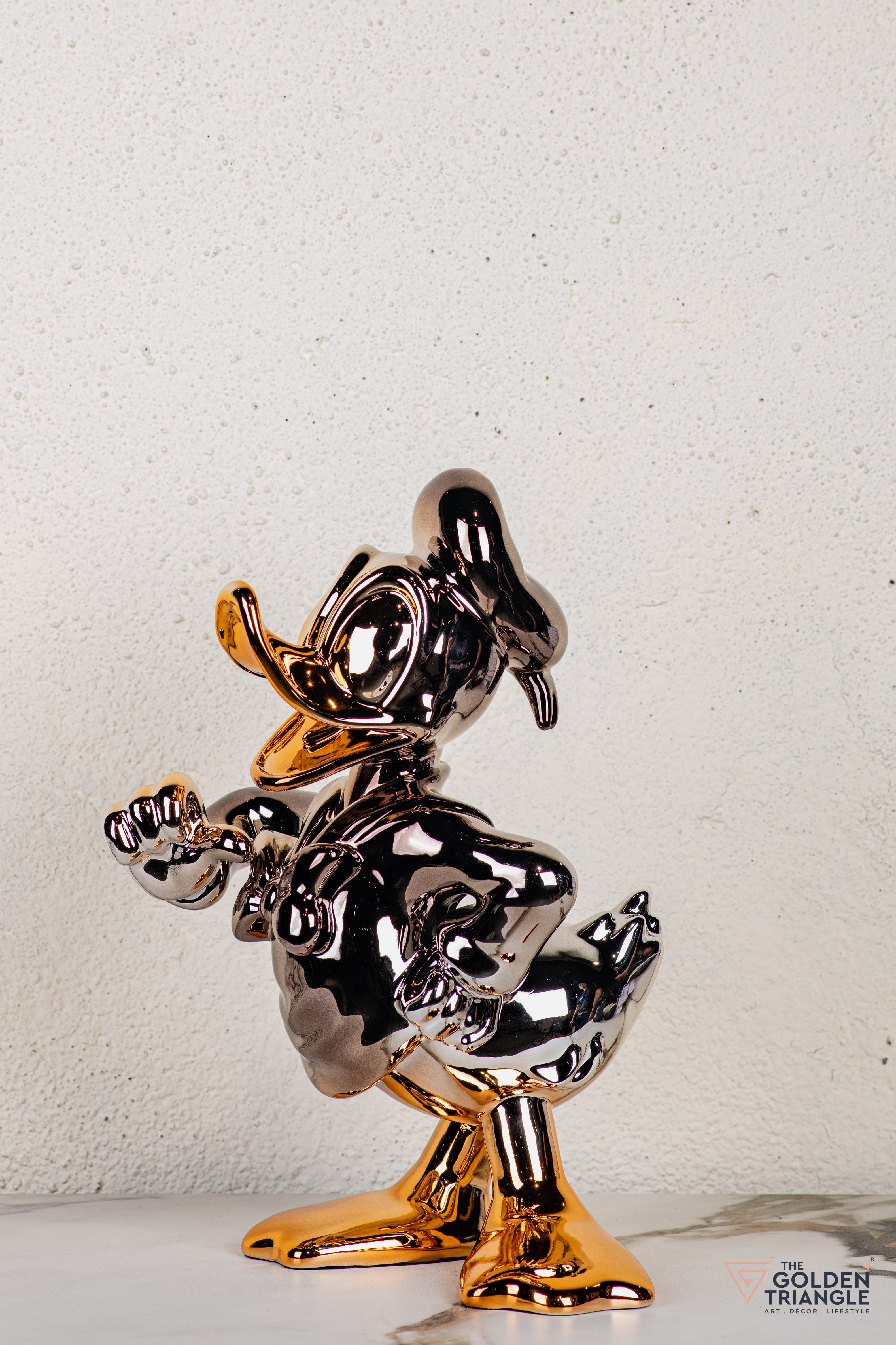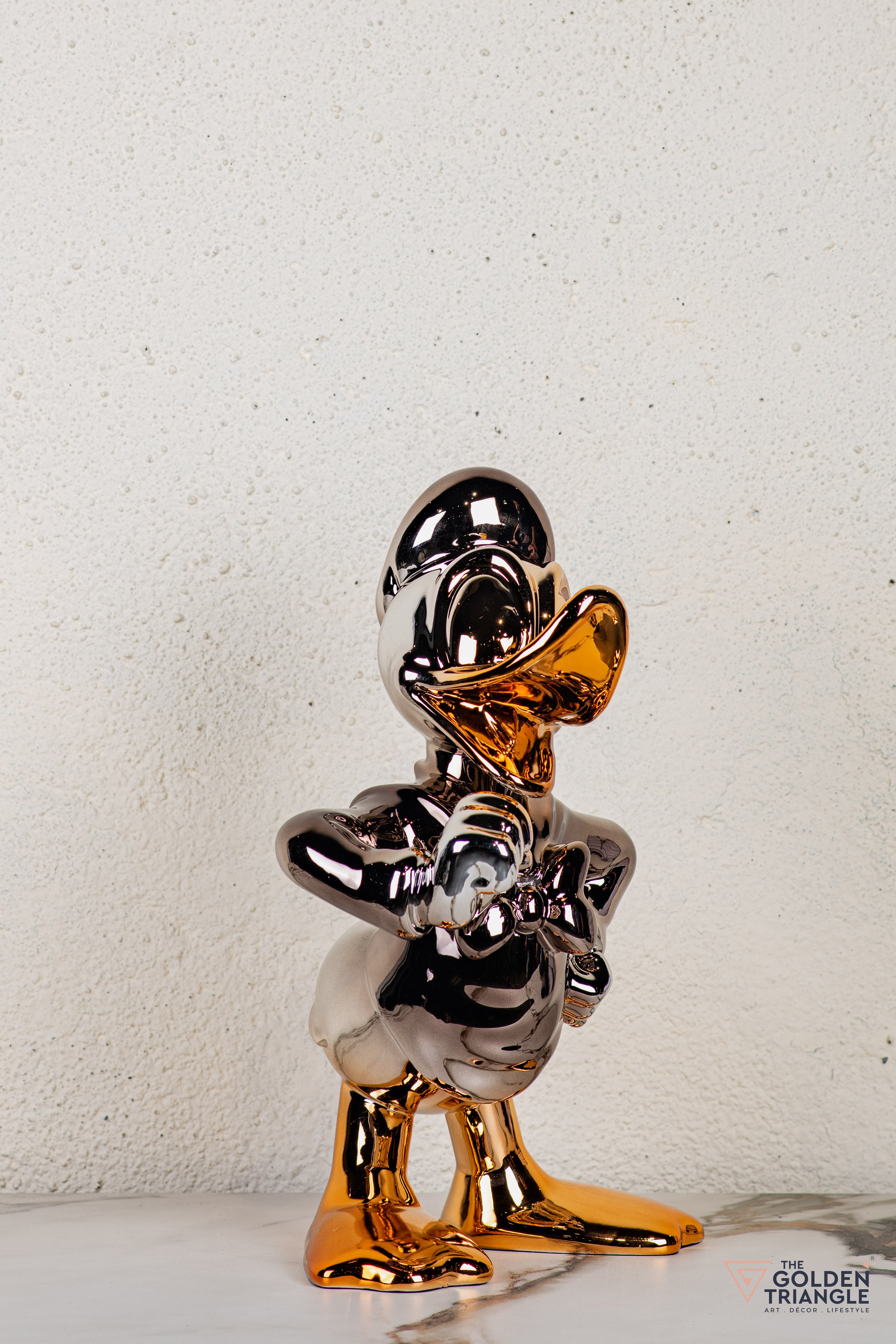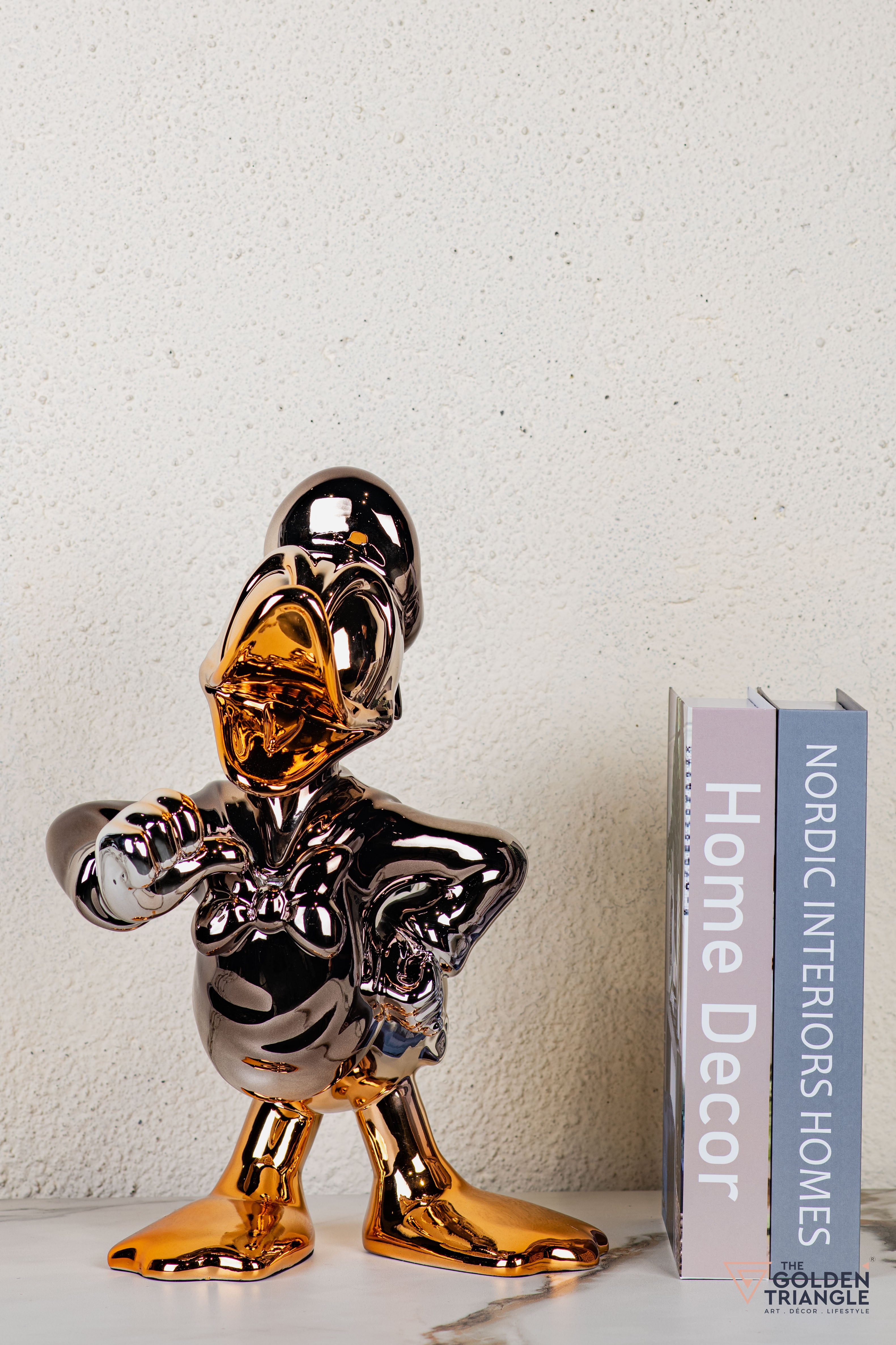 Discover unparalleled sophistication with our donald duck abstract sculpture, a masterpiece destined to elevate your home décor. This sculpture boasts an alluring electroplated finish. Its avant garde design adds a touch of modernity and elegance to any living space, captivating the eye. Crafted with precision and attention to detail, this sculpture is the epitome of luxury, seamlessly blending contemporary aesthetics with timeless charm.