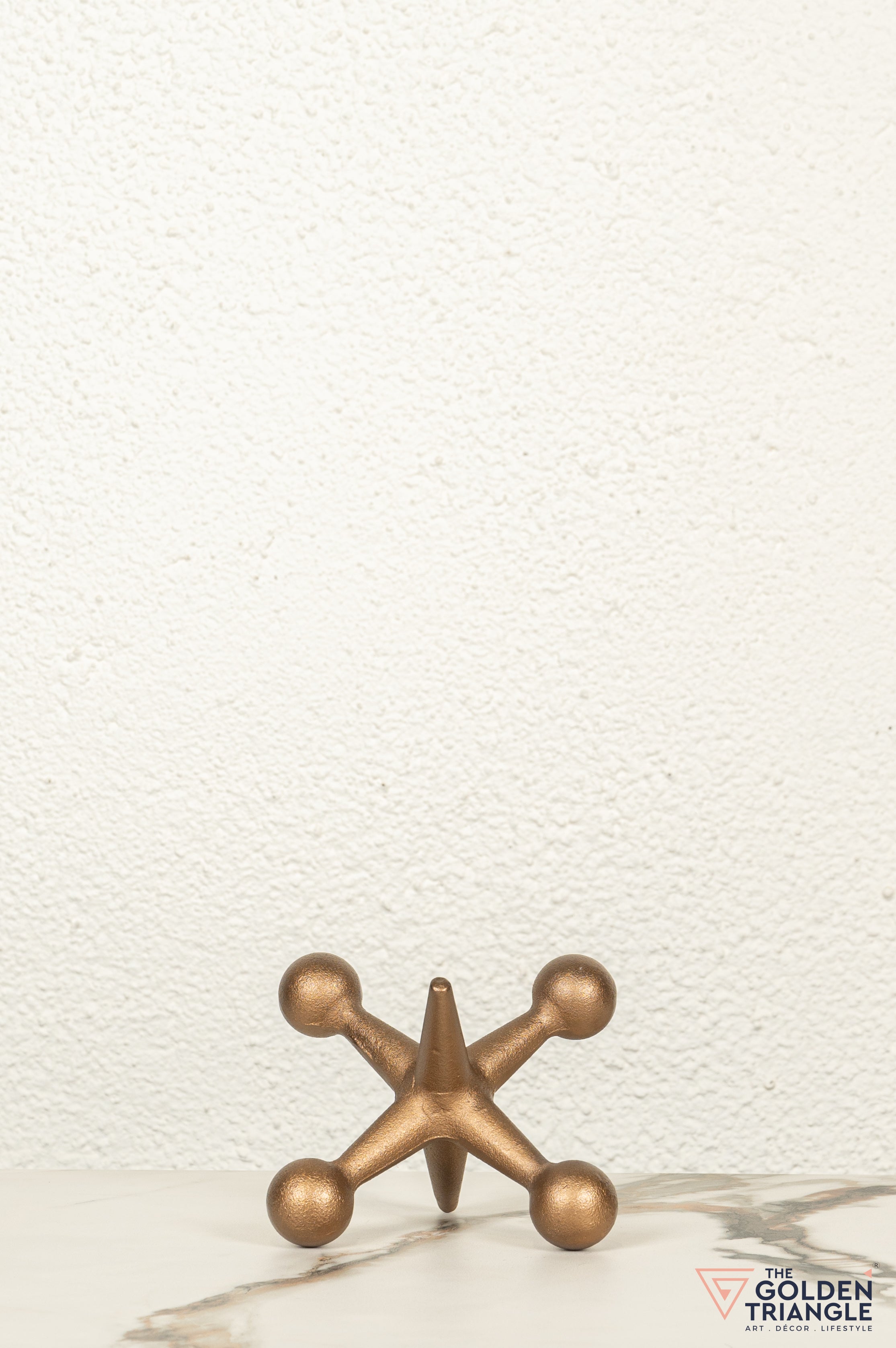 This decorative sculpture draws on the classic jacks game piece bringing a crisscrossed silhouette to any surface. It has six arms that stick out in multiple direction four which are capped with small spheres. It’s a playful piece for any room as an accessory or as a paperweight on your office desk.