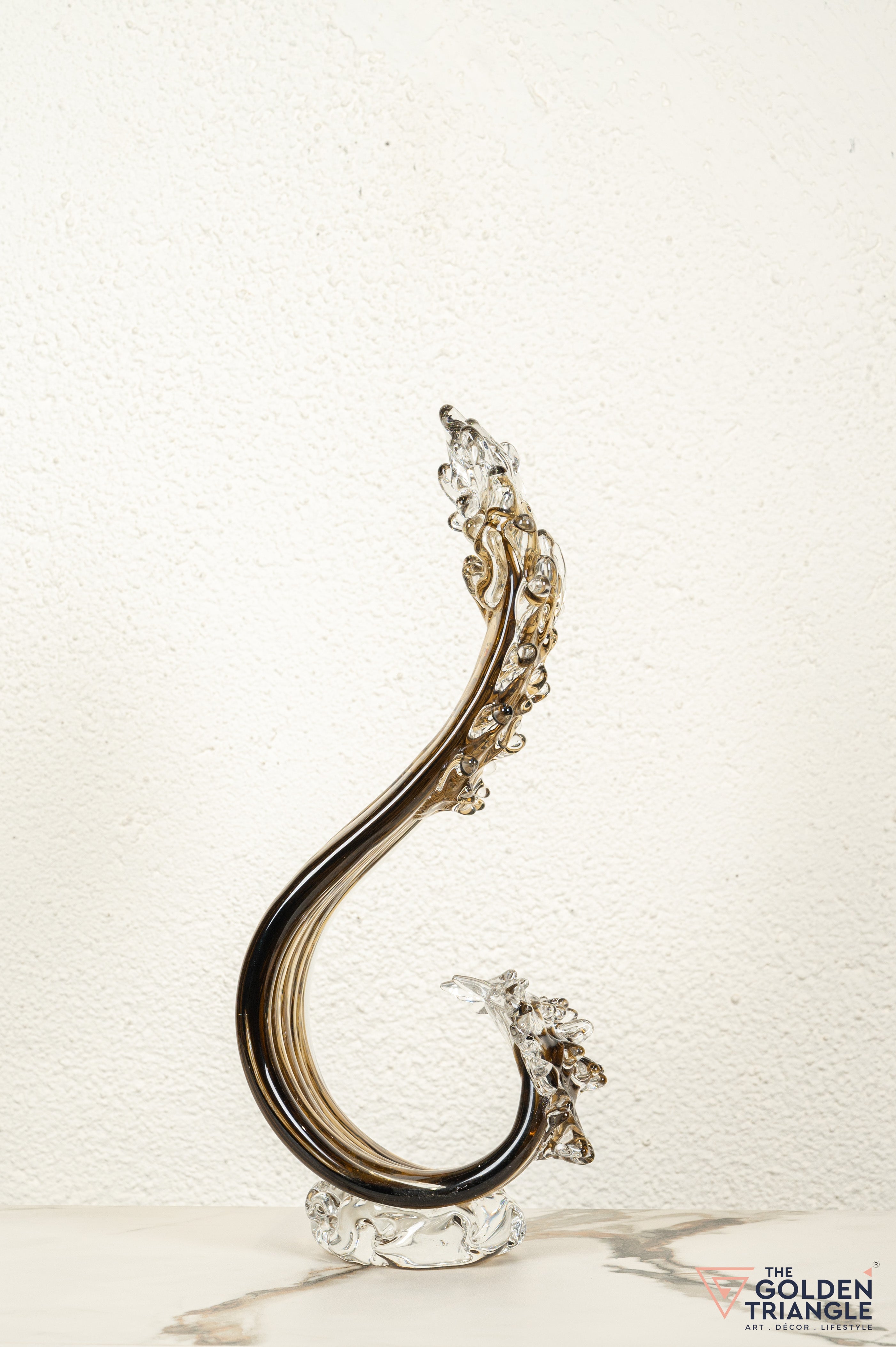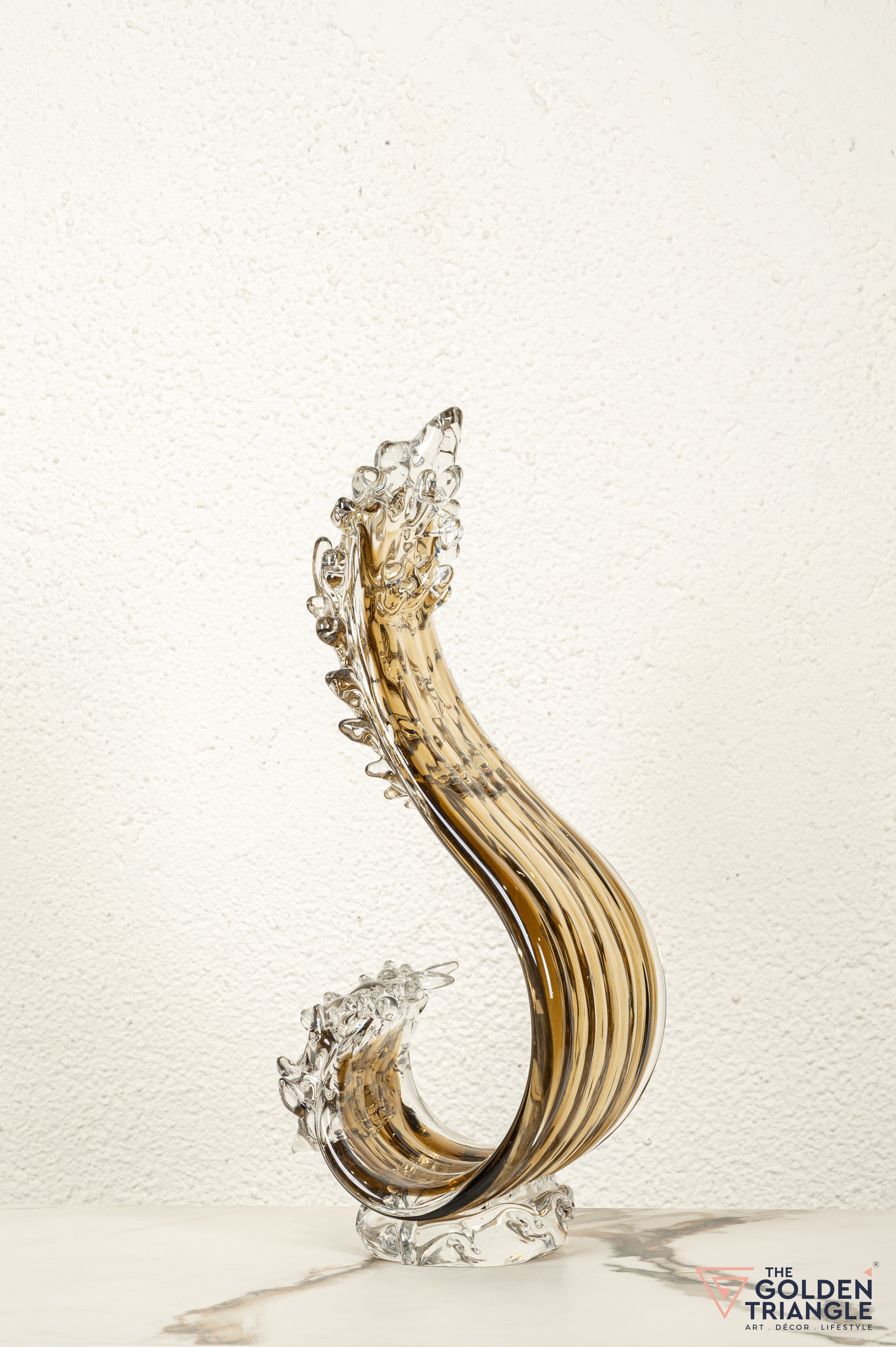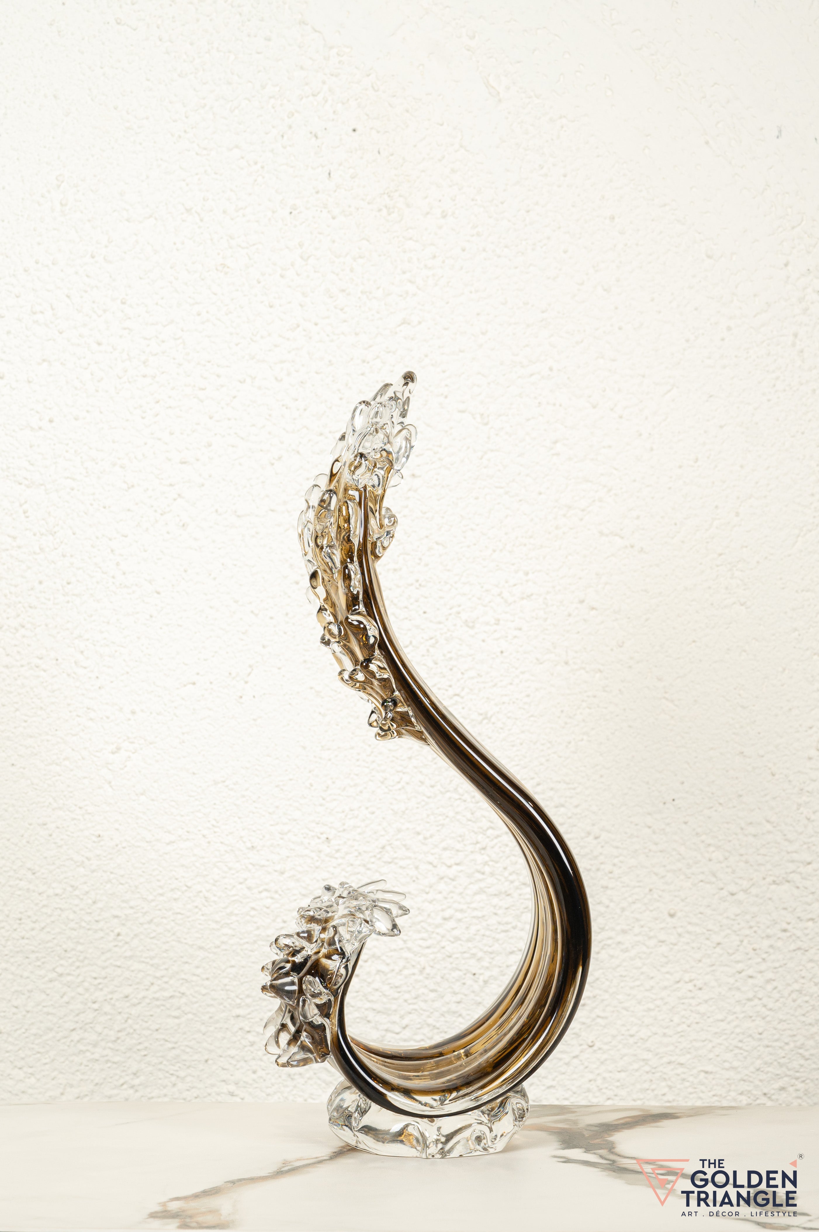 Crafted from premium-quality glass, this elegant decor piece captures the beauty of movement, resembling a wave frozen in time. Its flowing curves and crystal-clear accents exude sophistication, making it the perfect centerpiece for any living room, office, or modern space. The fluid form of this sculpture is enhanced by its vibrant aqua hues, which evoke a sense of serenity and connection to nature. The sparkling details at the crest mimic ocean spray, adding a touch of dynamic energy to the design. Whether placed on a console, shelf, or tabletop, this sculpture is sure to catch the light and captivate attention from every angle.