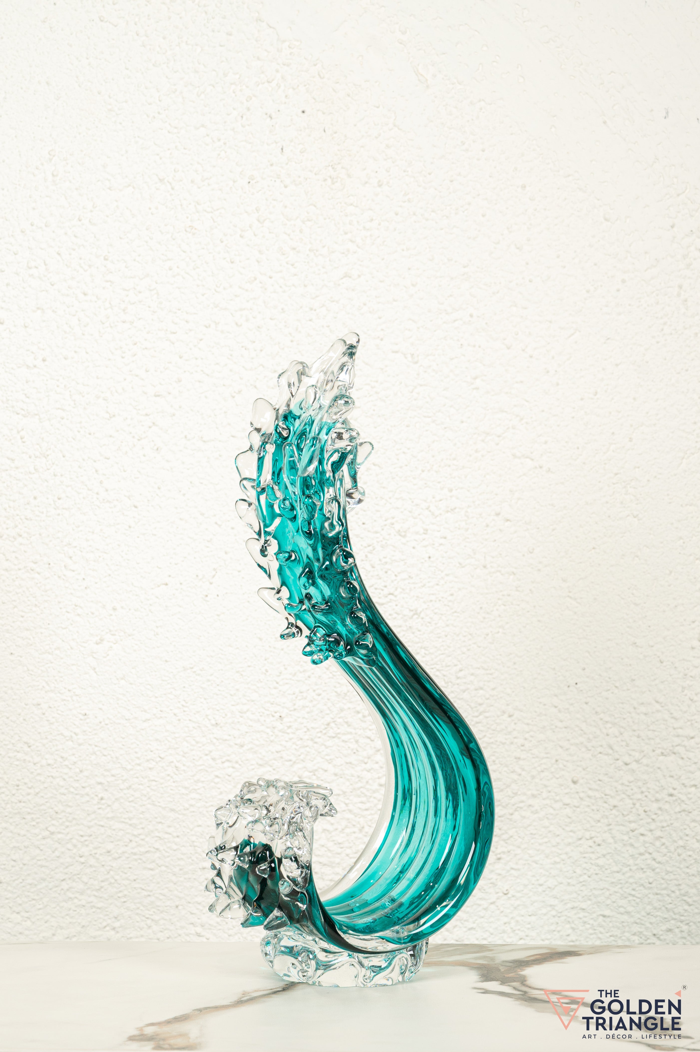 Crafted from premium-quality glass, this elegant decor piece captures the beauty of movement, resembling a wave frozen in time. Its flowing curves and crystal-clear accents exude sophistication, making it the perfect centerpiece for any living room, office, or modern space. The fluid form of this sculpture is enhanced by its vibrant aqua hues, which evoke a sense of serenity and connection to nature. The sparkling details at the crest mimic ocean spray, adding a touch of dynamic energy to the design. Whether placed on a console, shelf, or tabletop, this sculpture is sure to catch the light and captivate attention from every angle.