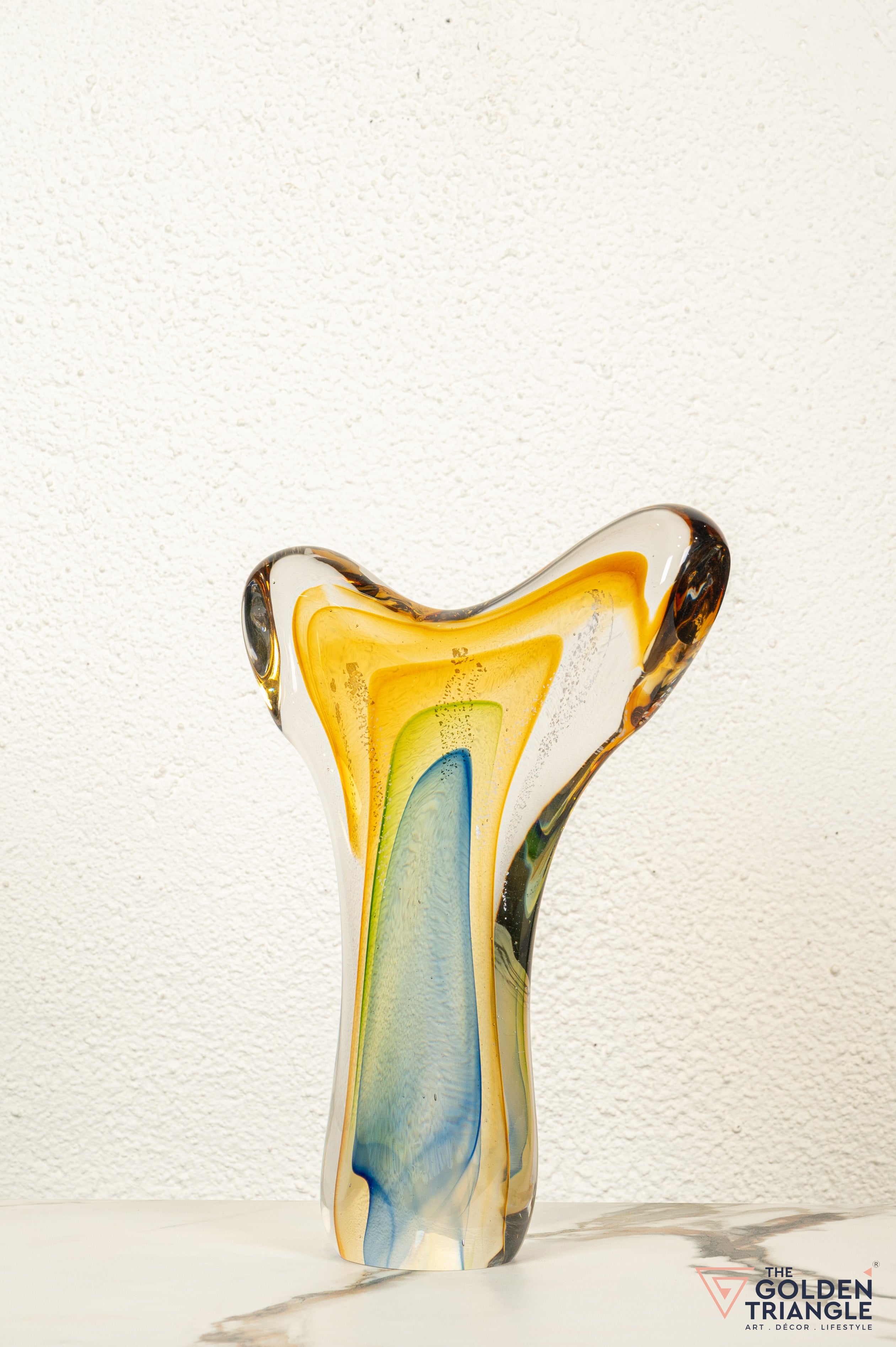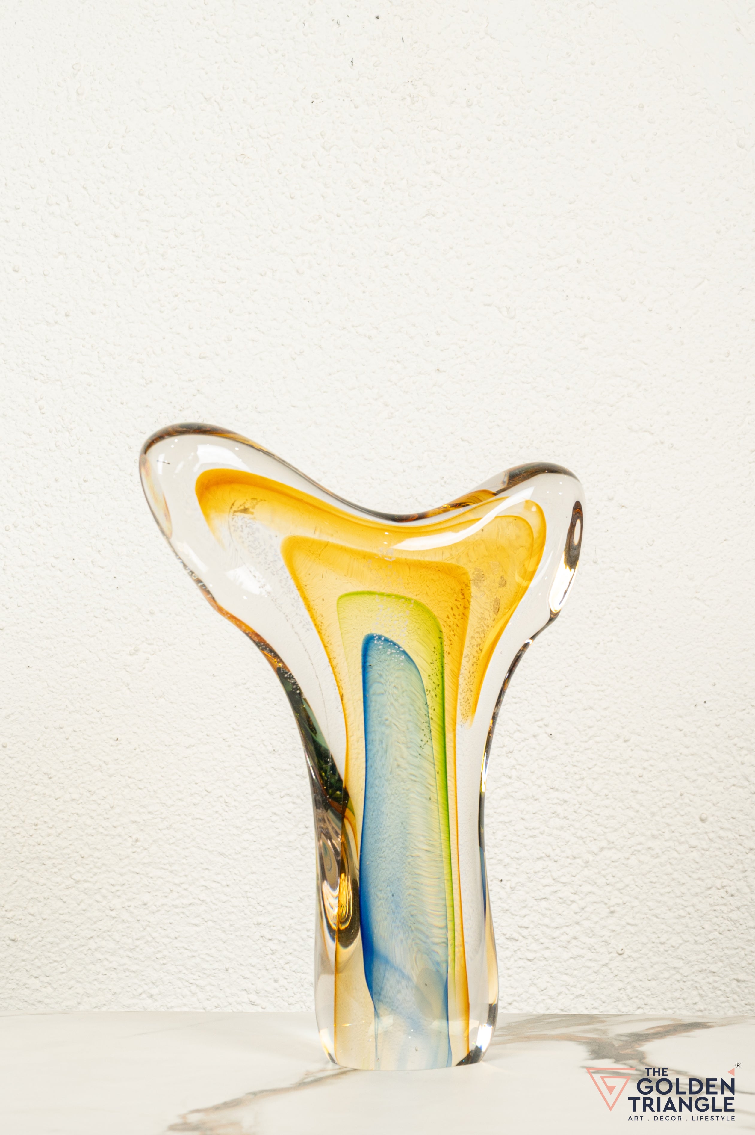 This exquisite glass sculpture captures the graceful form of a fish tail in a contemporary and abstract style. Crafted from premium glass, the piece showcases a mesmerizing interplay of colors, with a palette of deep blue, shimmering gold, and clear glass. The tail elegantly fans out, creating a sense of movement and freedom. Whether placed on a mantelpiece, a side table, or as the centerpiece of a gallery wall, it will undoubtedly become a conversation starter and a cherished addition to your decor.