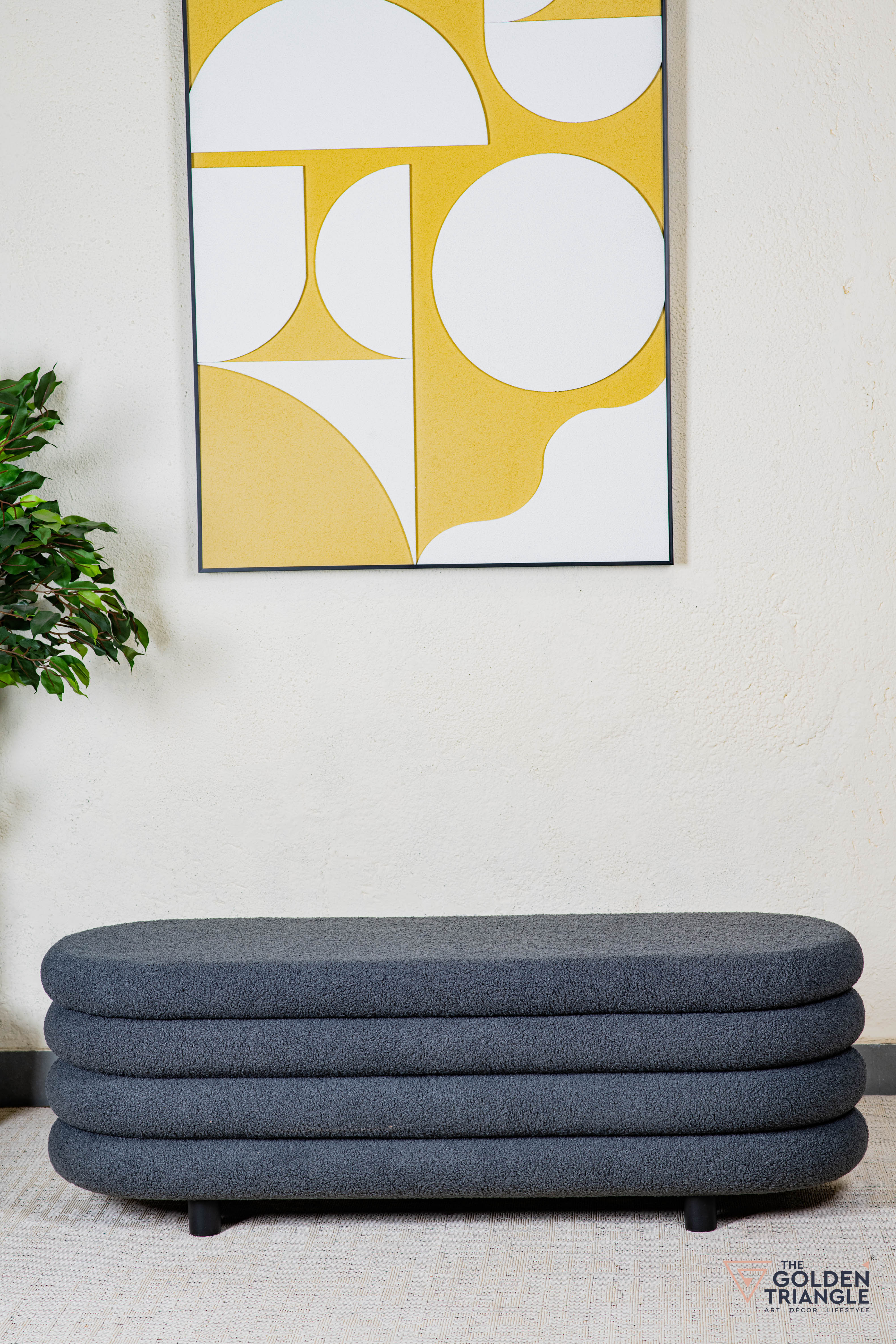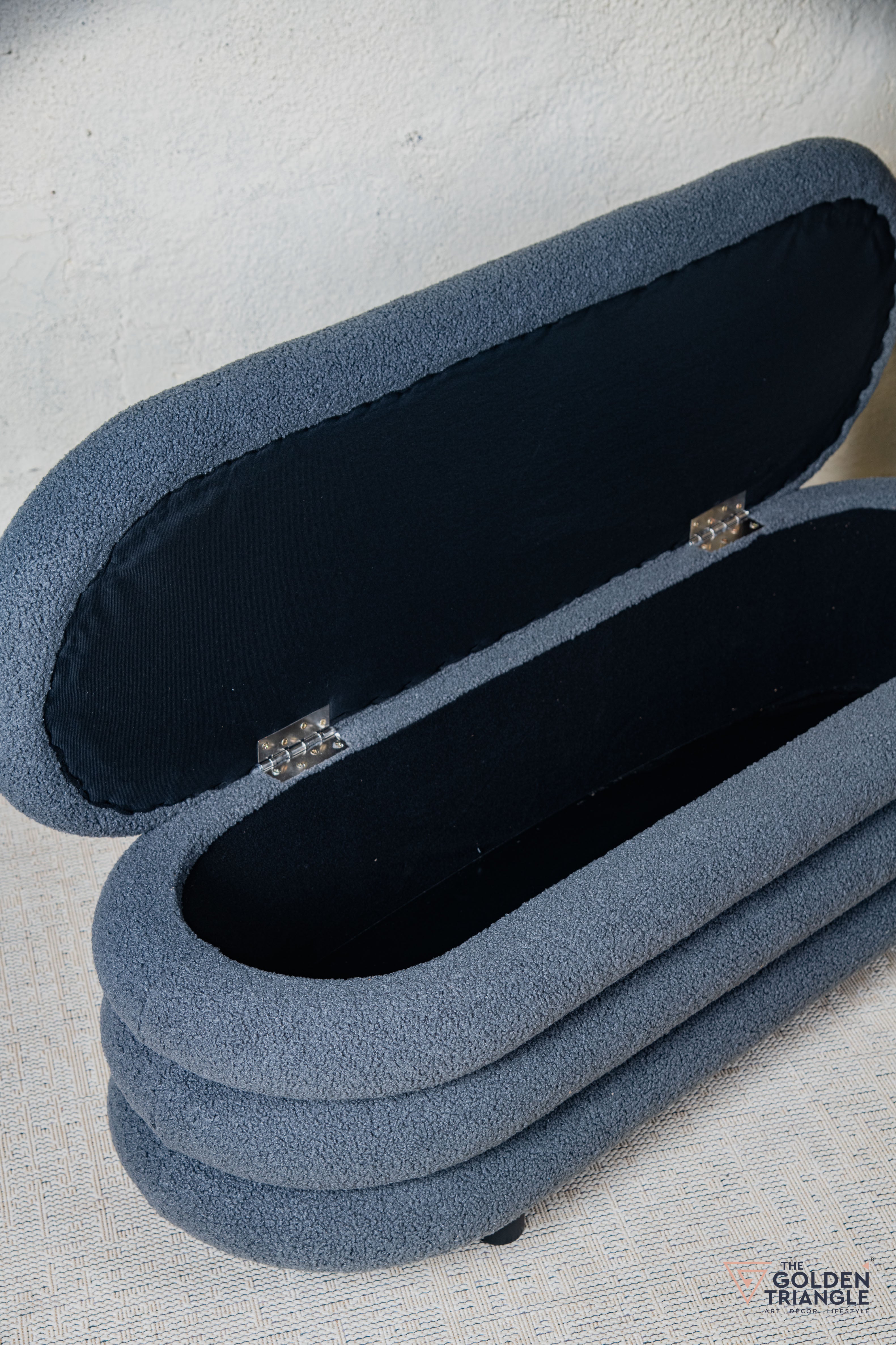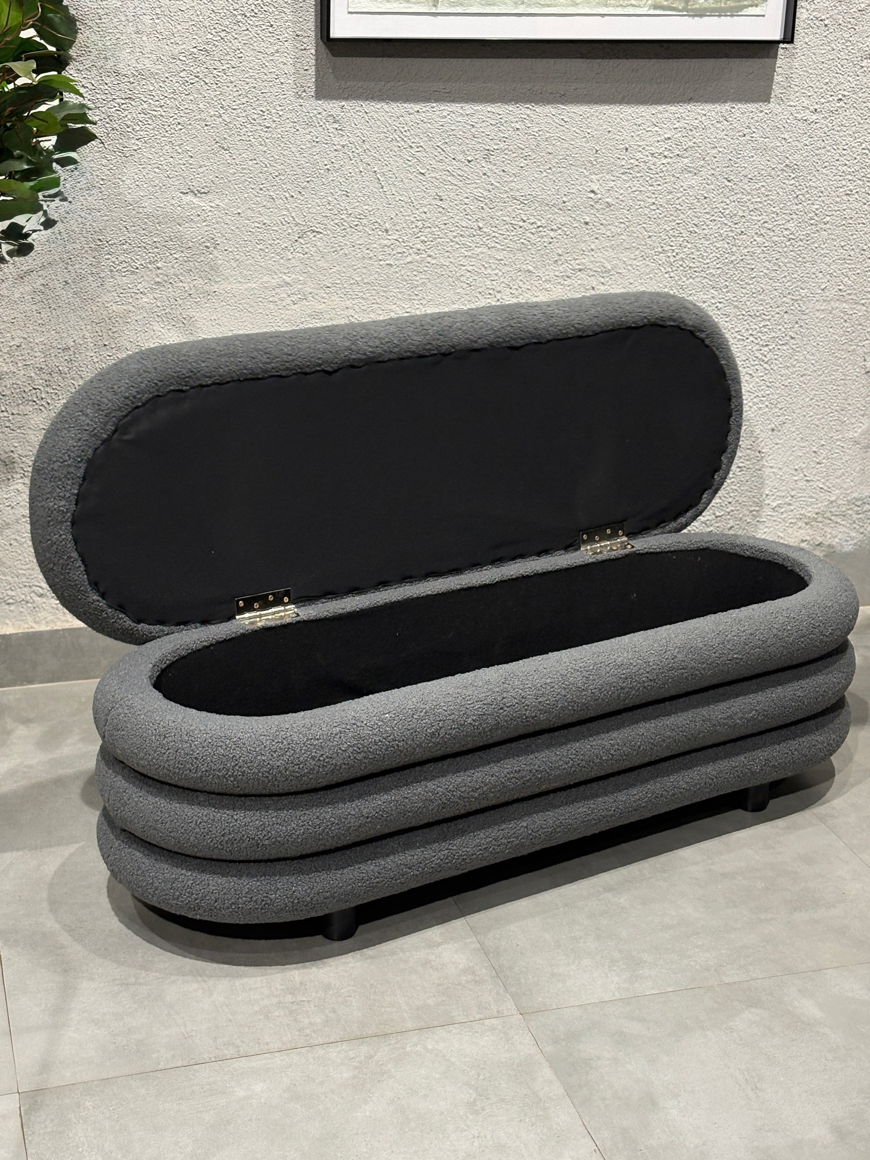 This storage bench features a sleek, modern design wrapped in luxurious bouclé fabric. The softly textured upholstery adds warmth and sophistication, while the unique rounded, layered construction creates a striking visual appeal. Supported by sturdy yet discreet black legs, the bench offers ample hidden storage under its cushioned seat, making it both stylish and functional. Perfect for living rooms, bedrooms, or entryways, it combines comfort with utility, seamlessly blending into contemporary home decor.