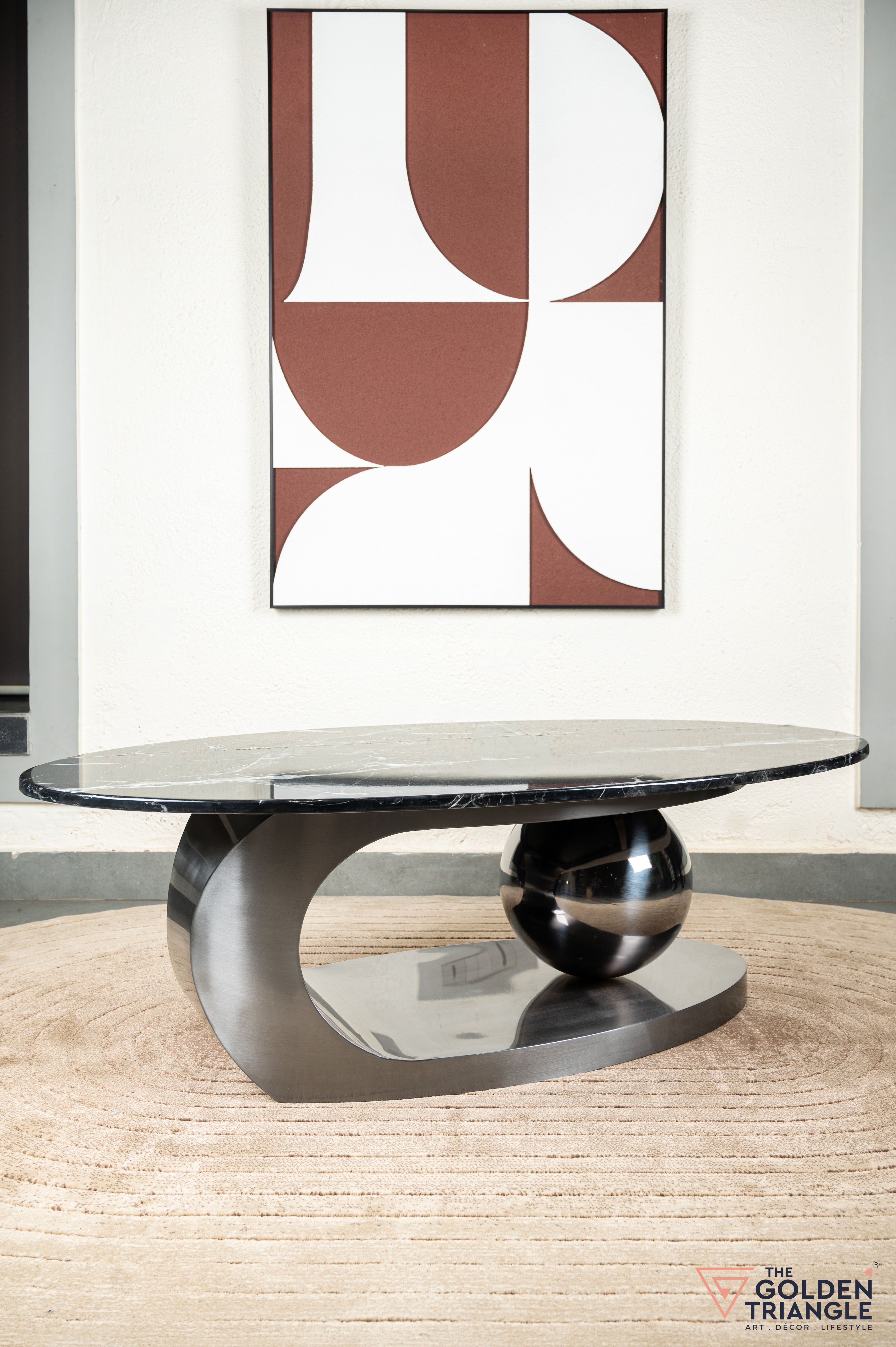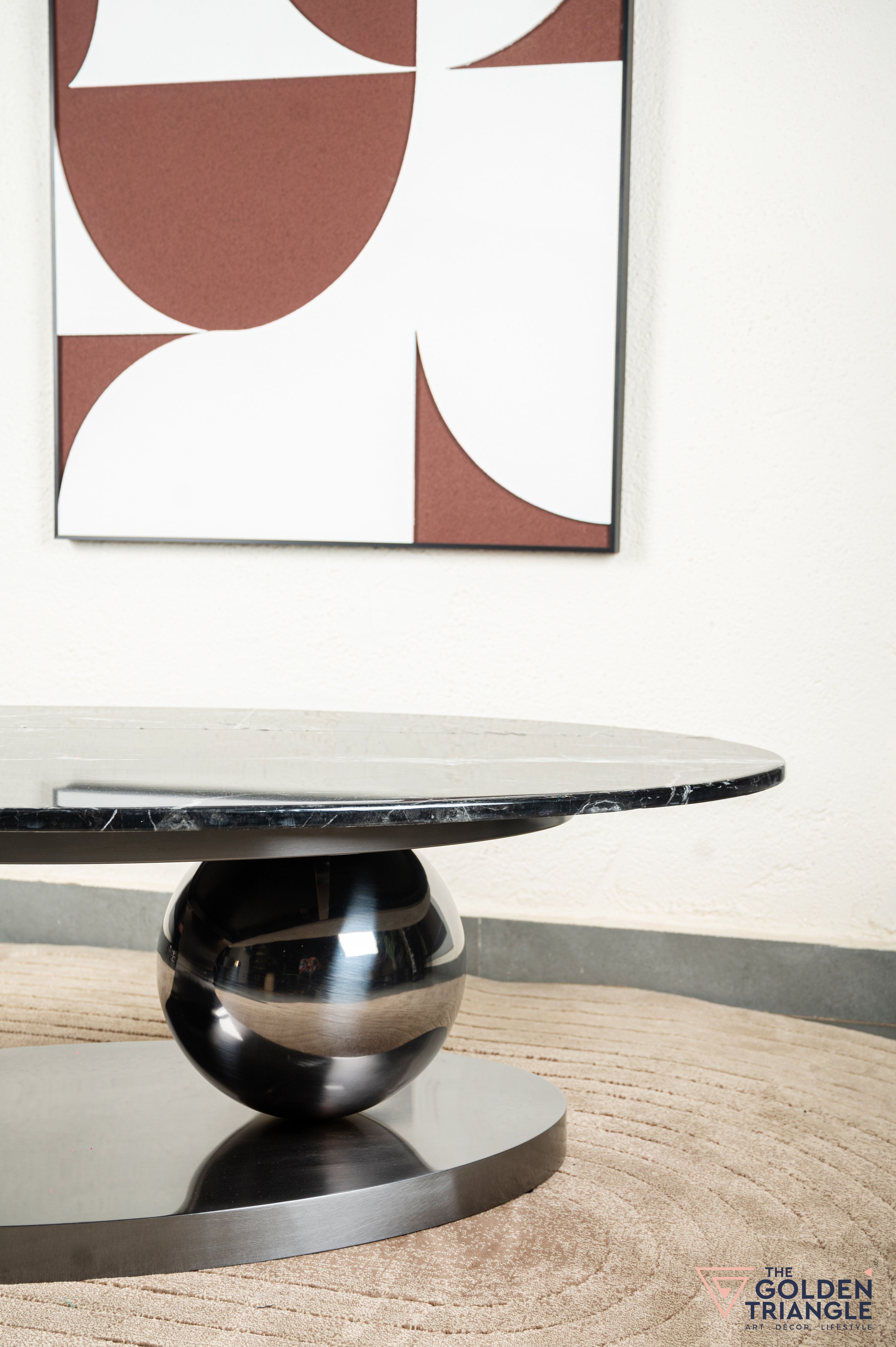 This modern coffee table showcases a unique sculptural design with a sleek black marble top featuring natural veining. The bold base, crafted from brushed metal, includes a striking spherical accent, creating a perfect blend of artistry and function. Ideal for elevating contemporary living space.