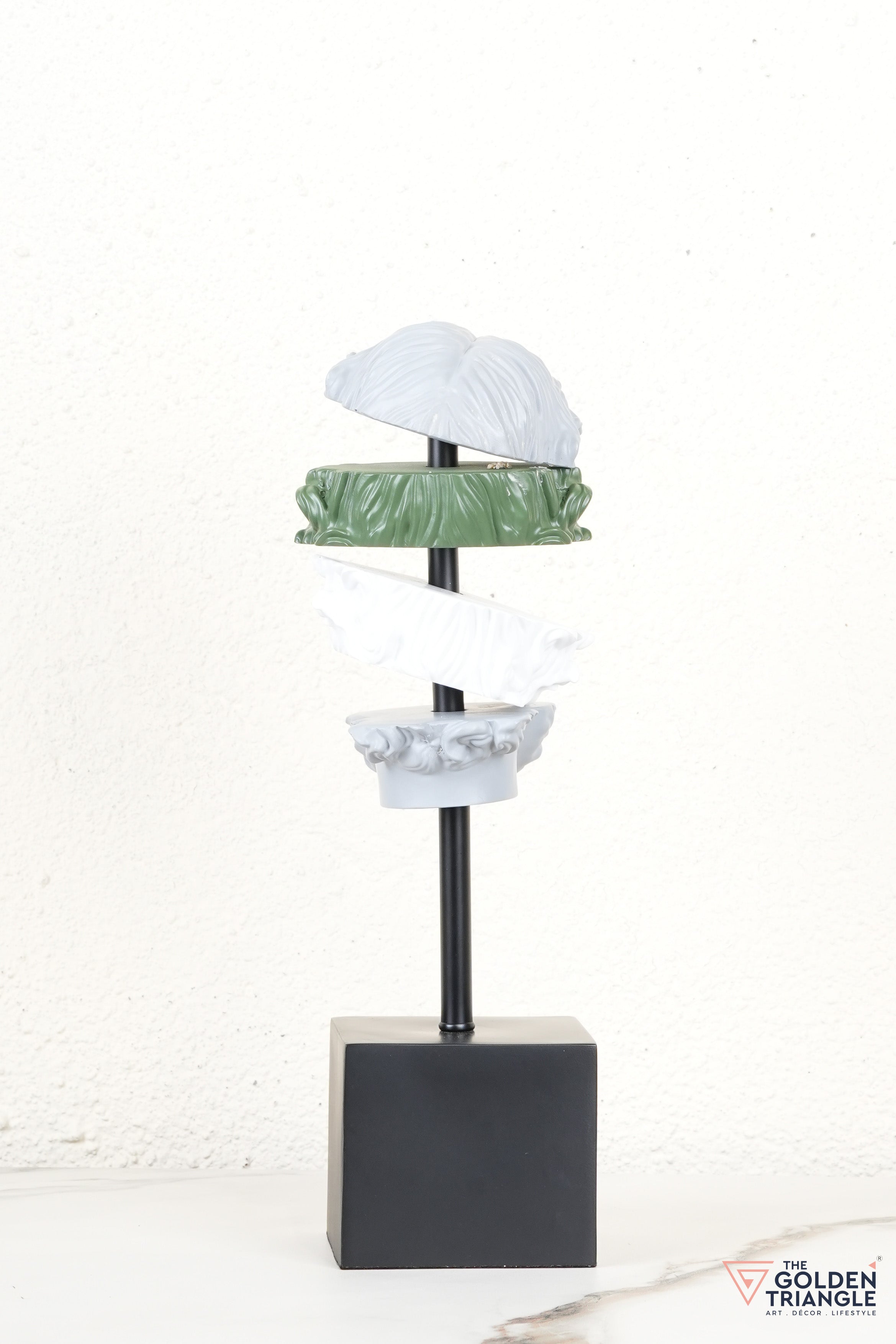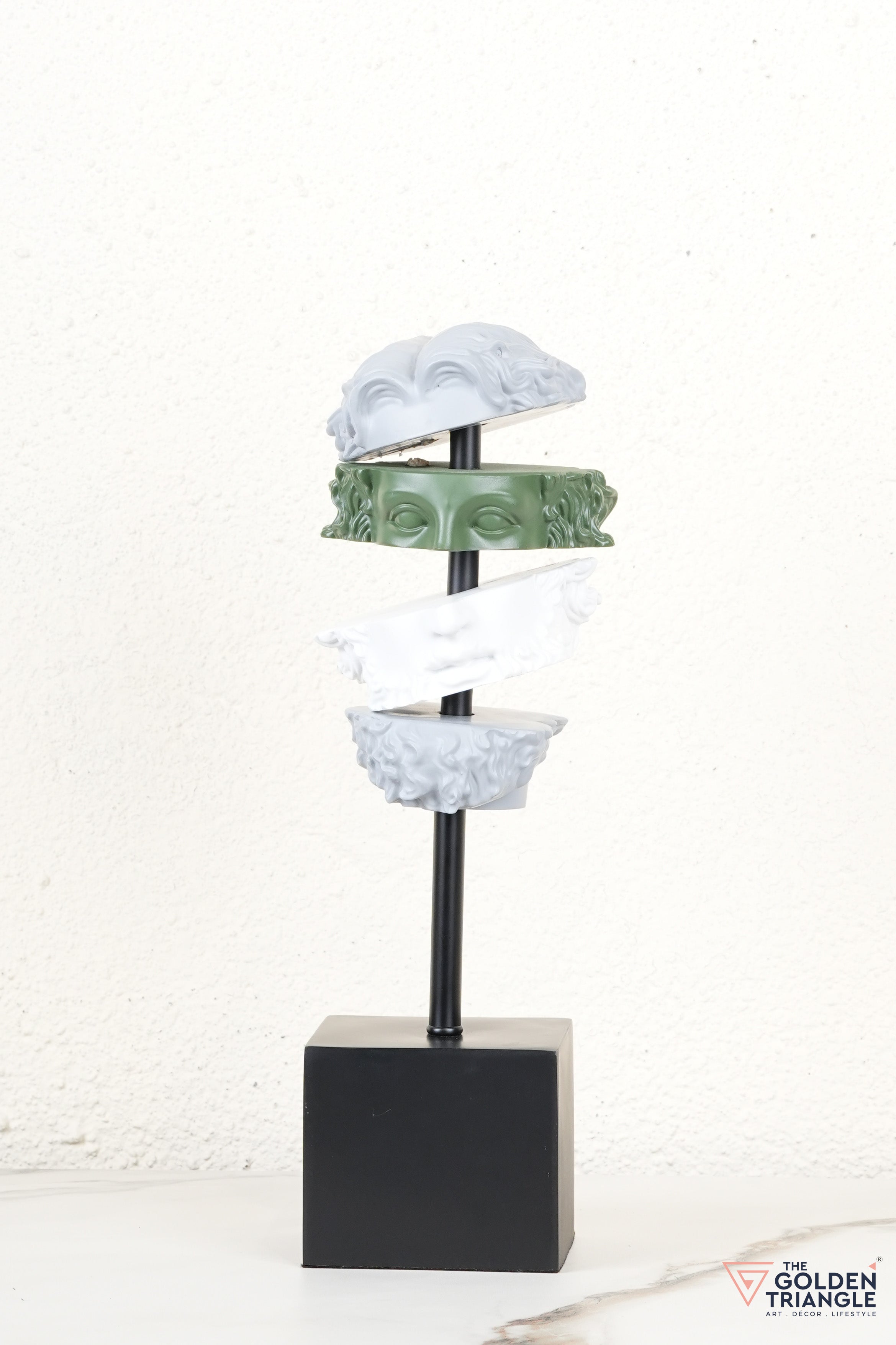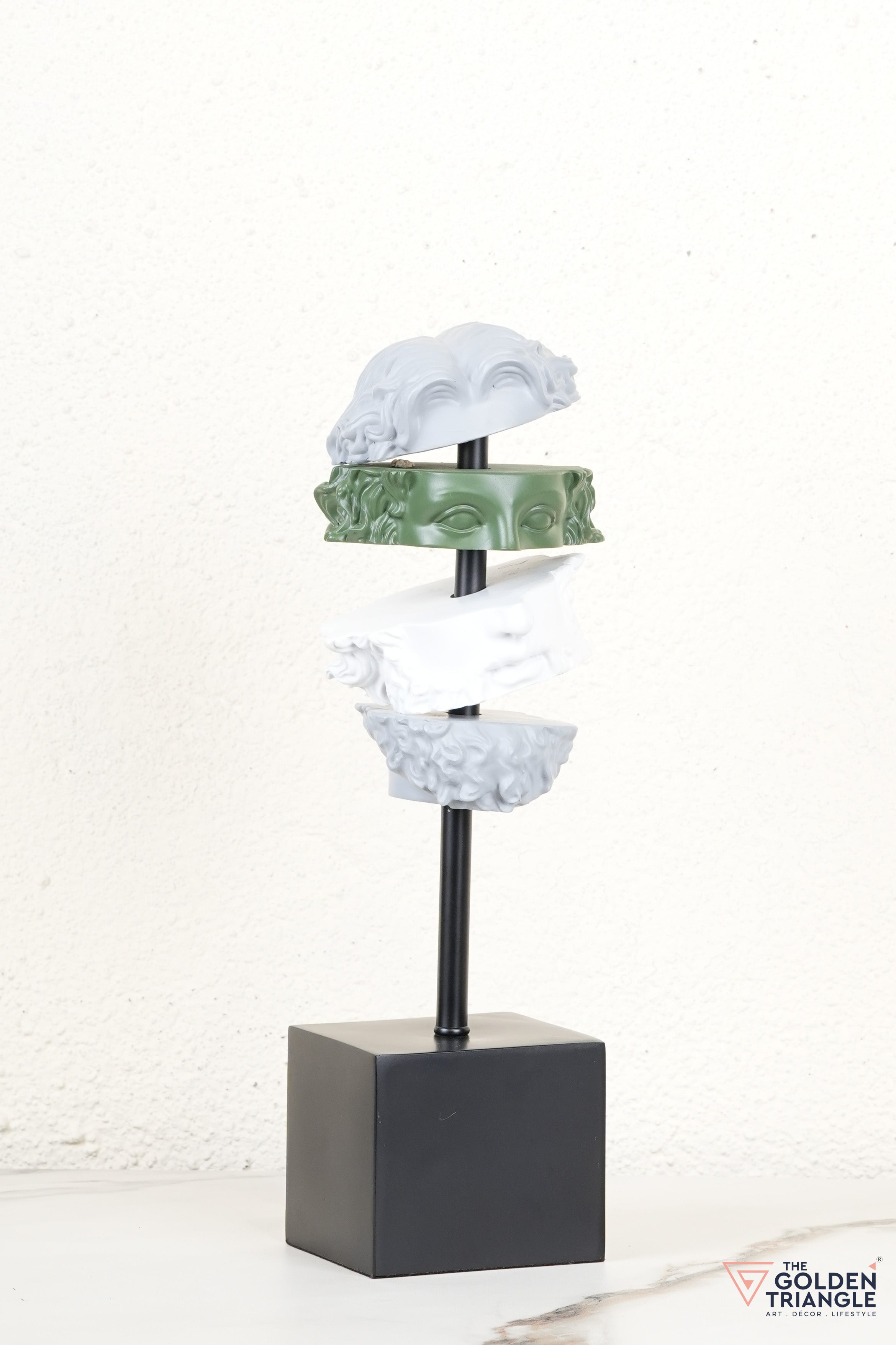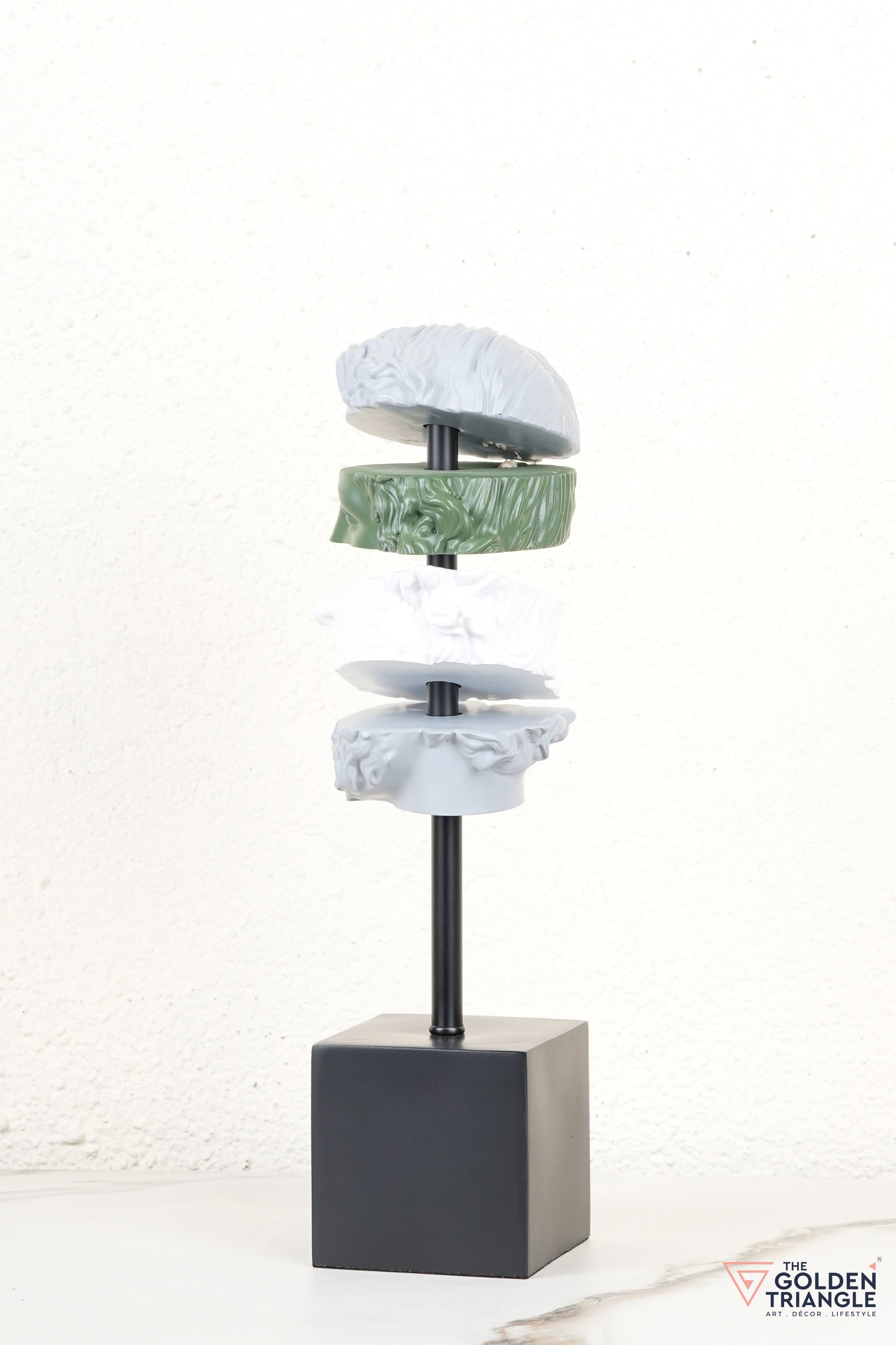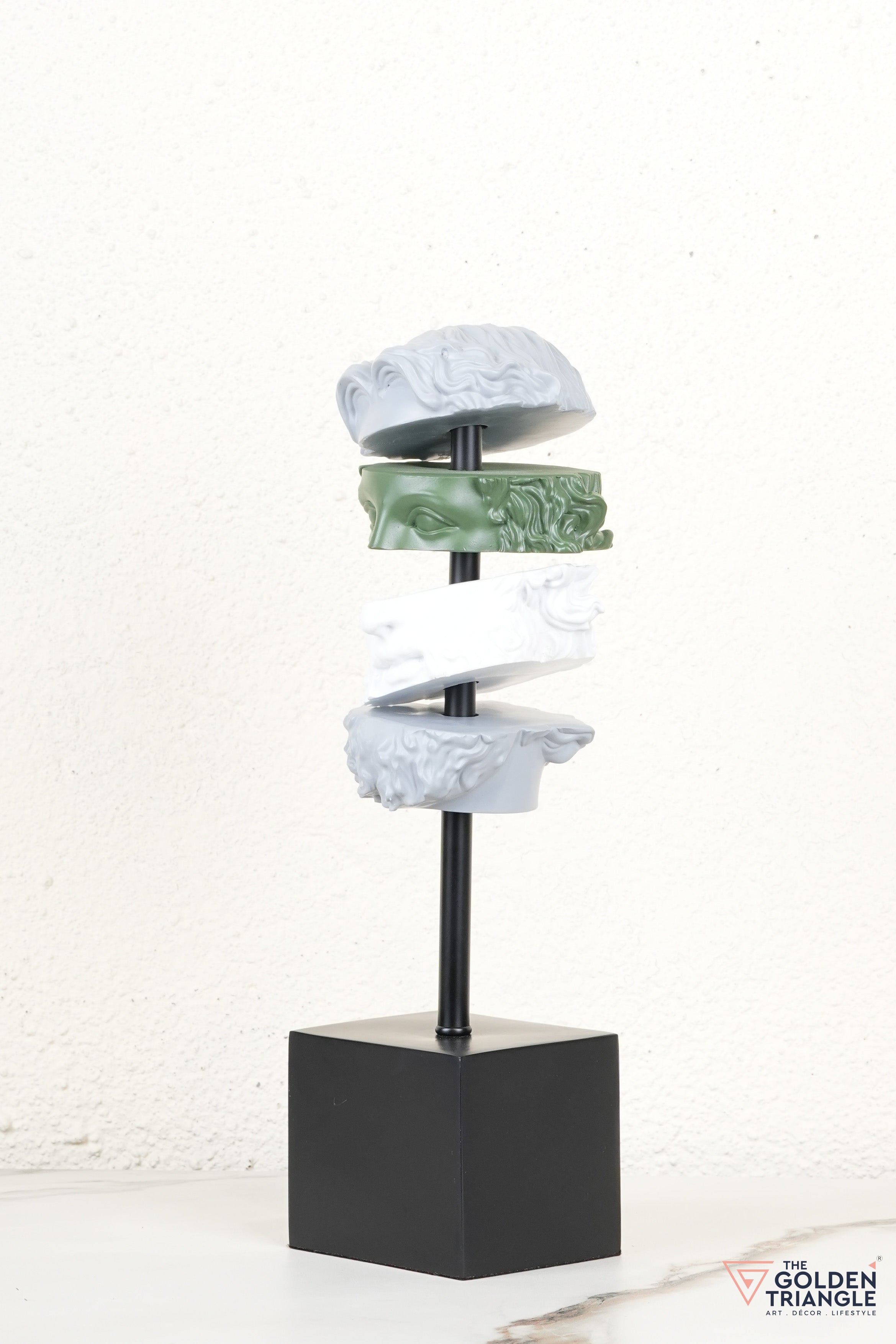 This striking resin sculpture reimagines classical art with a modern twist, featuring a deconstructed face in layered hues of grey, white, and ochre. Mounted on a sleek black base, it becomes an instant conversation starter in any room. Perfect for tabletops, bookshelves, or work desks, this abstract showpiece brings a bold, intellectual edge to your home or office decor. Its fragmented form adds depth and dimension, making it ideal for contemporary and eclectic interiors.