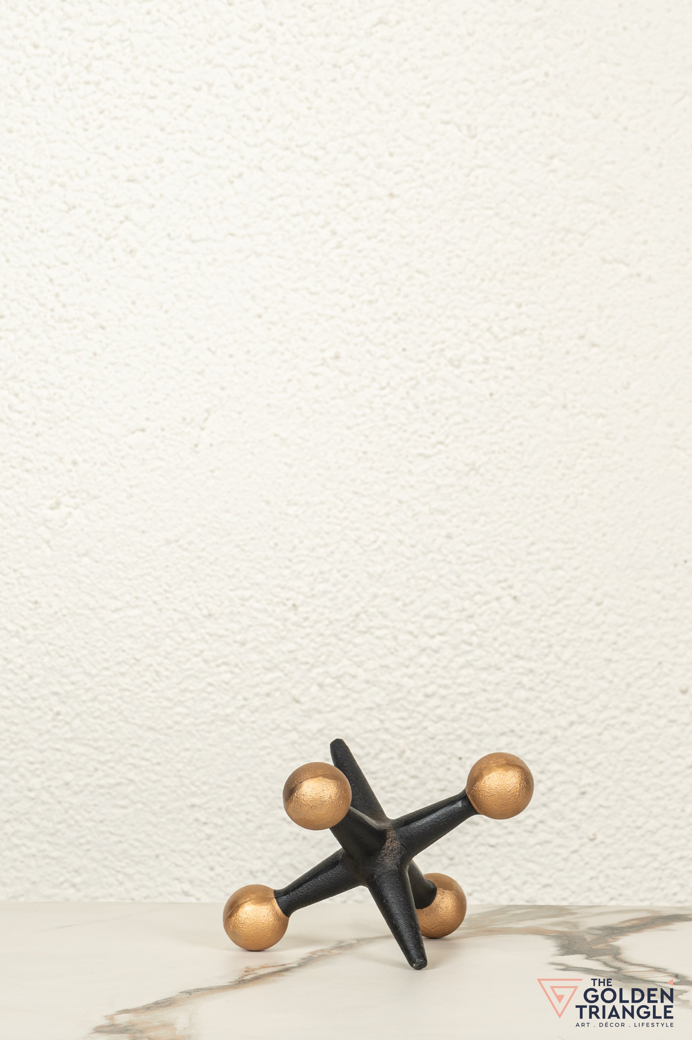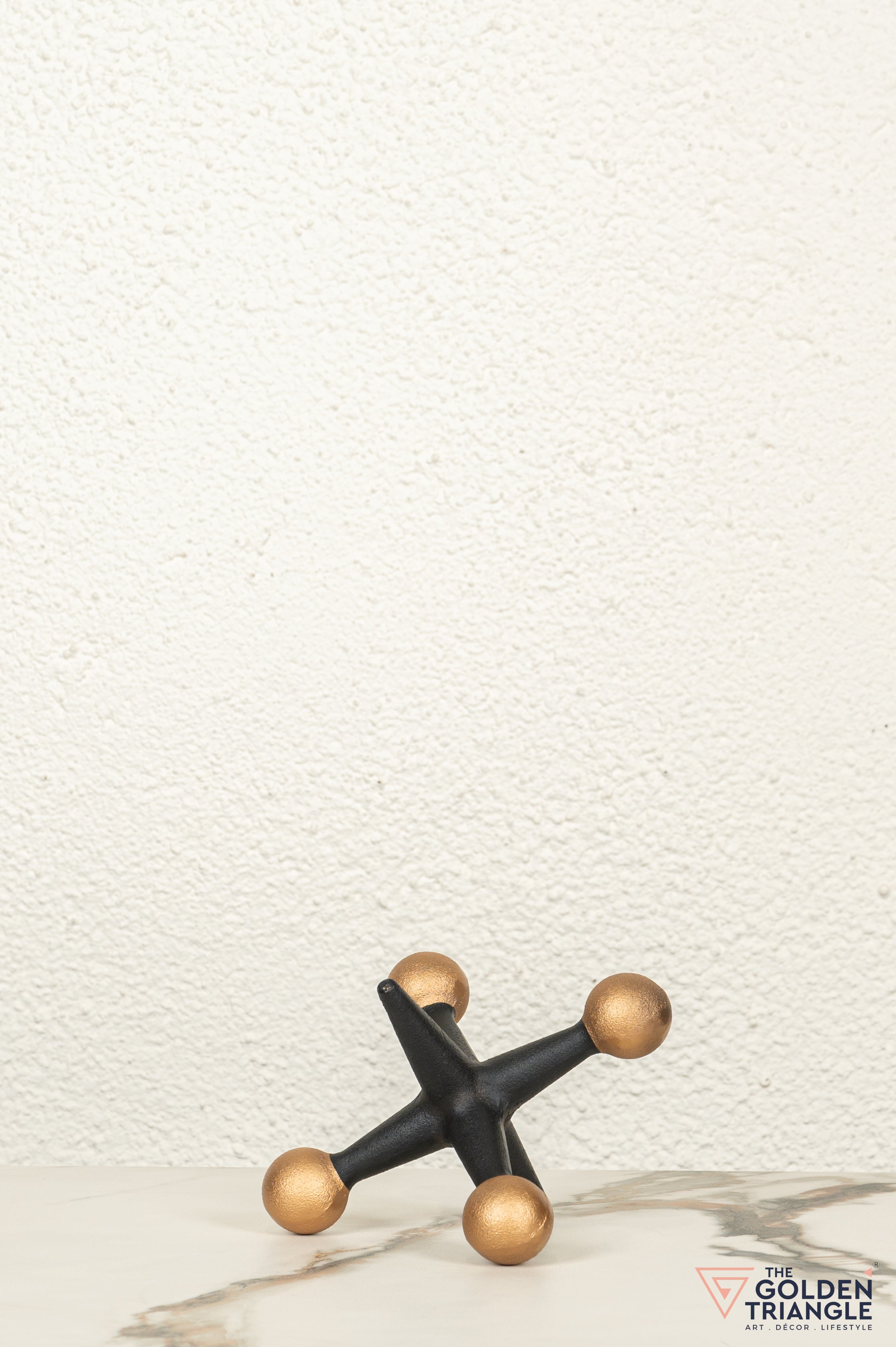 This decorative sculpture draws on the classic jacks game piece bringing a crisscrossed silhouette to any surface. It has six arms that stick out in multiple direction four which are capped with small spheres. It’s a playful piece for any room as an accessory or as a paperweight on your office desk.