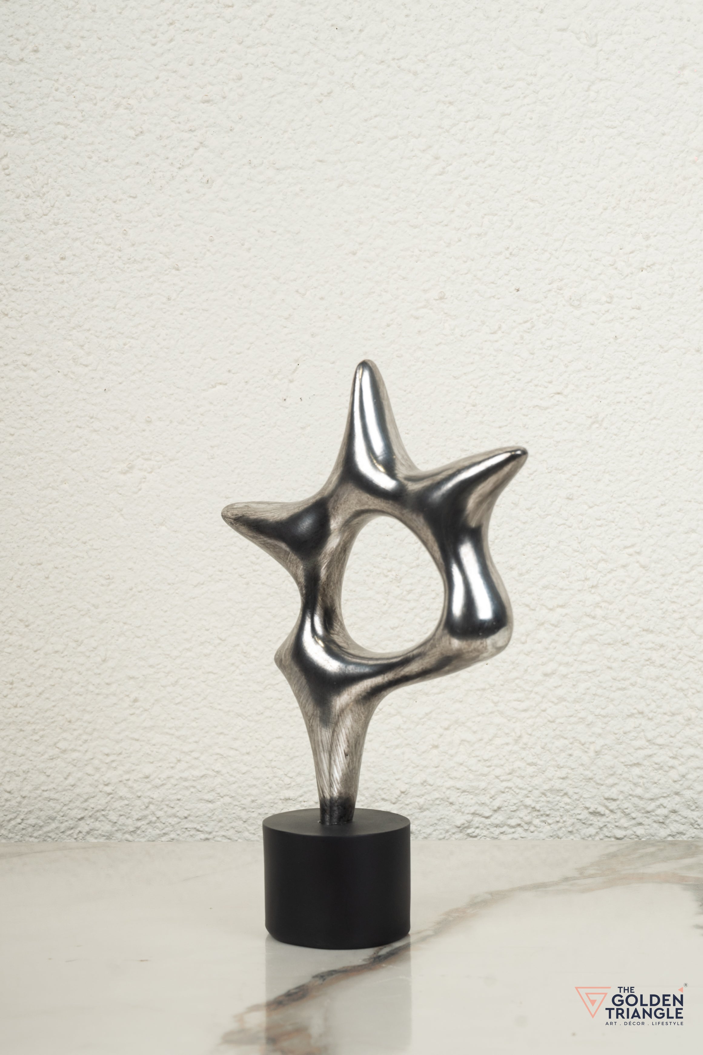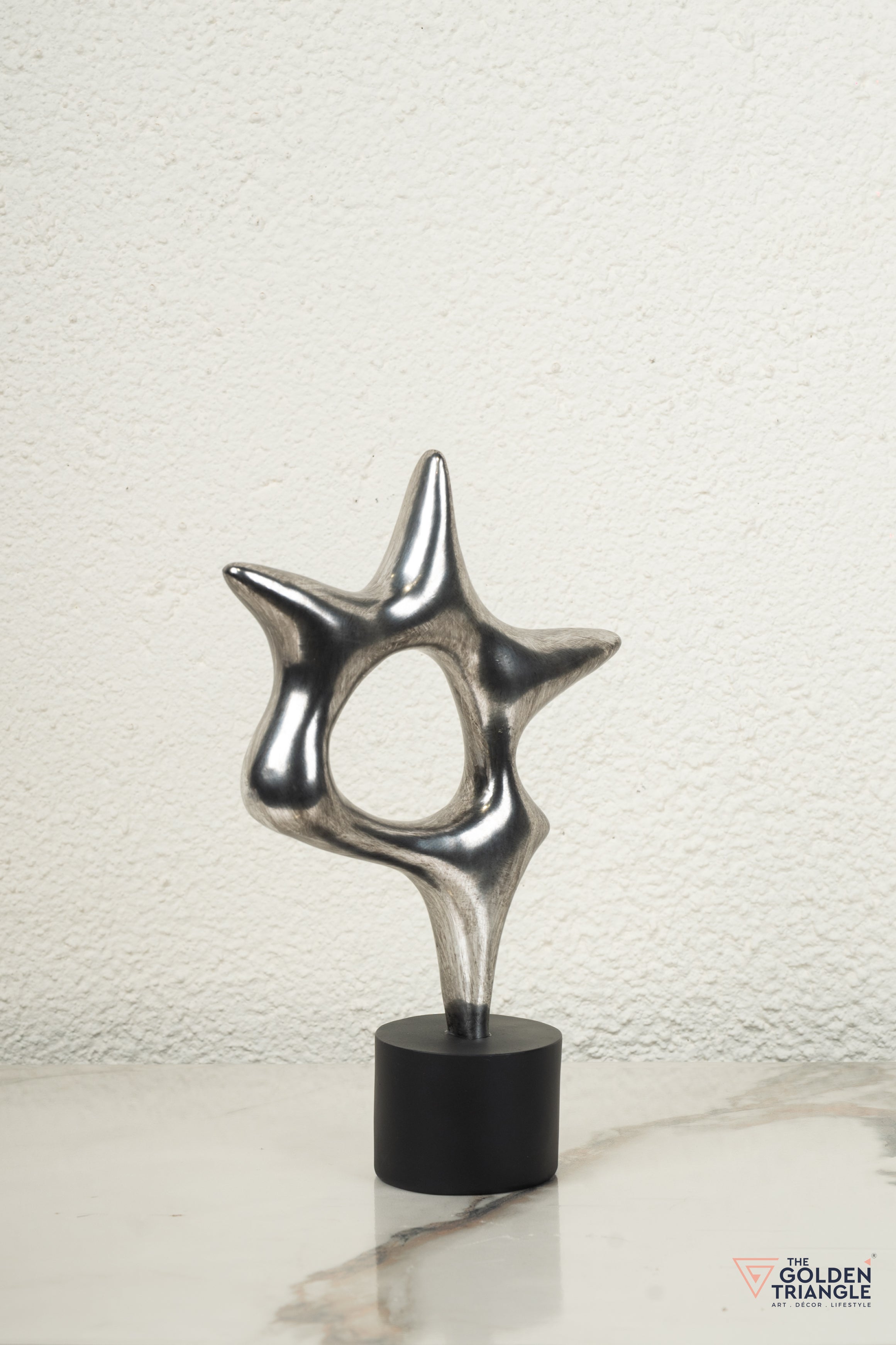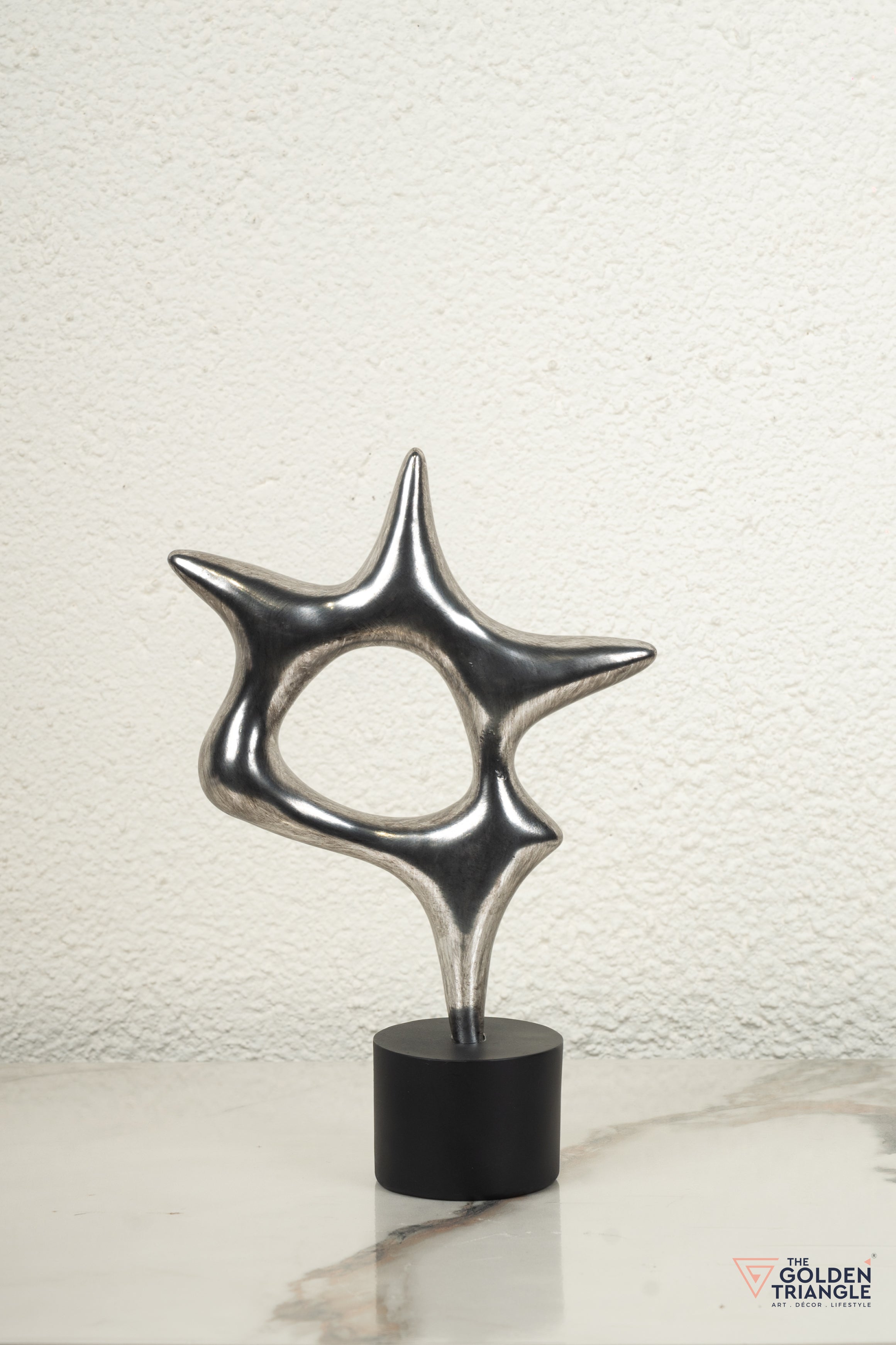 The unique star shaped design featuring elongated pointed arms and a sleek marble base provides a striking contrast to the metallic finish. The abstract design allows it to be appreciated from different angles. Add a touch of cosmic elegance with this shimmering metallic finish. Perfect for coffee tables or mantel piece.