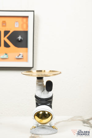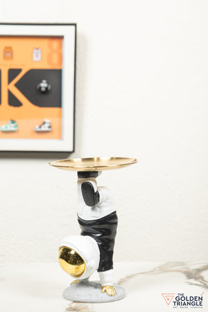 Add a playful, futurist vibe to your space with this quirky astronaut rapper decor piece. Featuring a tray to hold your trinkets, reflective helmet and bold streetware style, this figurine brings a touch of modern art to any room. Perfect for eclectic and contemporary decor, its a conversation starter. It would look great in a living room, bedroom, office adding a touch of fun and adventure to the space.