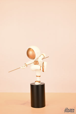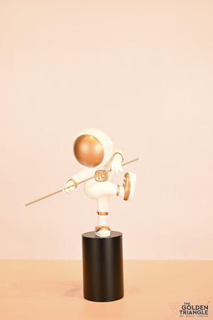 This extraordinary astronaut showcasing some impressive Kung FU moves embodying a harmonious blend of space exploration and martial arts prowess. The detailed spacesuit and dynamic poses excude strength and grace. Place it on a mantel, bookshelf or coffee table in your study, kids room or bedroom. Whether you're an avid space enthusiast or simply seeking a unique and sophisticated decor piece, it is a perfect addition to let the spirit of exploration adorn your living space with this extraordinary astronaut showpiece. .