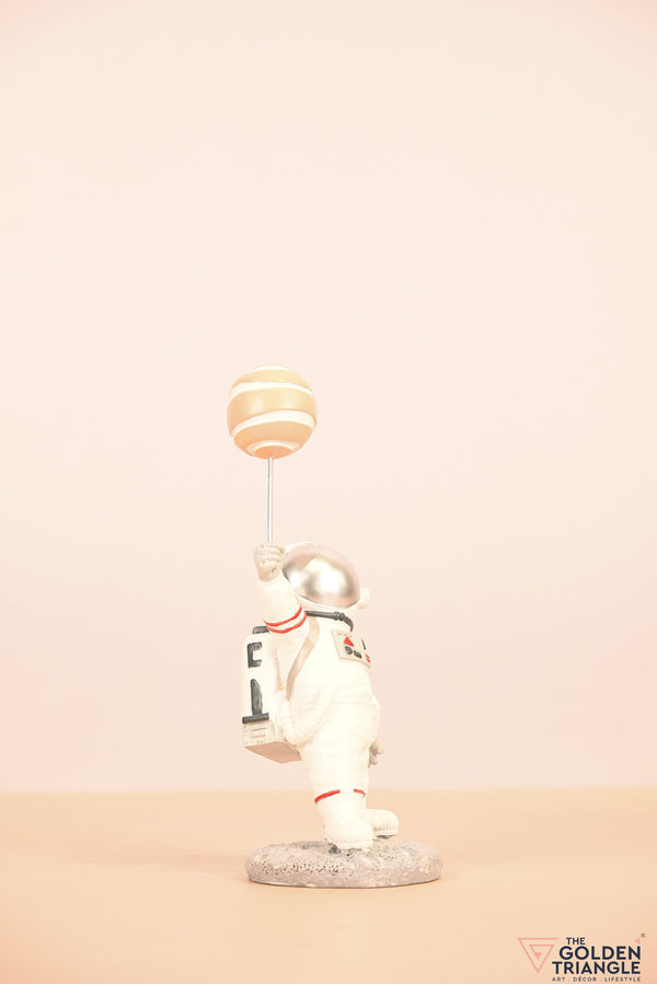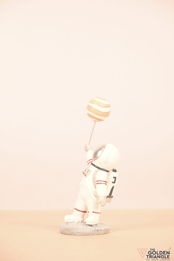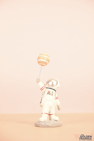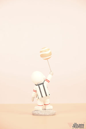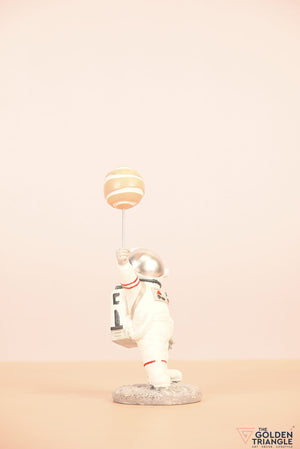 Ignite your space themed décor with this baby astronaut sprinting joyfully while clutching a vibrant balloon resembling a planet. This enchanting showpiece brings a touch of whimsy and cosmic wonder to any room. Expertly crafted with intricate detailing, the astronauts adorable spacesuit and gleeful expression evokes a sense of innocence and curiosity. Place it on your shelf, nursery or playroom and watch it as sparks delight in both young and old..