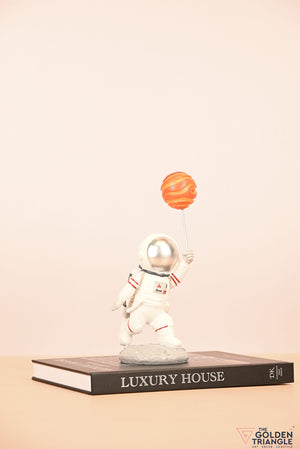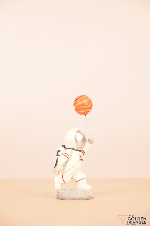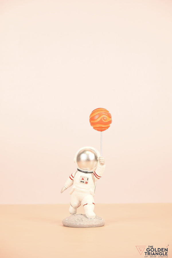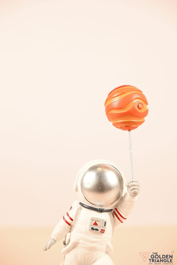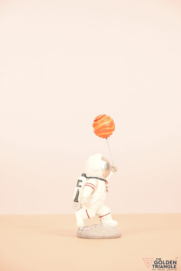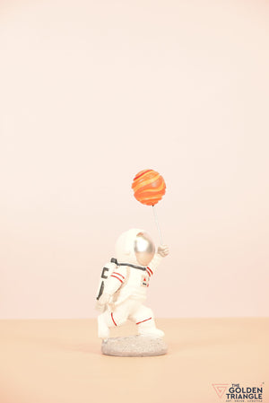 Ignite your space themed décor with this baby astronaut sprinting joyfully while clutching a vibrant balloon resembling a planet. This enchanting showpiece brings a touch of whimsy and cosmic wonder to any room. Expertly crafted with intricate detailing, the astronauts adorable spacesuit and gleeful expression evokes a sense of innocence and curiosity. Place it on your shelf, nursery or playroom and watch it as sparks delight in both young and old..