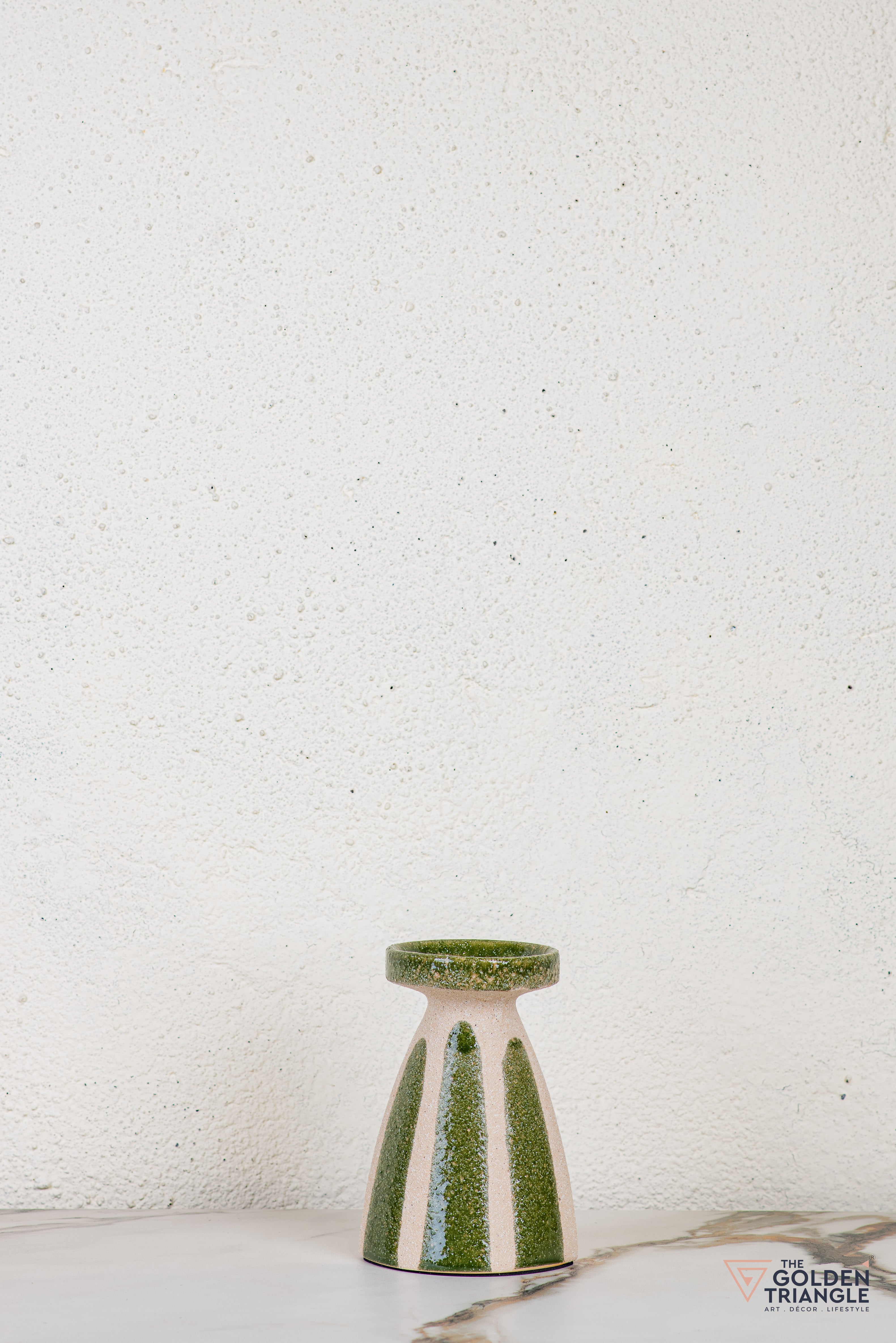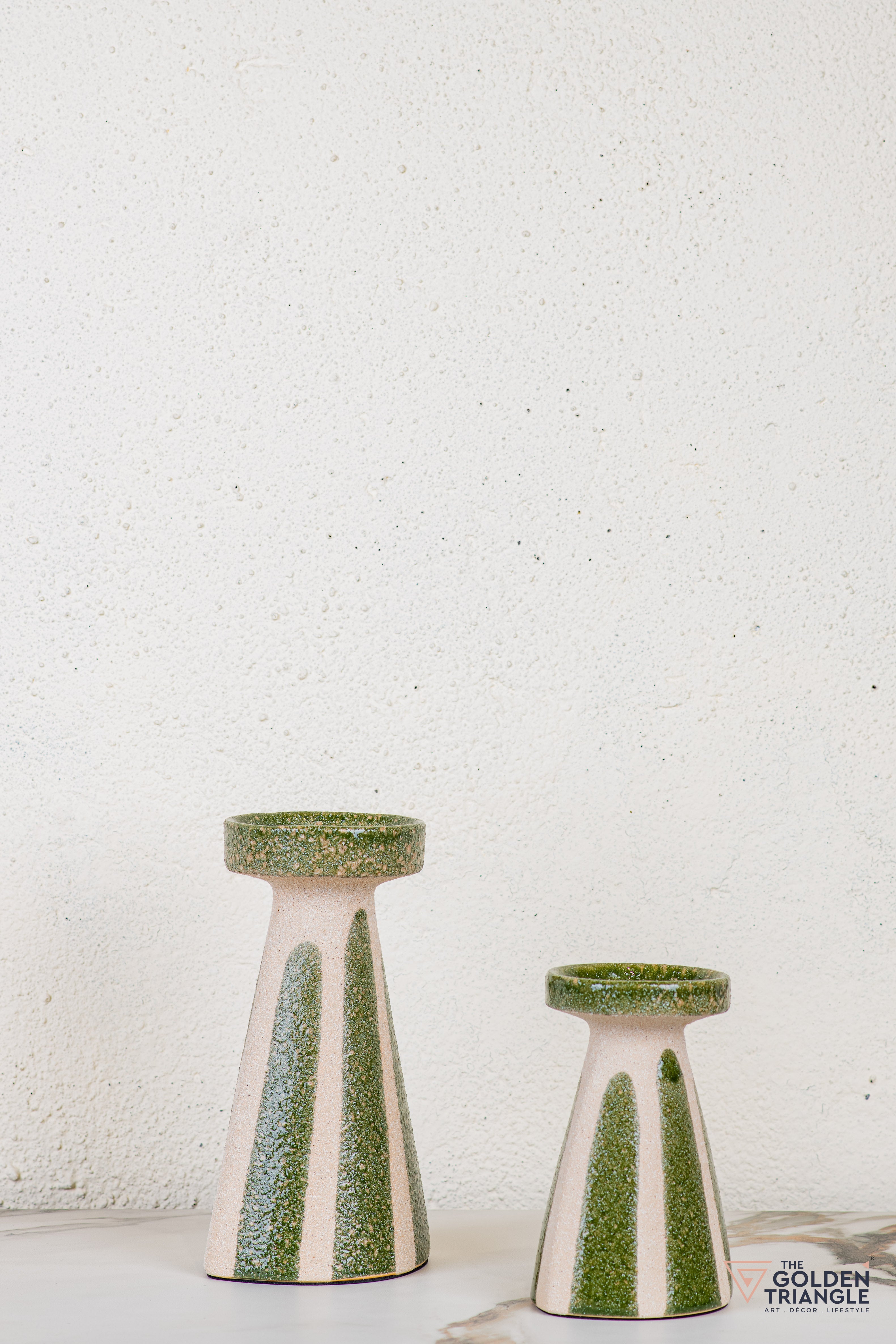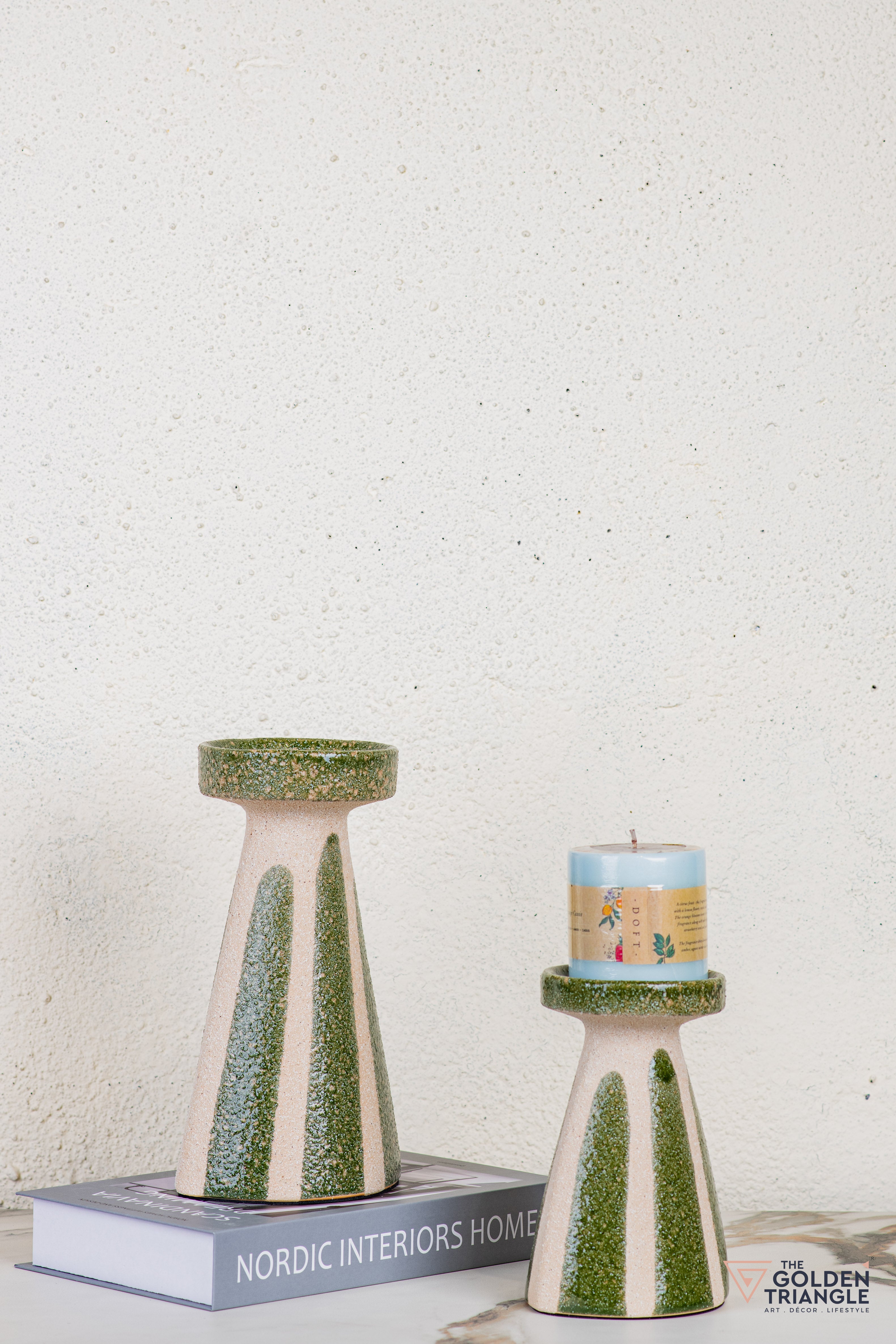 These handcrafted ceramic candle stands blend charm with creativity—featuring an off-white glaze, subtle line details, and whimsical sculpted accents on the sides. With their sculptural yet functional design, they make a delightful addition to consoles, coffee tables, or dining settings. Place pillar candles to add a warm, inviting glow or simply display them as standalone art objects. Their modern yet earthy feel makes them perfect for contemporary homes and stylish workspaces alike.