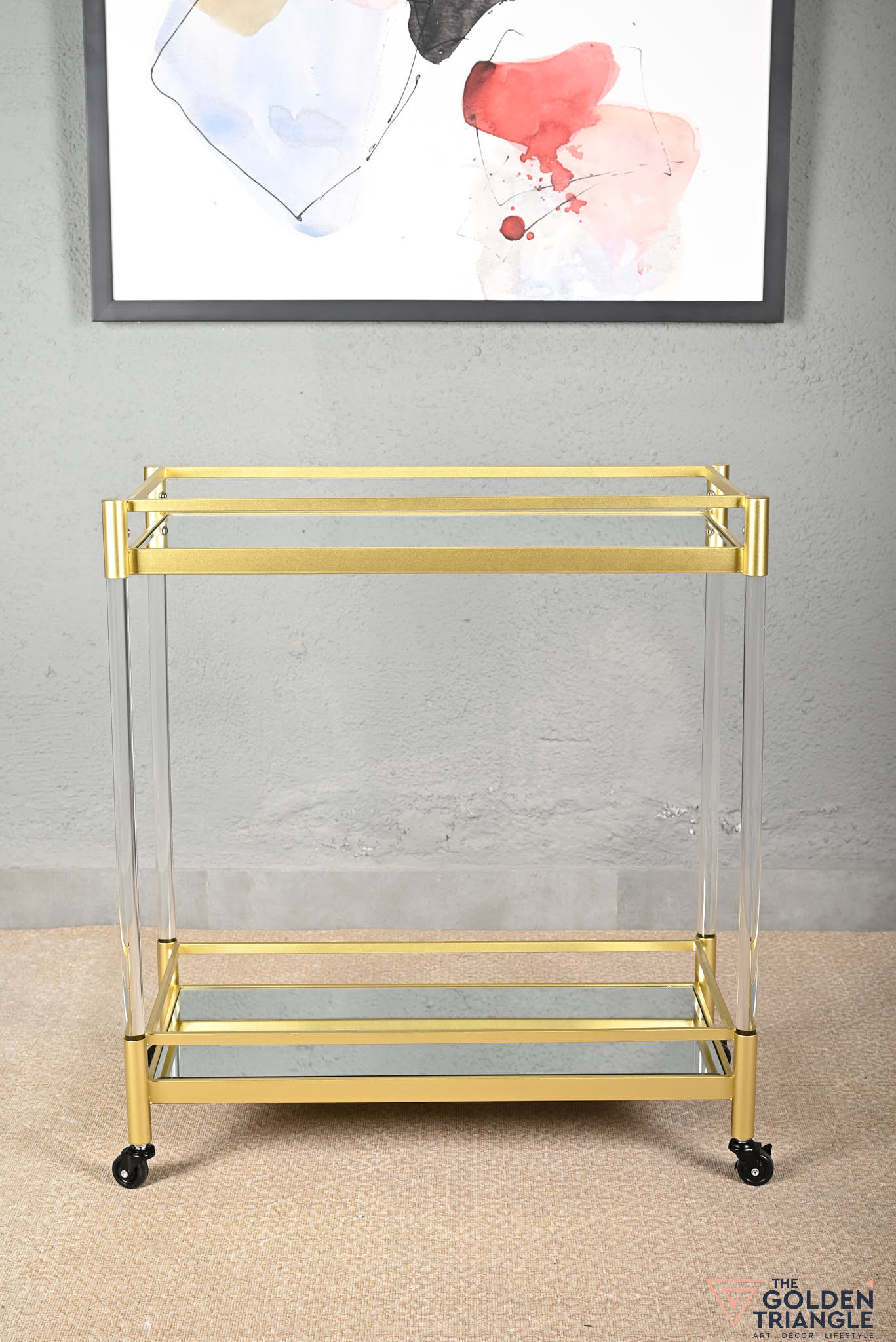 Elevate your home bar experience with our stylish bar trolleys. Explore a diverse range of modern designs ensuring the perfect match for your home décor. Offering functionality with ample storage for bottles and bar tools while maintaining mobility with convenient wheels. Upgrade your entertaining game today with a bar trolley where style meets functionality. Perfect for hosting parties when your friends or family visit. lightweight and sturdy design. With a handle and a Metal and Acrylic body with Mirror Base, You can use it as an extra storage or just to move things like plates, glassware, cutlery kitchen accessories, all in one trip.