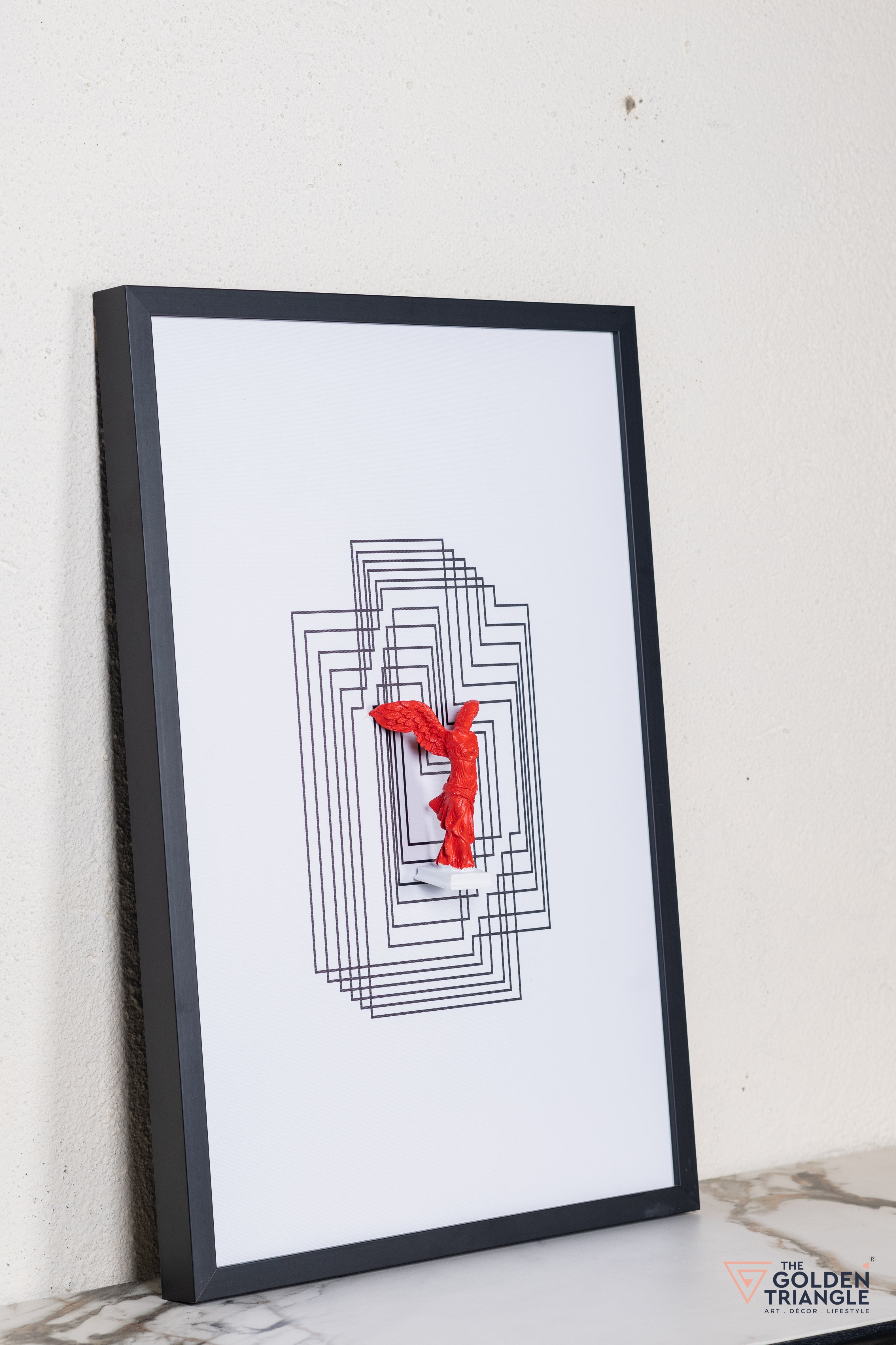 - Abstract Design : The bust is framed within a layered white mount that adds visual depth and texture. Set against a bold backdrop that enhances the minimal white detailing