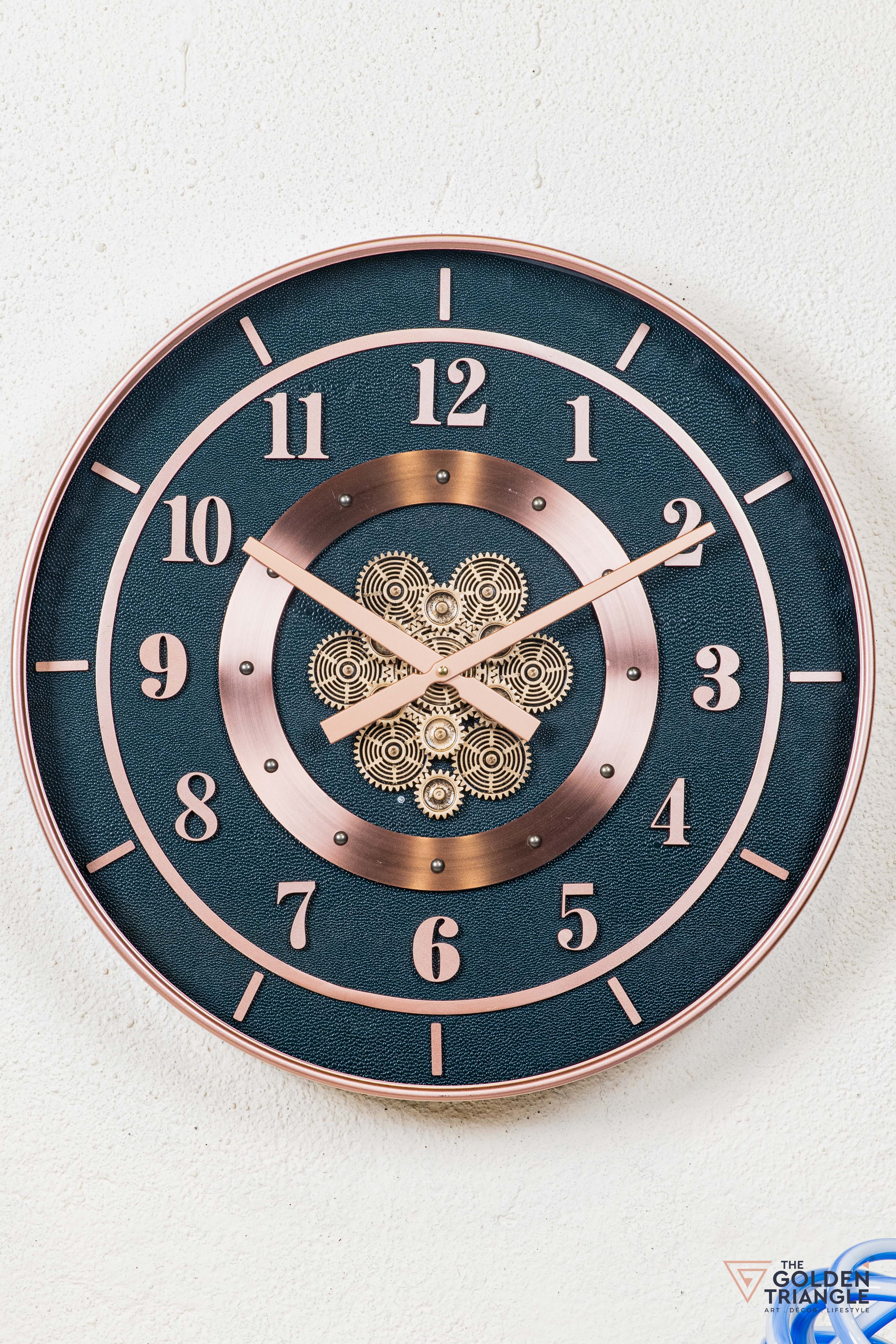 The vintage wall clock features a striking design with a visible moving gear mechanism, evoking a classic industrial charm. Encased in a sleek round frame with Roman numerals, its metallic accents and intricate detailing make it both a functional timepiece and a stunning decor statement.