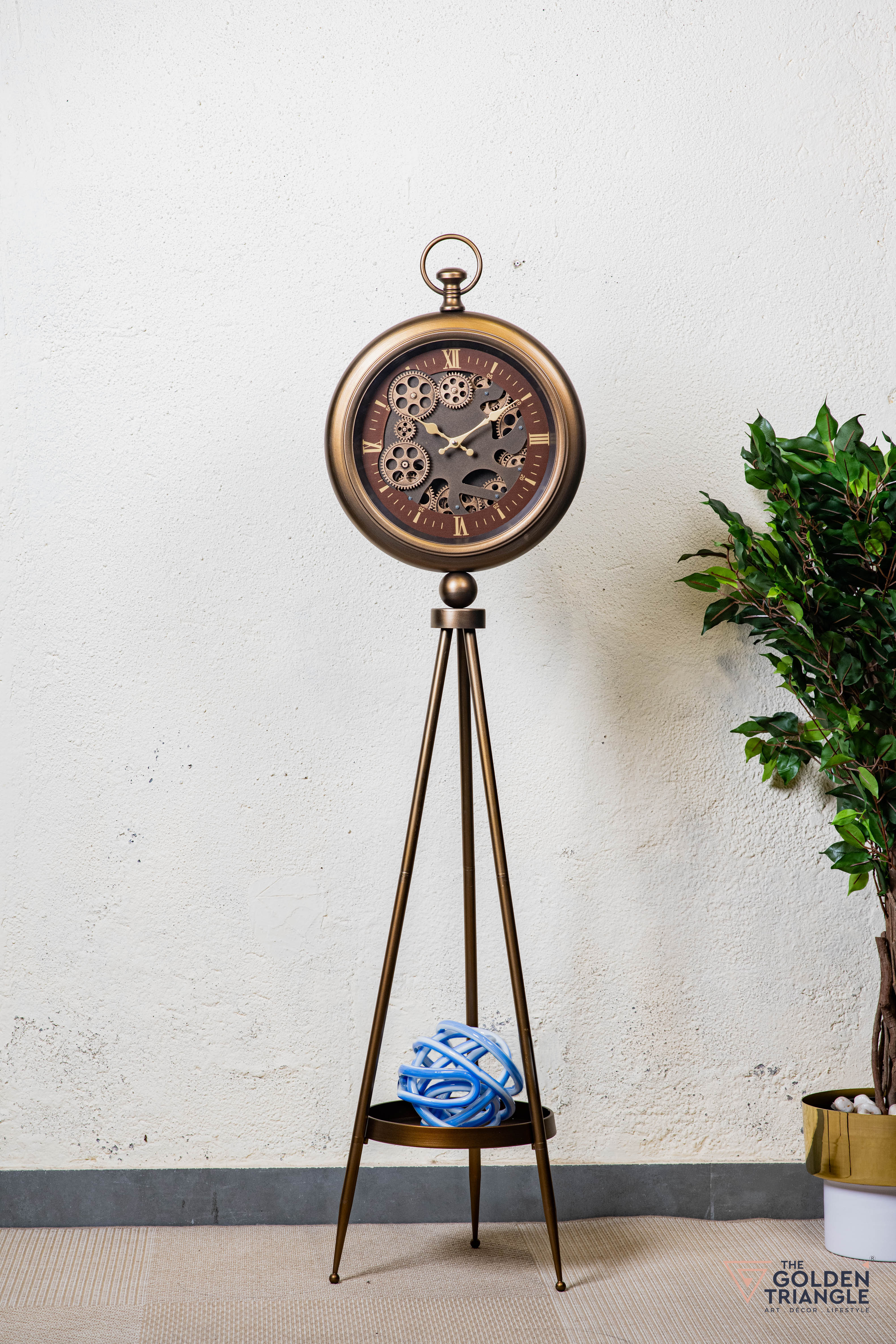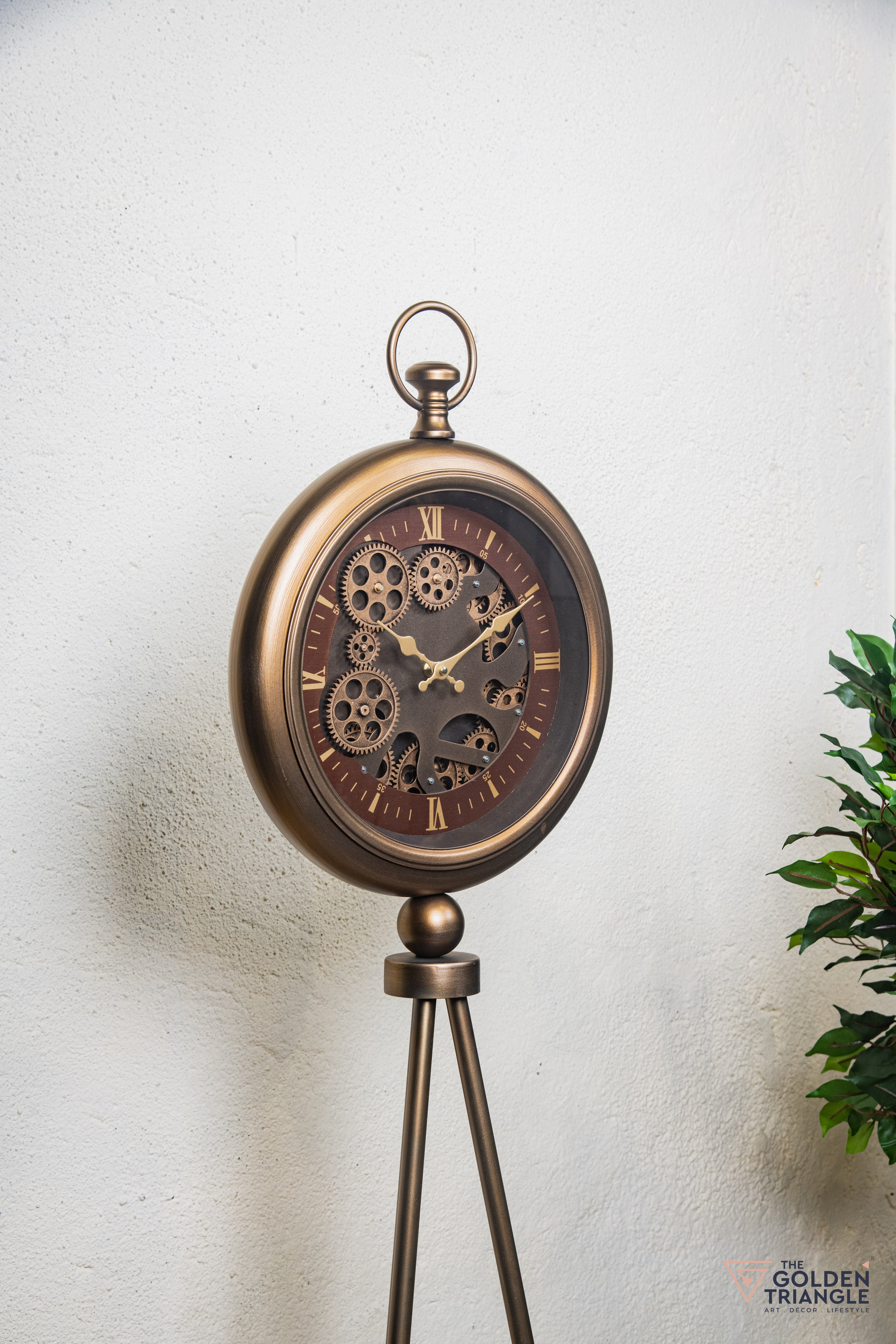 The vintage table clock features a striking design with a visible moving gear mechanism, evoking a classic industrial charm. Encased in a sleek round frame with Roman numerals, its metallic accents and intricate detailing make it both a functional timepiece and a stunning decor statement.