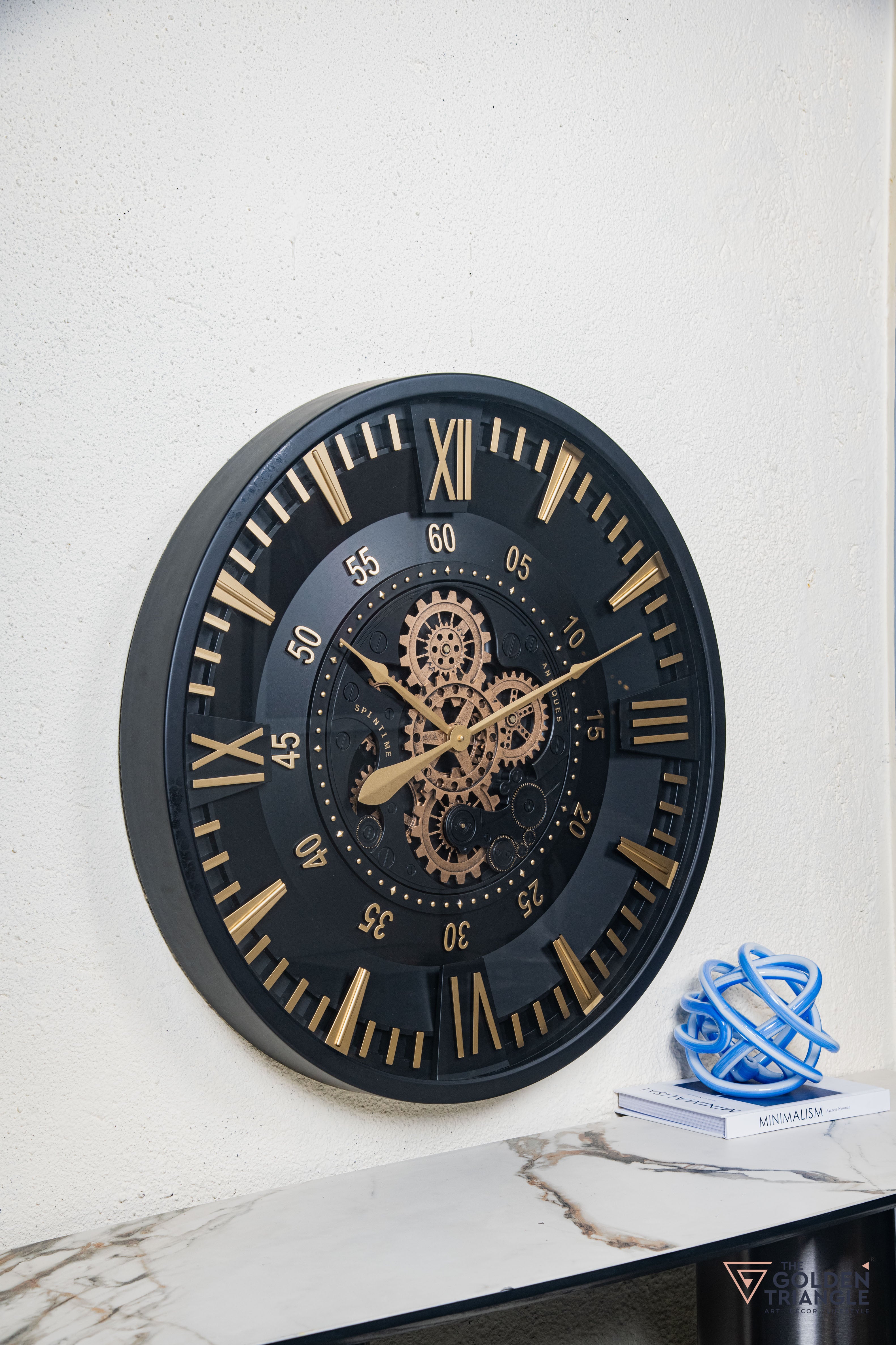 The vintage wall clock features a striking design with a visible moving gear mechanism, evoking a classic industrial charm. Encased in a sleek round frame with Roman numerals, its metallic accents and intricate detailing make it both a functional timepiece and a stunning decor statement.