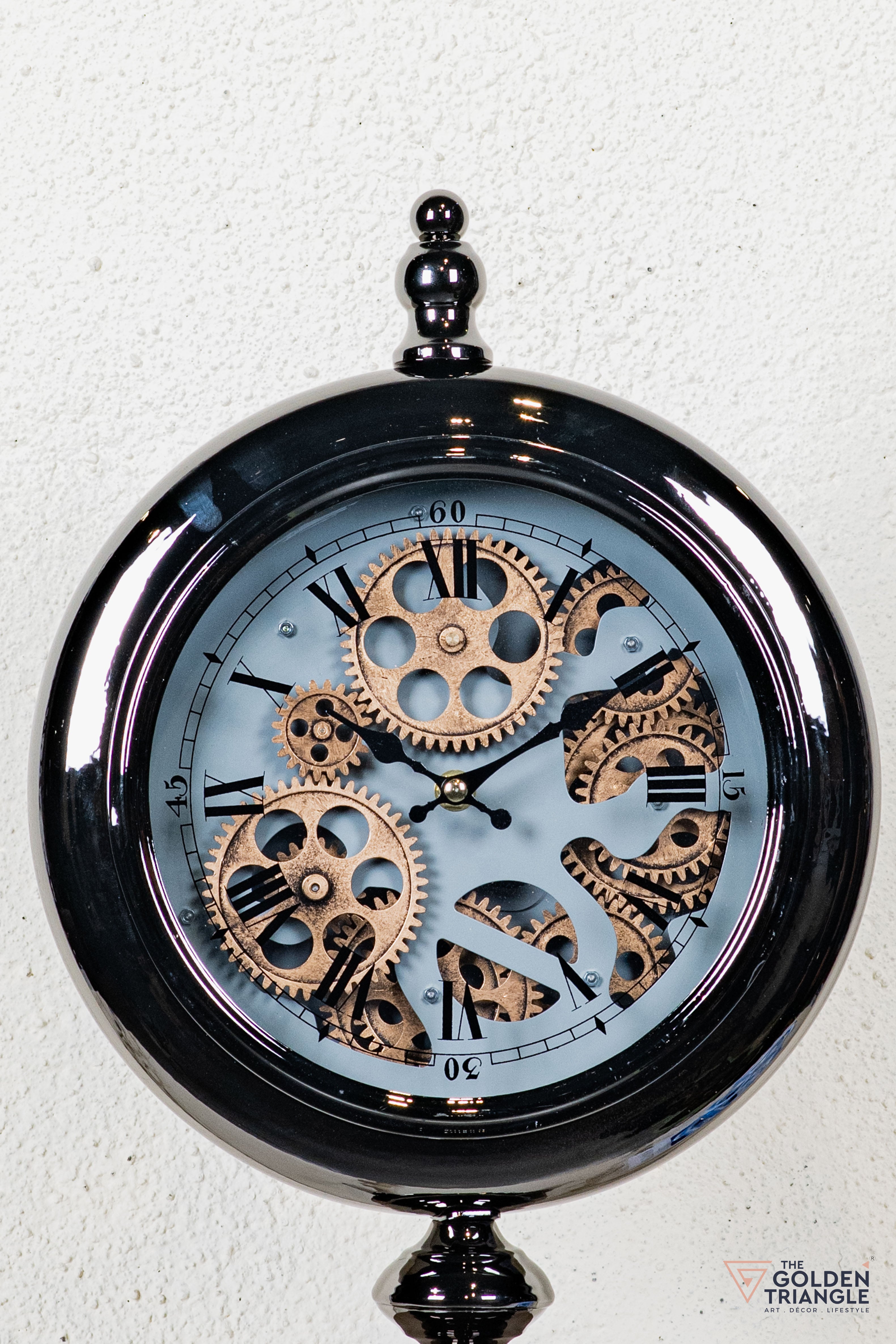 The vintage table clock features a striking design with a visible moving gear mechanism, evoking a classic industrial charm. Encased in a sleek round frame with Roman numerals, its metallic accents and intricate detailing make it both a functional timepiece and a stunning decor statement.