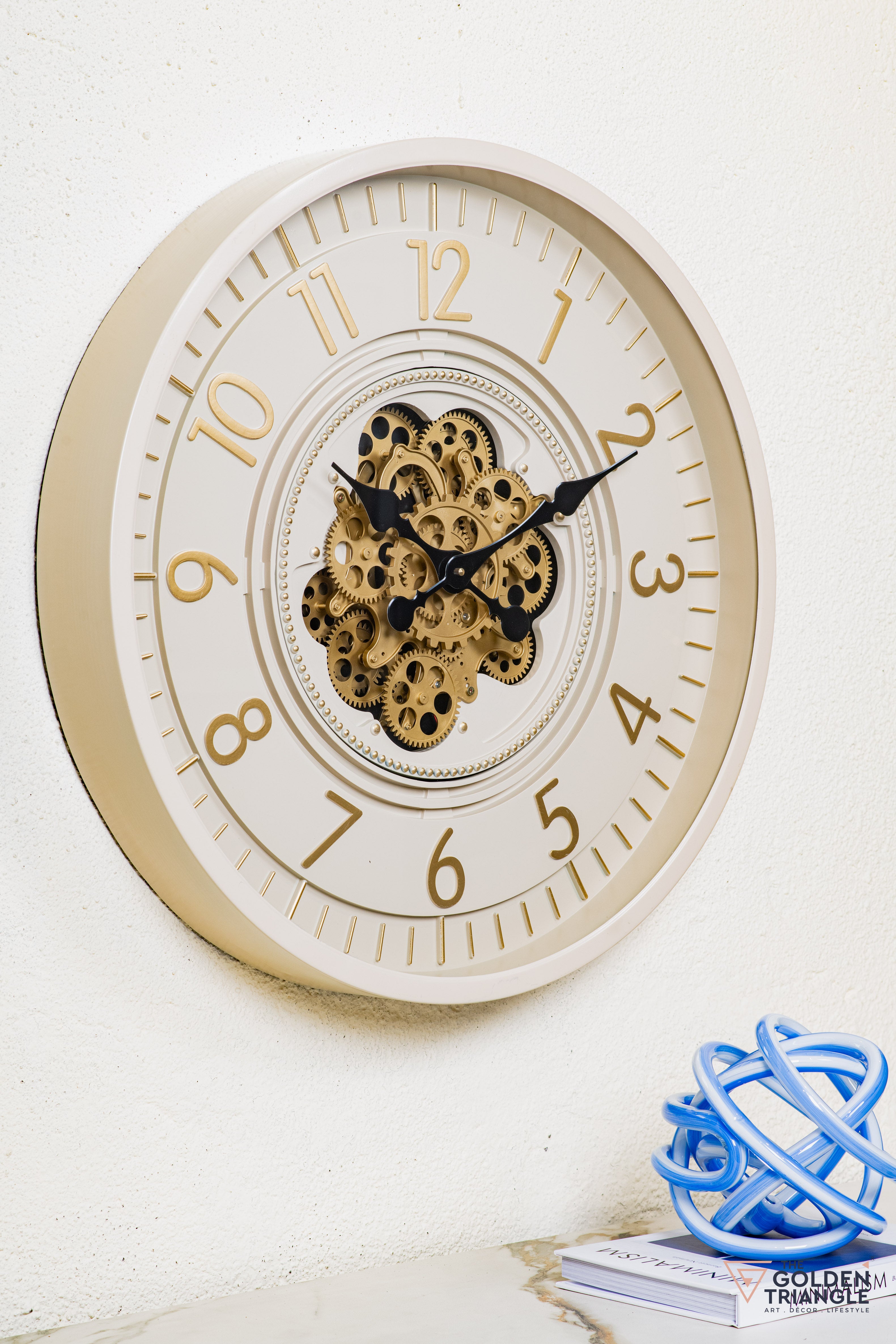 The vintage wall clock features a striking design with a visible moving gear mechanism, evoking a classic industrial charm. Encased in a sleek round frame with Roman numerals, its metallic accents and intricate detailing make it both a functional timepiece and a stunning decor statement.