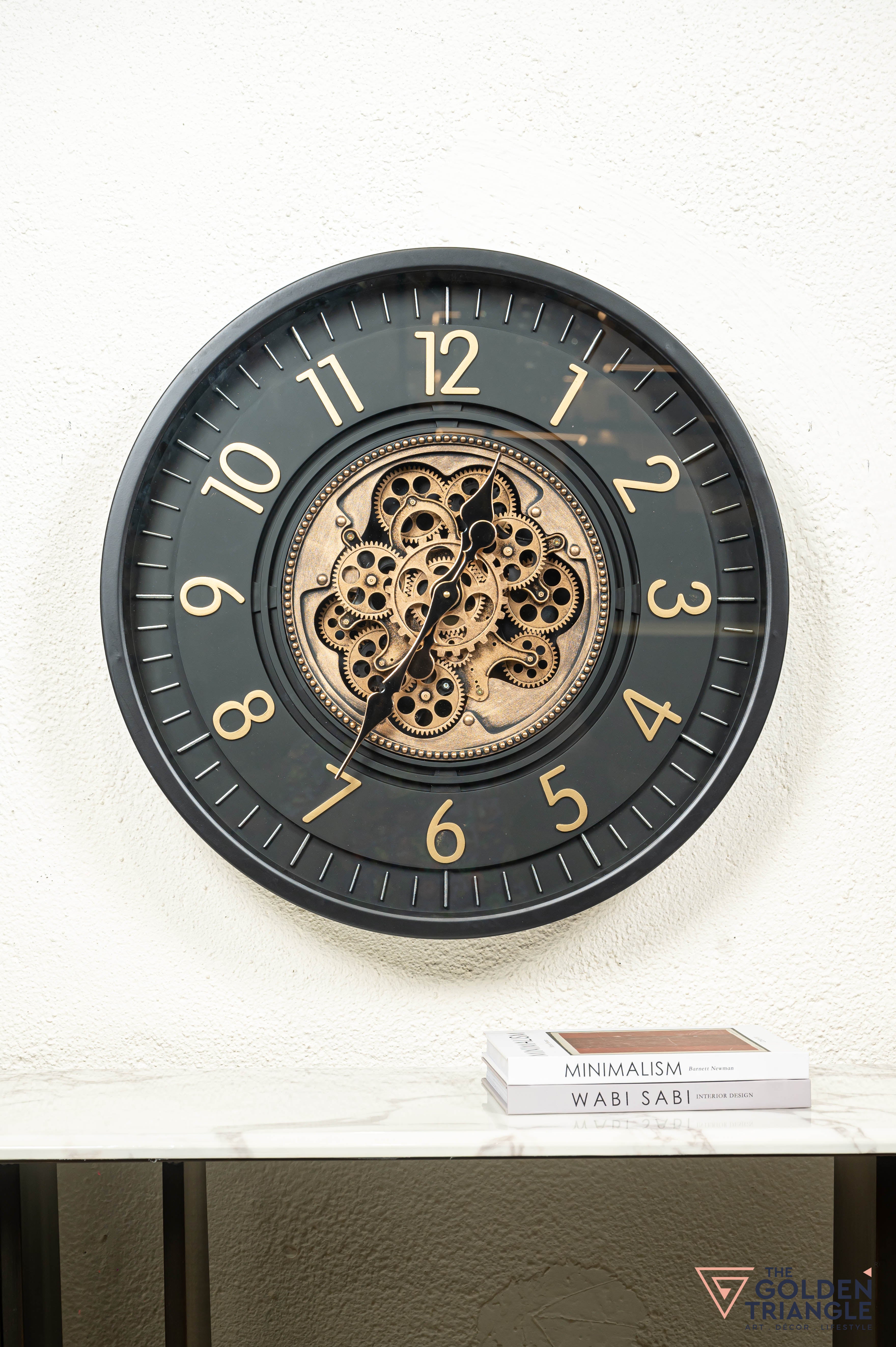 This vintage wall clock exudes industrial elegance with its intricate moving gear mechanism visible at its center. Featuring a round metallic frame, the clock boasts a cream face with bold numerals and delicate black hands. The exposed gears not only add a dynamic element but also enhance its old-world charm, making it a stunning centerpiece for any wall.