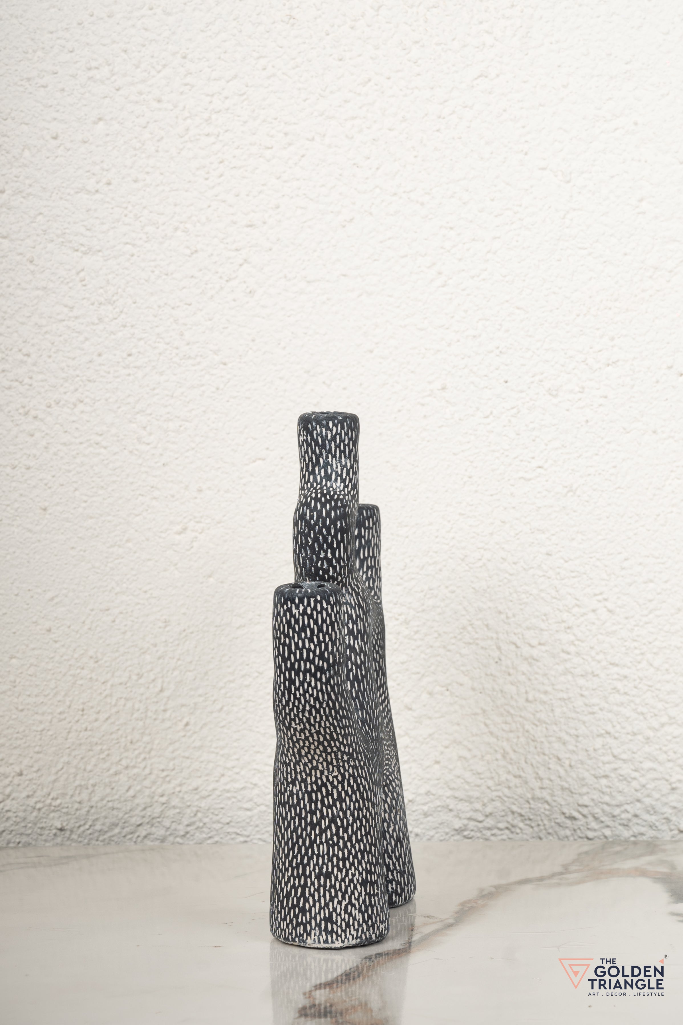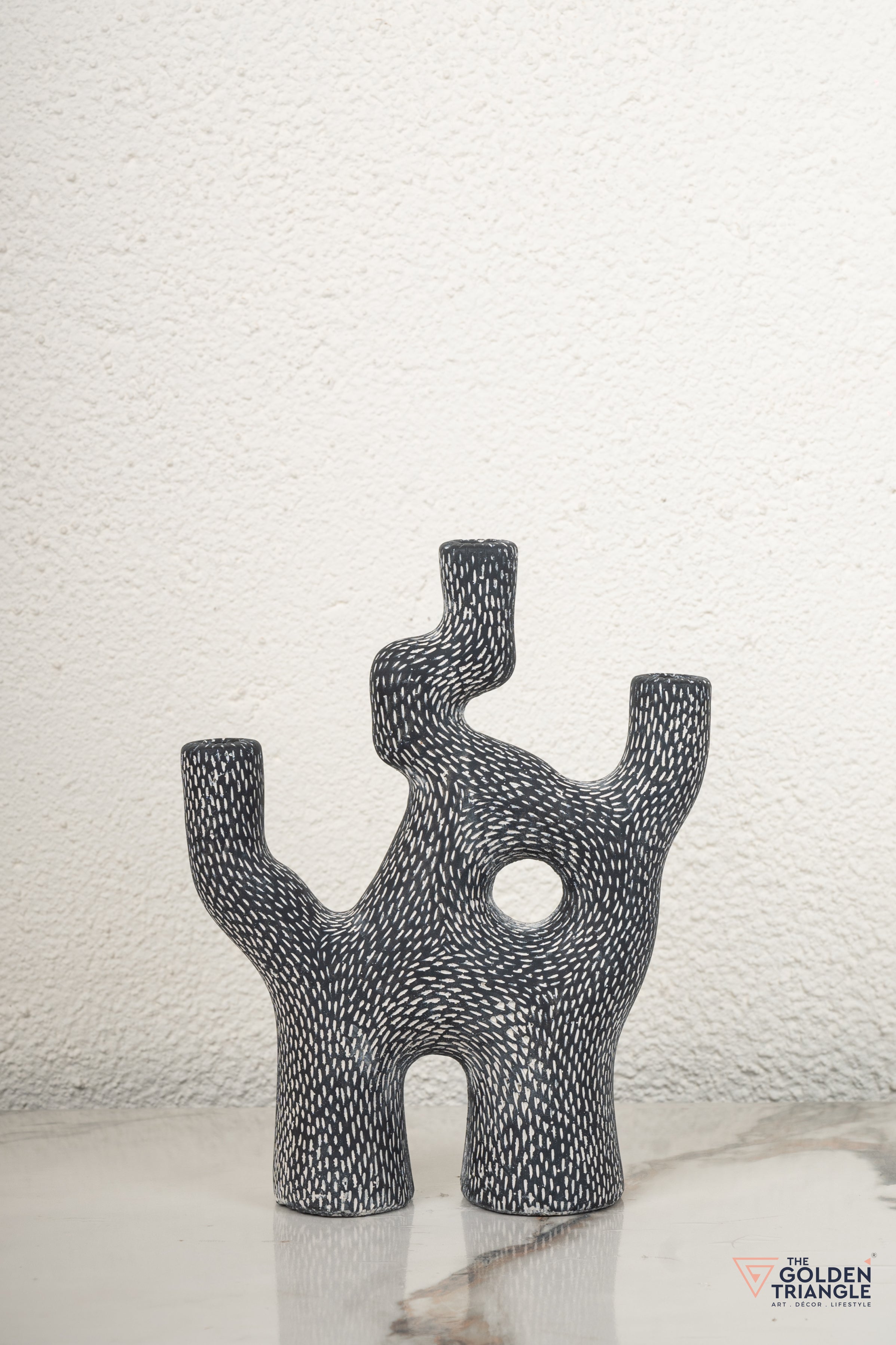 The abstract sculpture is a captivating piece of modern art that combines form and function. Its unique, geometric design features four interconnected shapes that create a sense of balance and harmony. The sculpture's sleek black finish adds a touch of sophistication and elegance, while its compact size makes it suitable for a variety of settings. The sculpture is perfect for showcasing on a coffee table, mantelpiece, or bookshelf. It can also be used as a candlestand or centerpiece for a dining table or as a decorative accent in a bedroom or office. The sculpture's versatility makes it a valuable addition to any home decor collection.