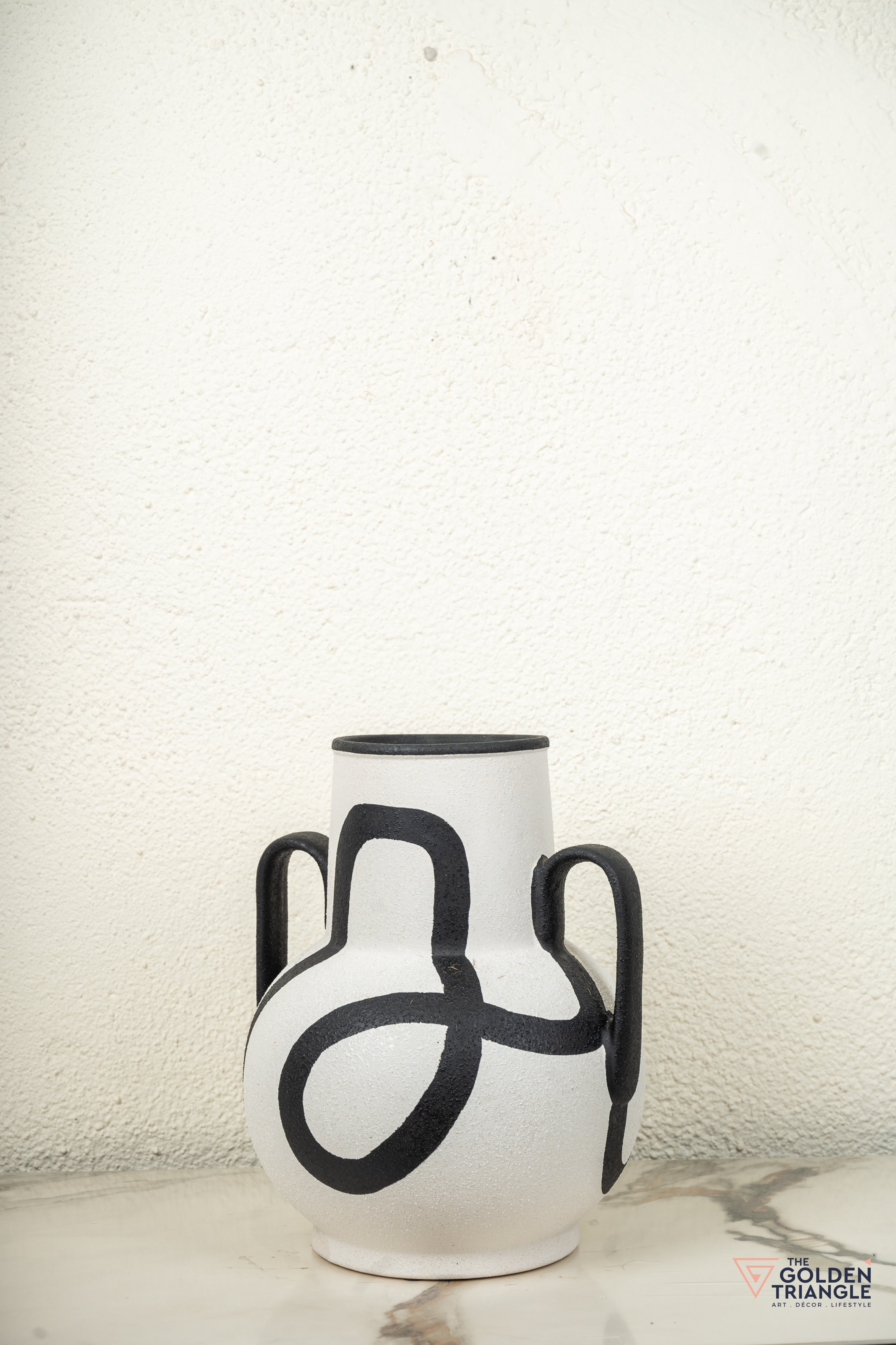 The ceramic vase is a modern and minimalist piece that combines form and function. Its clean, white body provides a striking contrast to the bold black abstract design that adorns its surface. The design features flowing lines and curves that create a sense of movement and dynamism. The vase's two handles add a touch of practicality and make it easy to carry and display. The vase is perfect for showcasing fresh flowers or greenery, or it can be displayed as a standalone decorative object. Its versatility makes it suitable for a variety of interior styles, from contemporary to traditional.