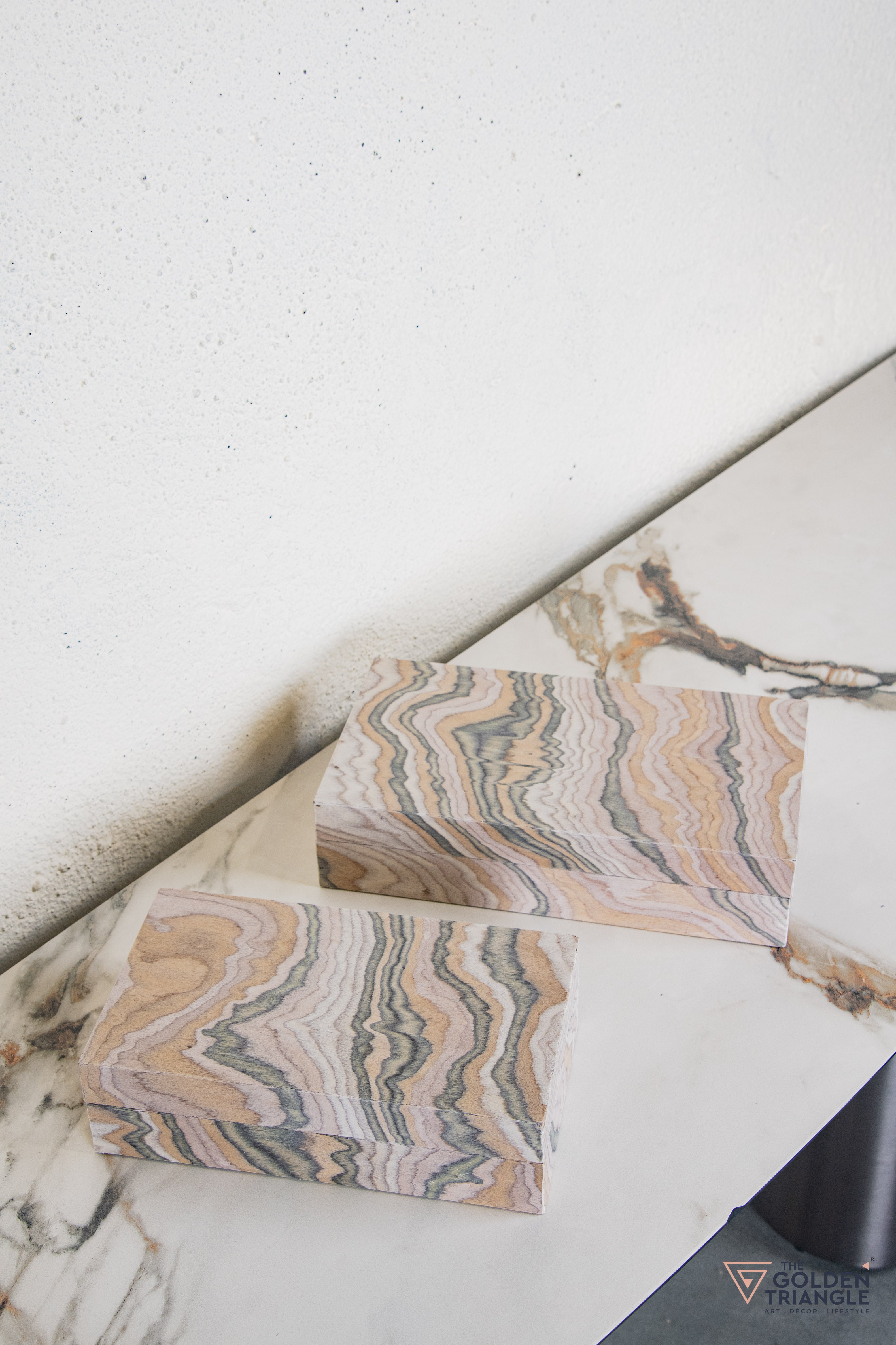 Elevate your home decor with this stylish geometric storage boxes. Crafted from high-quality MDF these boxes feature a captivating black and white pattern. Perfect for storing jewellery, keepsakes, or other small items, this versatile set adds a touch of sophistication to any room. Display them together or separately to create a stunning centerpiece.