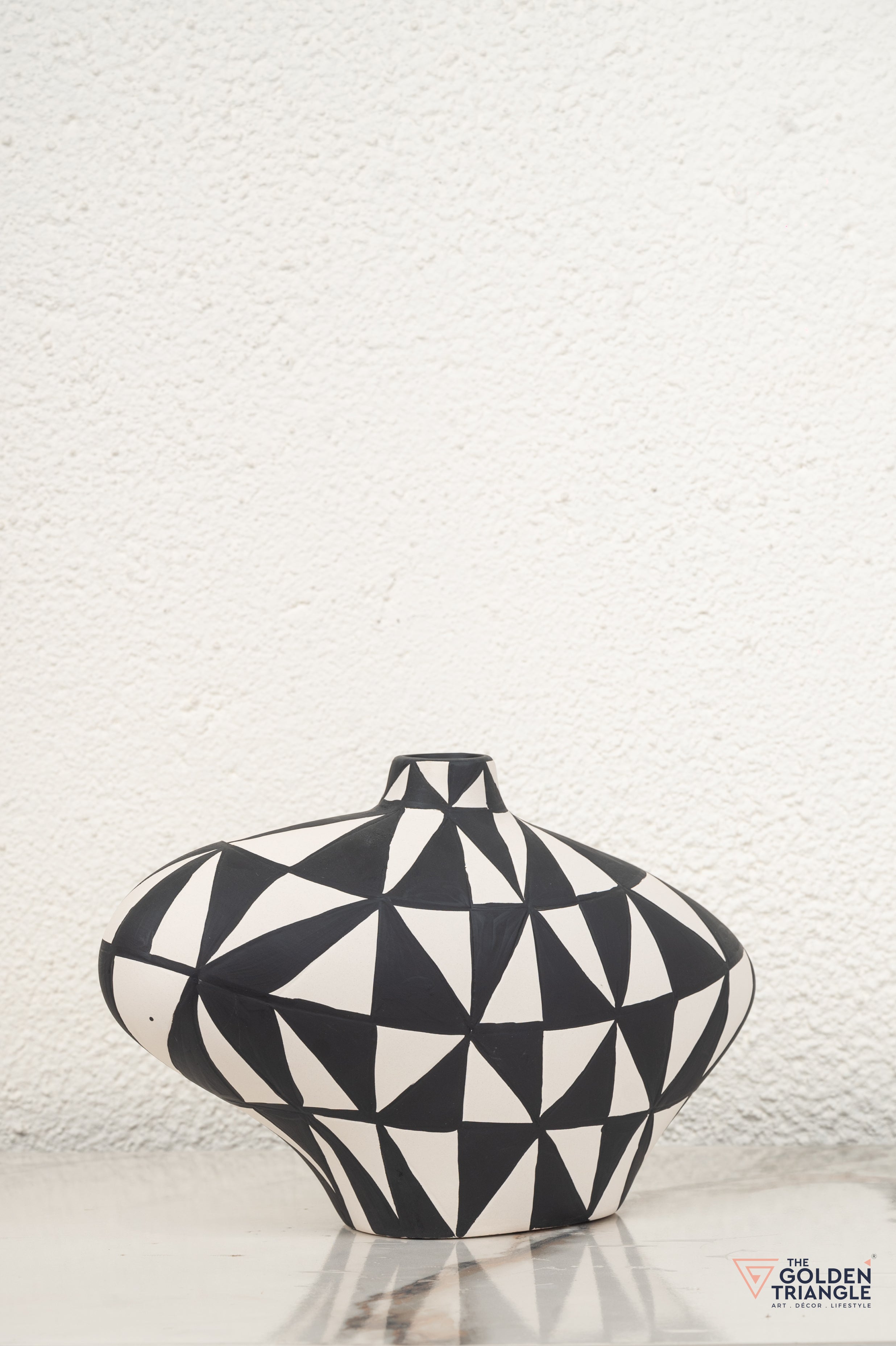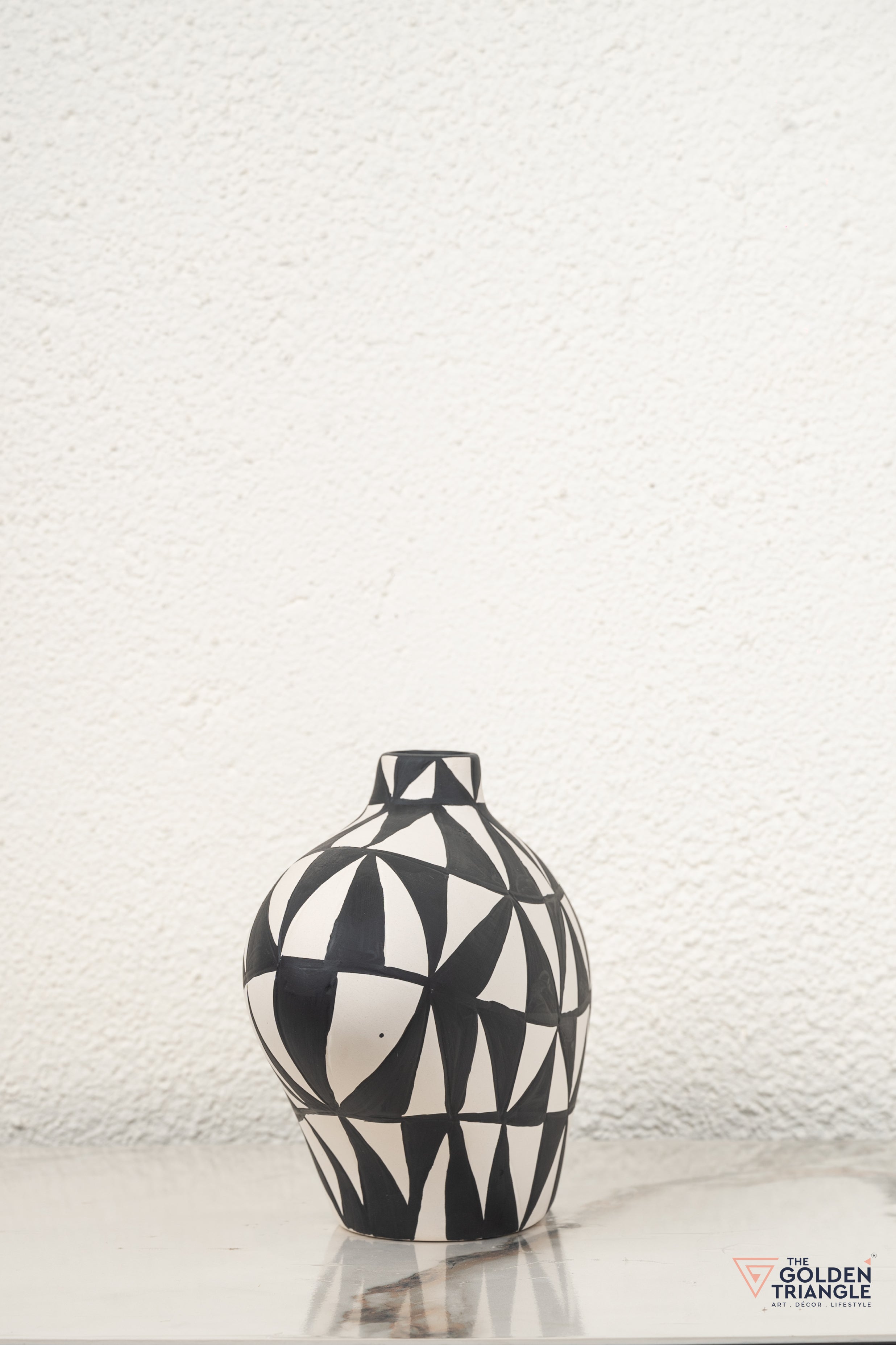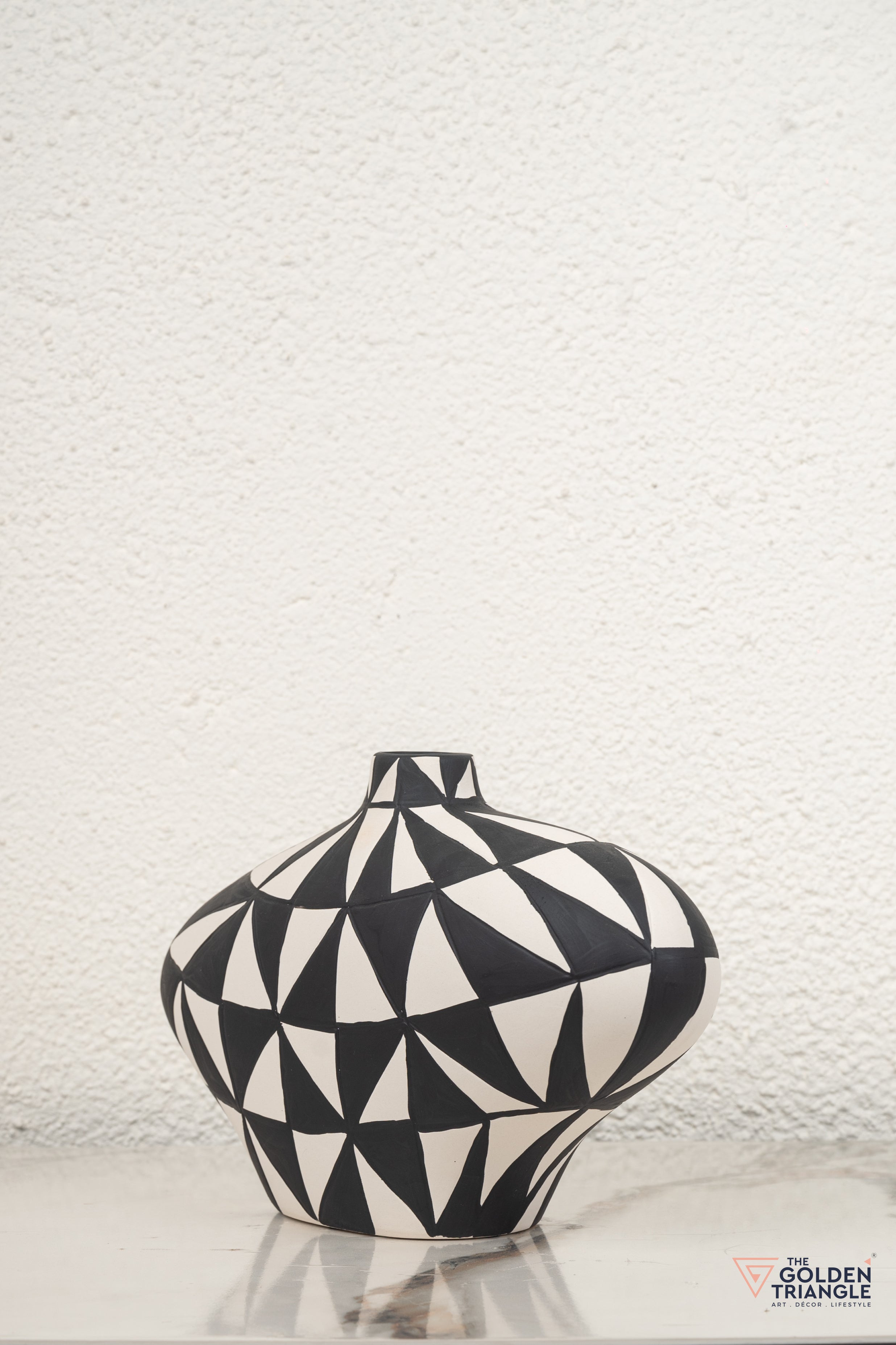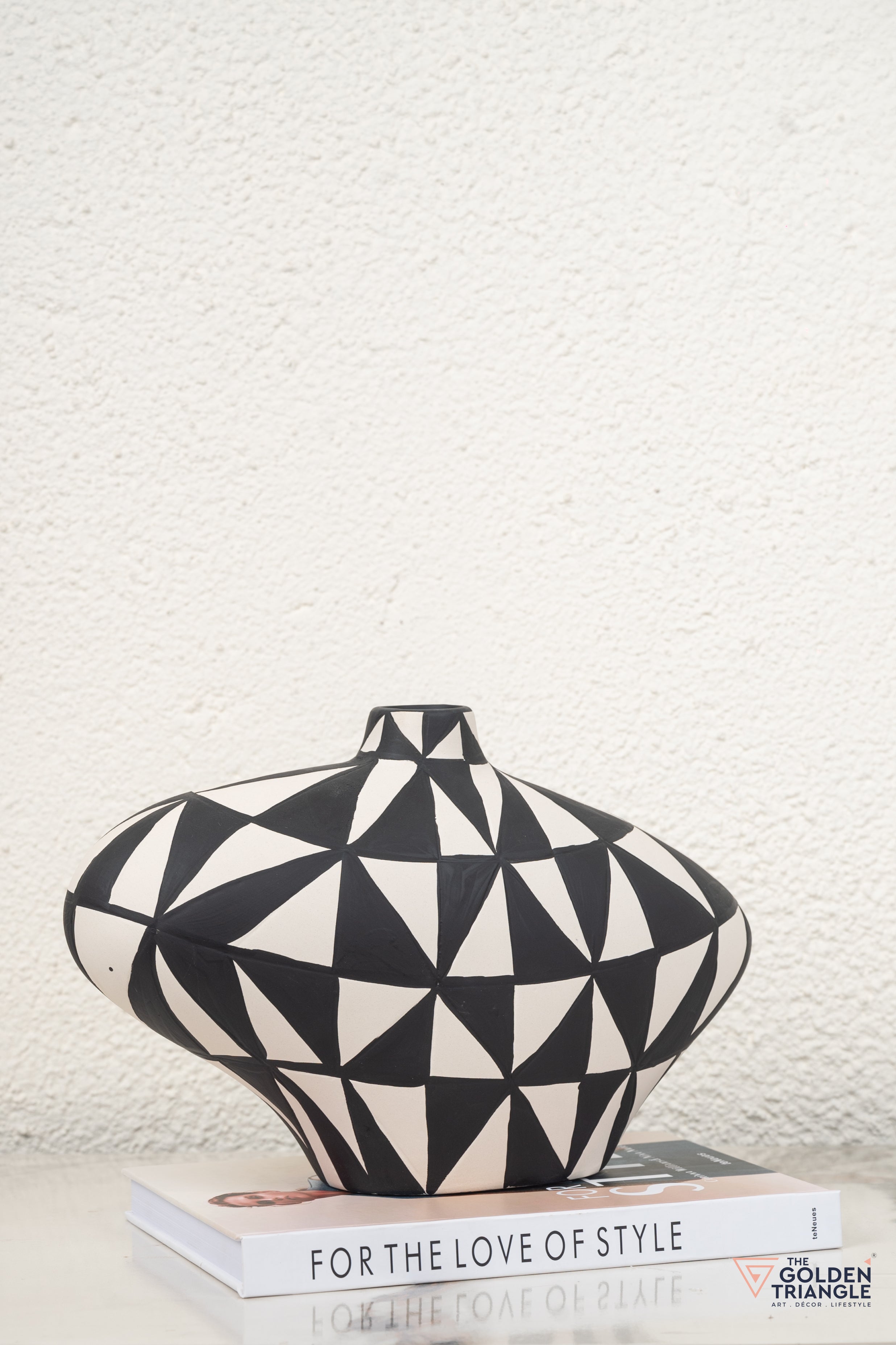Make a bold statement with this striking Prism Ceramic Vase. Its intricate black and white geometric pattern adds a touch of modern elegance to any room. Crafted from high quality ceramic, this unique piece is perfect for displaying fresh flowers or as a standalone decorative object. A must have home decor enthusiasts seeking a visually captivating centrepiece.